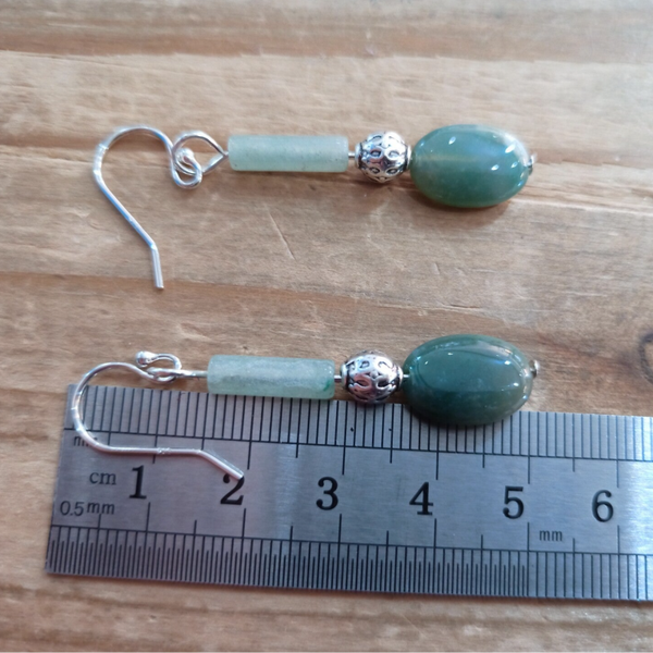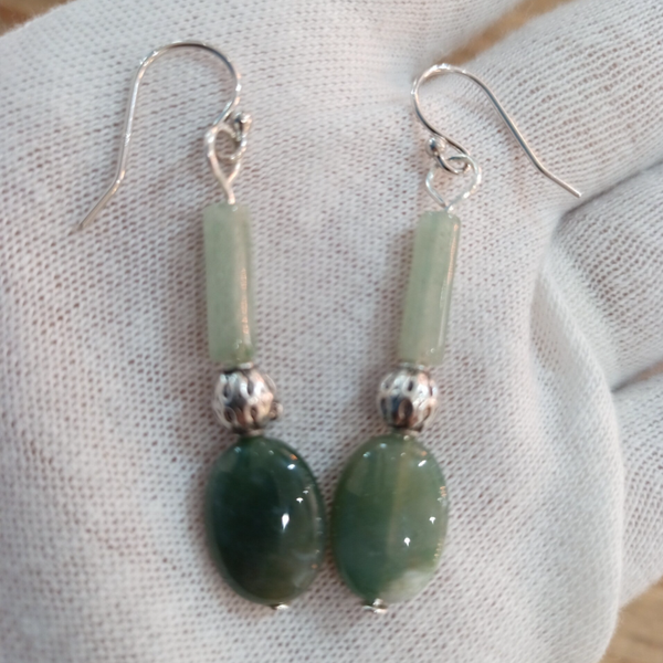 Boucles d'oreilles composées de perles ovales en Agate, tube en Aventurine verte, entretoises en argent tibétain, tiges métal argenté et crochets d'oreilles en Argent 925/1000.