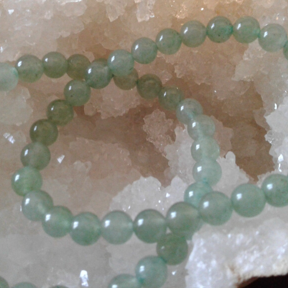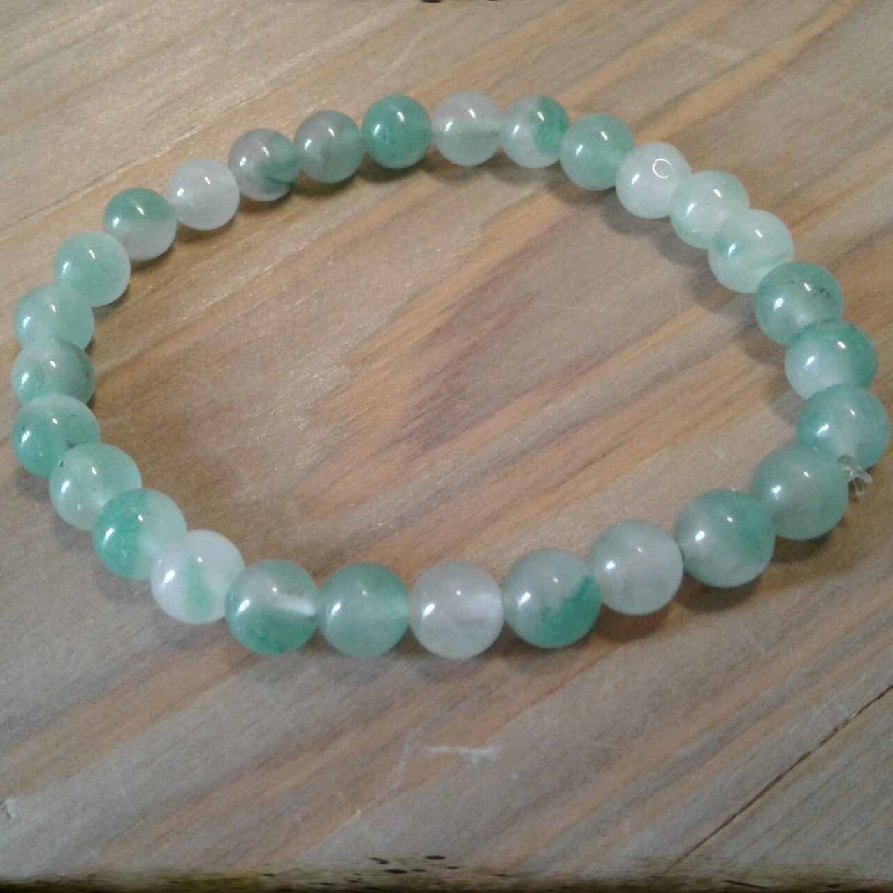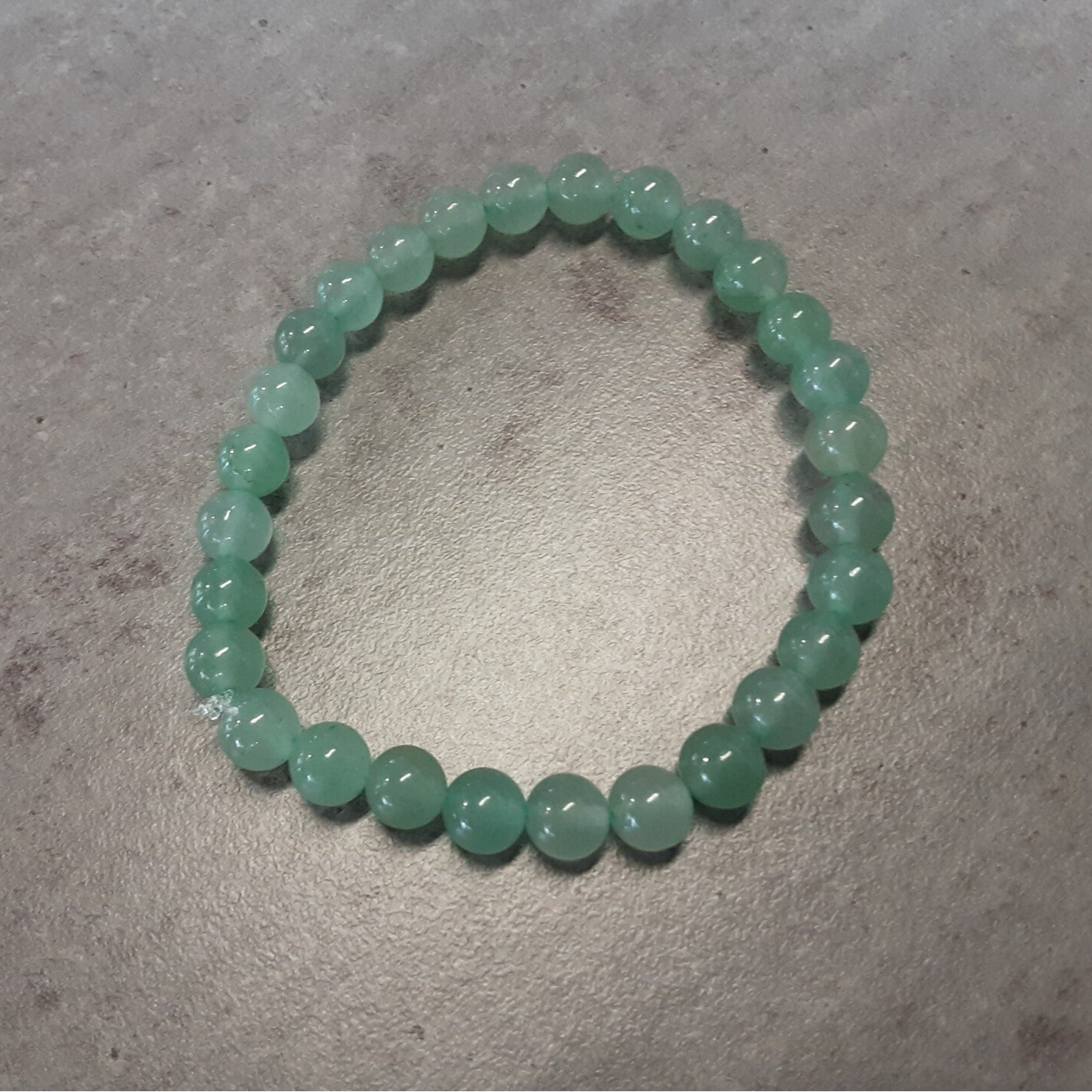Création artisanale par "Bijoux Que Gemmes". Bracelet extensible composé de perles rondes de diamètre 6 mm en Aventurine verte et fil extensible transparent de diamètre 0,6 mm.