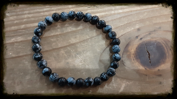 Bracelet monté sur fil silicone extensible, perles diamètre 6 mm, fil diamètre 0,6 mm en perles d'obsidienne flocons de neige ou obsidienne mouchetée naturelle.