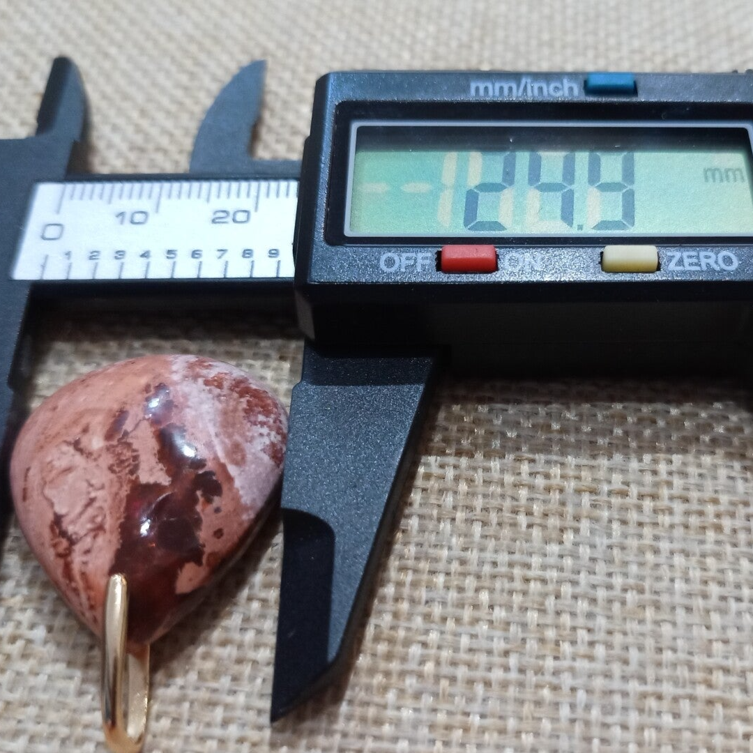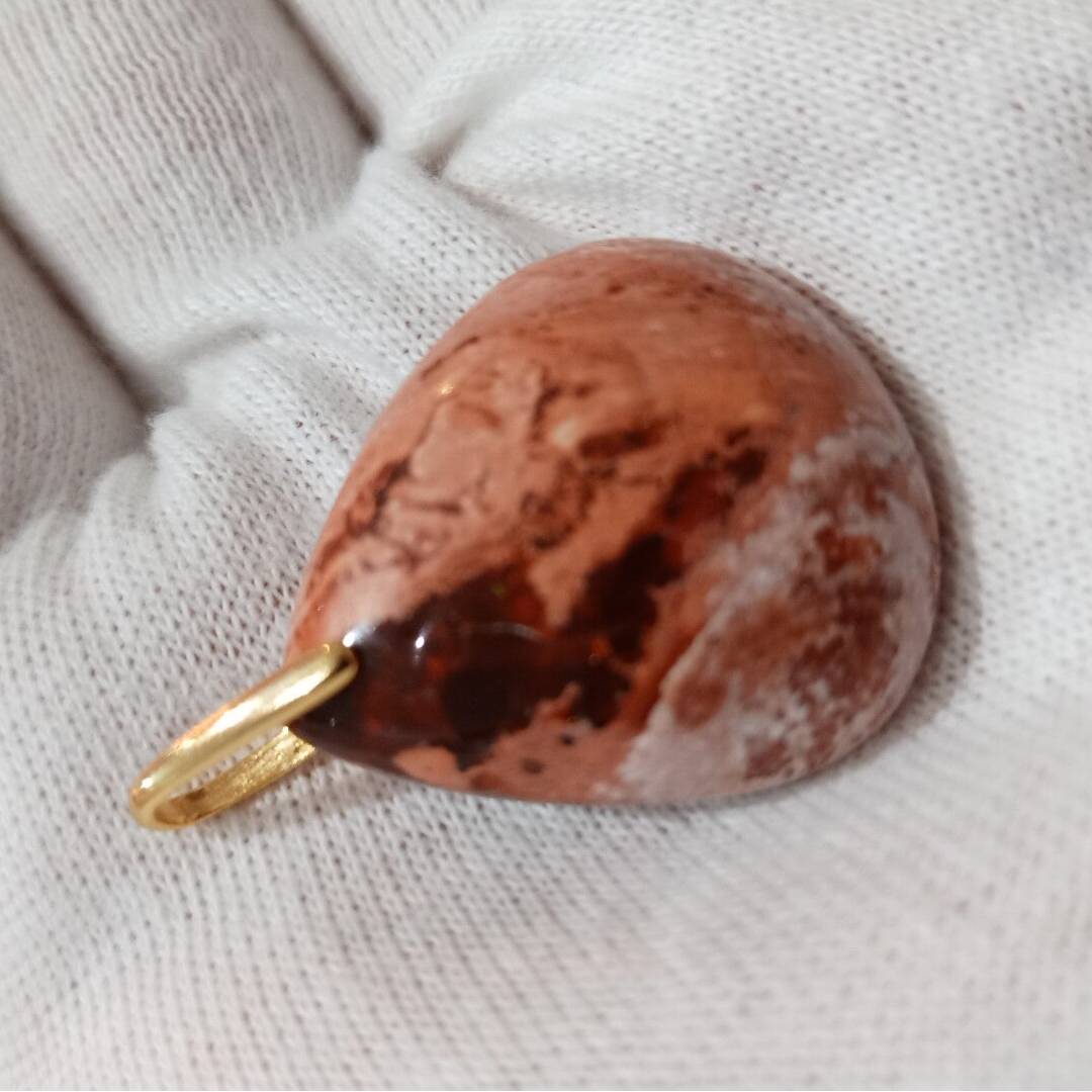 Pendentif en Opale de feu et Vermeil (Plaqué Or sur Argent 925/1000). Il est composé d'un cabochon de forme goutte en Oppale de Feu du Mexique et d'une bélière en Plaqué Or sur Argent 925/1000 (Vermeil).