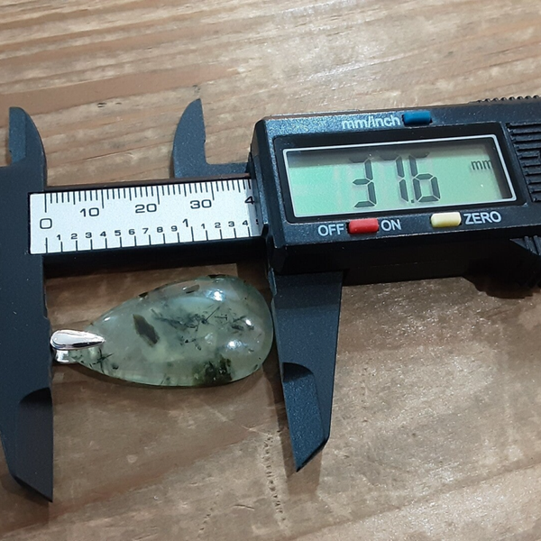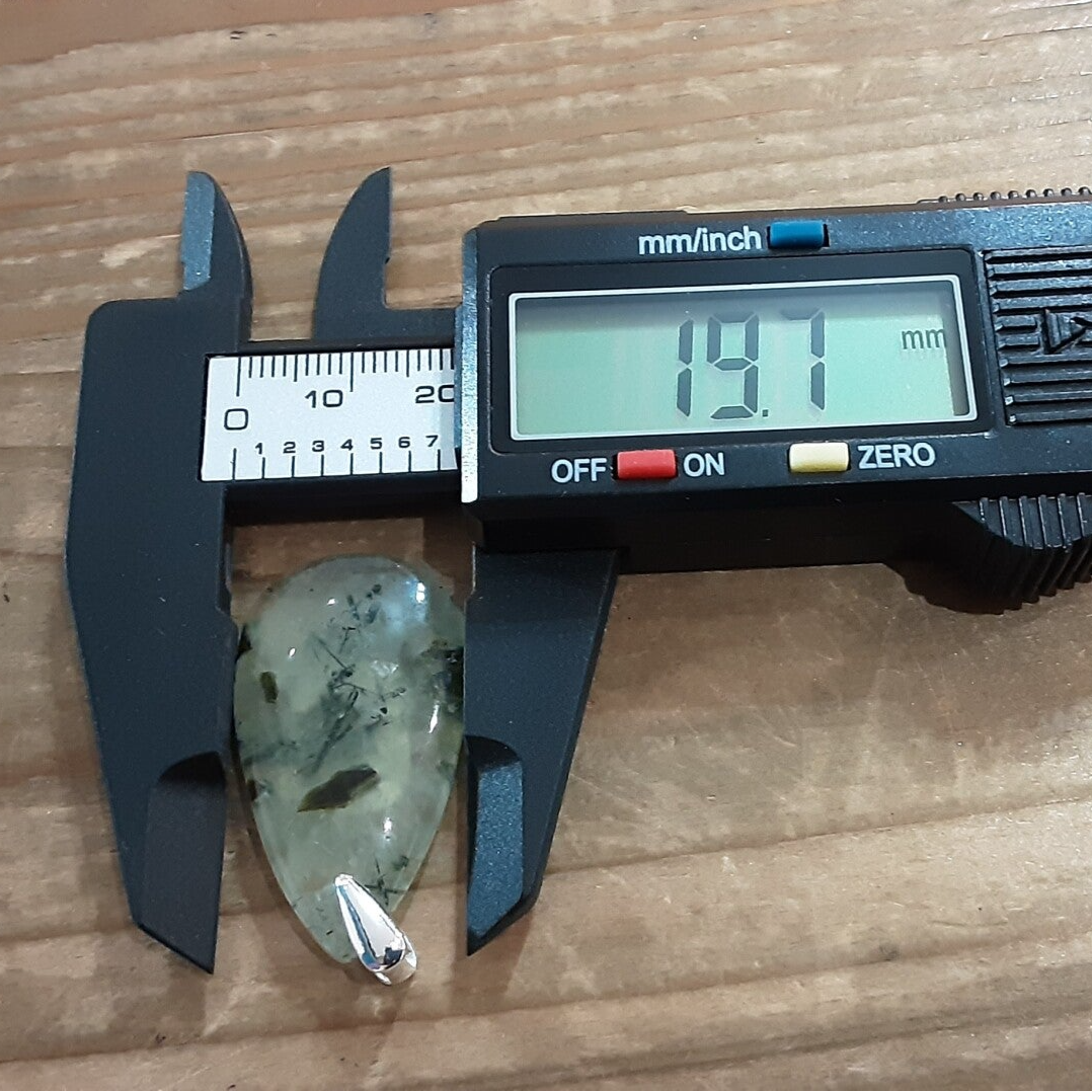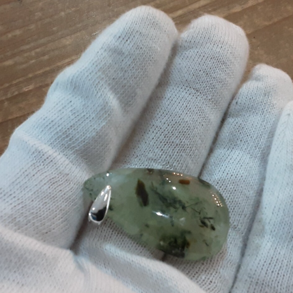 Pendentif en Préhnite et Argent 925/1000. Il est composé d'un cabochon de forme goutte en Préhnite et d'une bélière en Argent 925/1000.