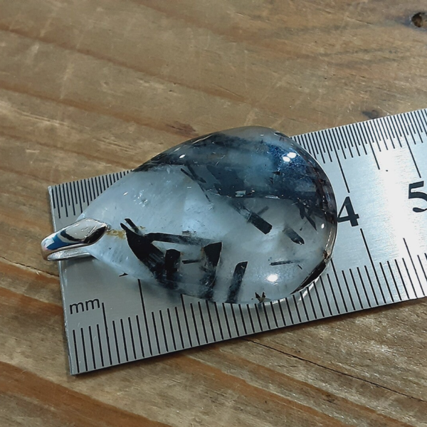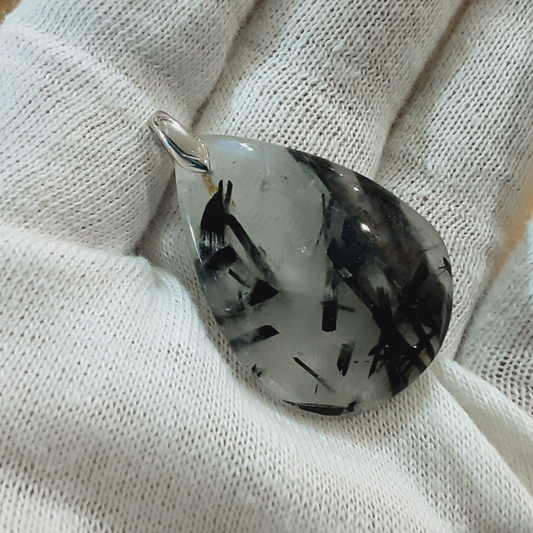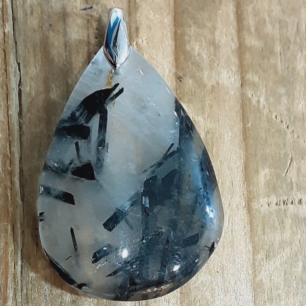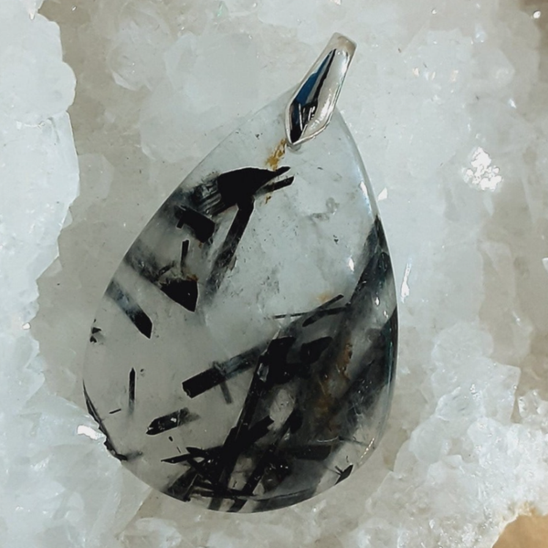 Pendentif en Quartz tourmaliné et Argent 925/1000. Il est composé d’un cabochon de forme goutte en Quartz tourmaliné et d’une bélière en Argent 925/1000.