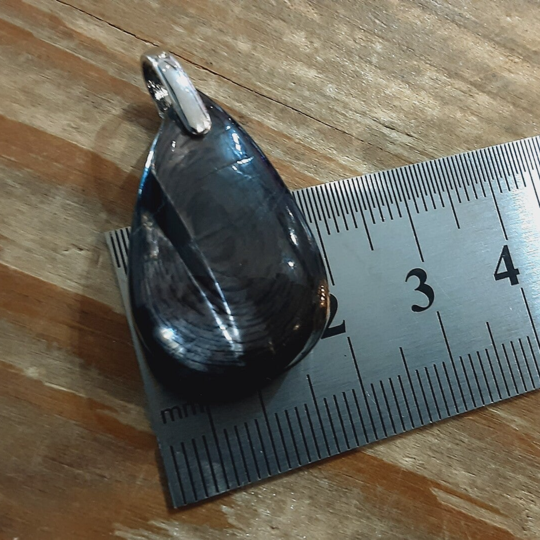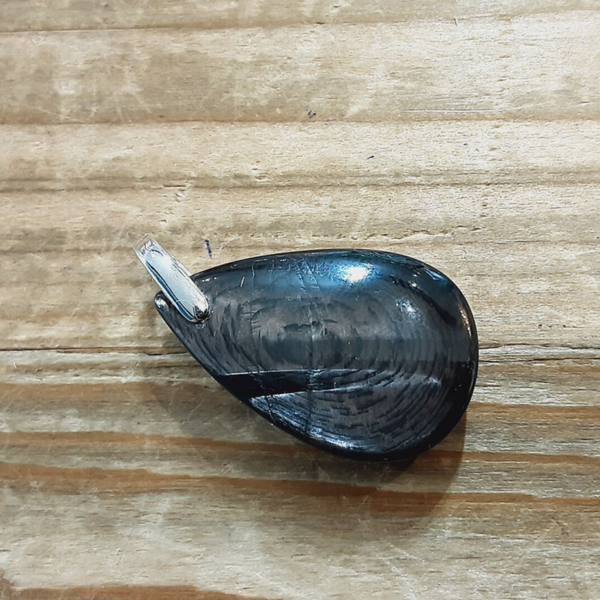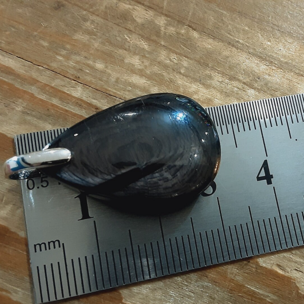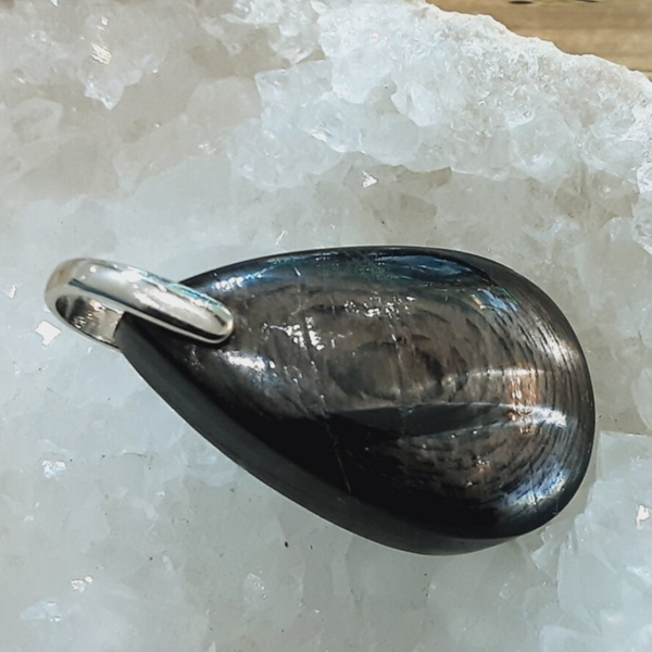 Pendentif en Hypersthène et Argent 925/1000. Il est composé d’un cabochon de forme goutte en Hypersthène et d’une bélière en Argent 925/1000.
