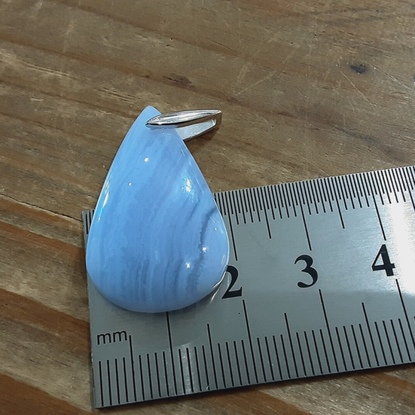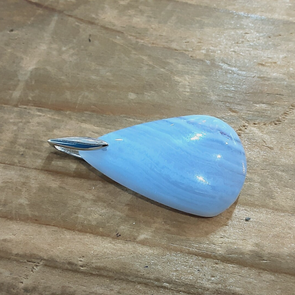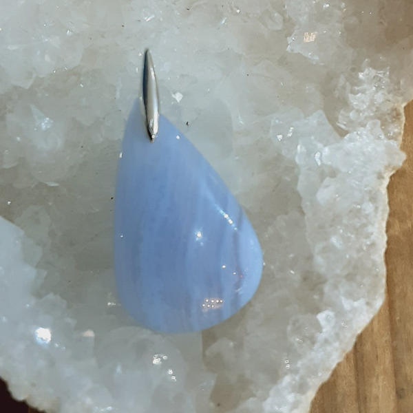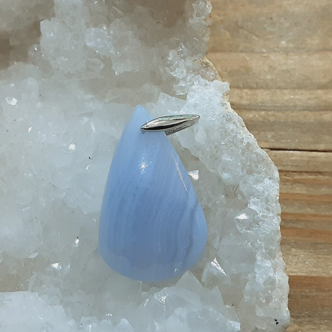 Pendentif en Calcédoine bleue et Argent 925/1000. Il est composé d'un cabochon de forme goutte en Calcédoine bleue ou Agate bleue dentelle et d'une bélière en Argent 925.