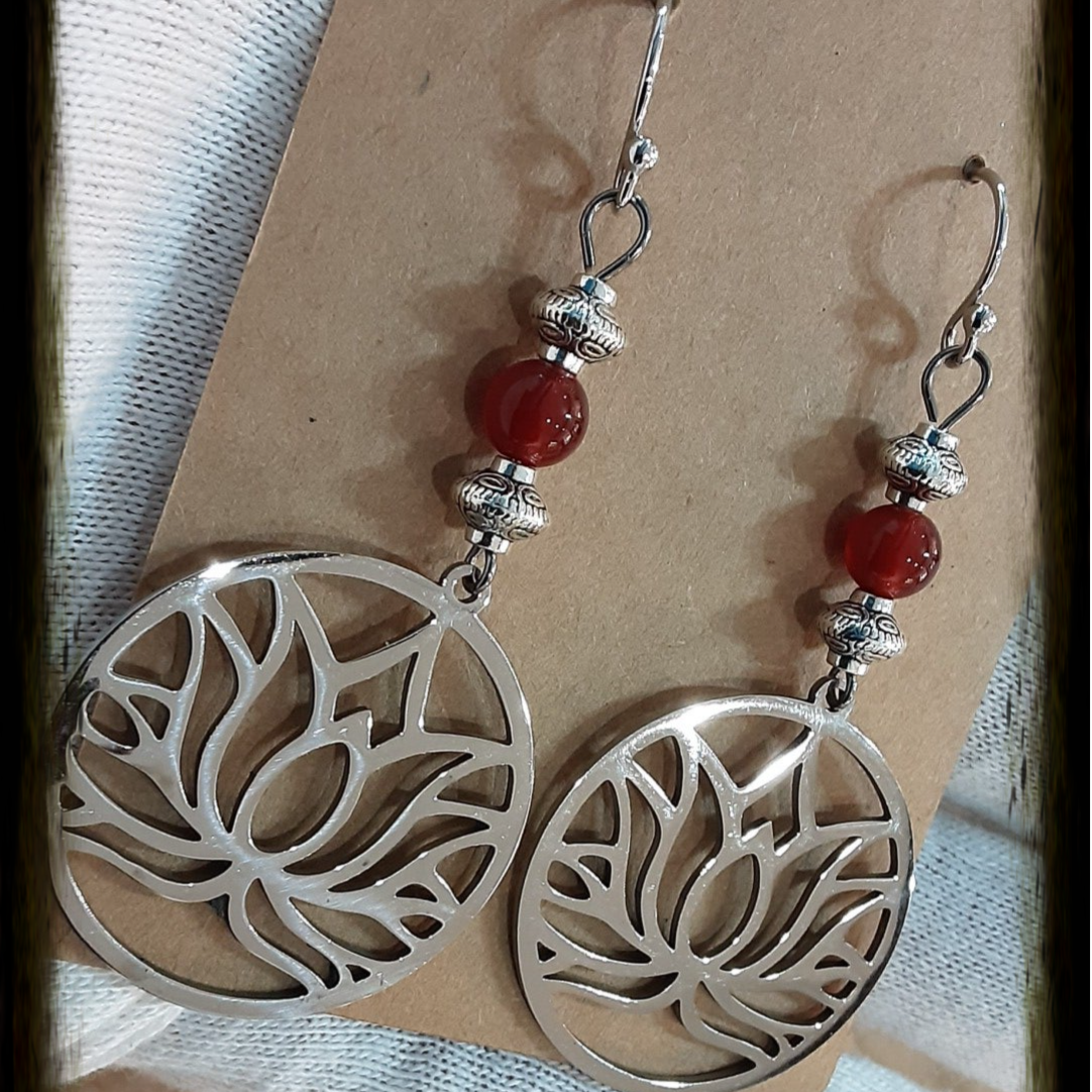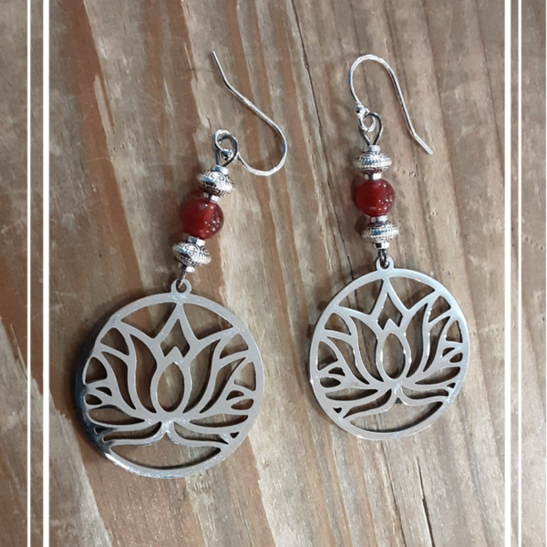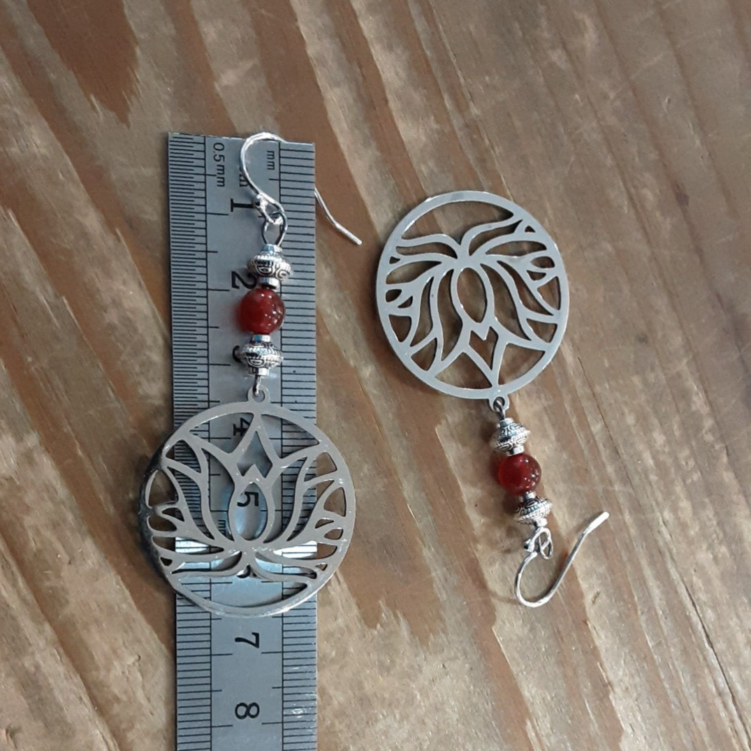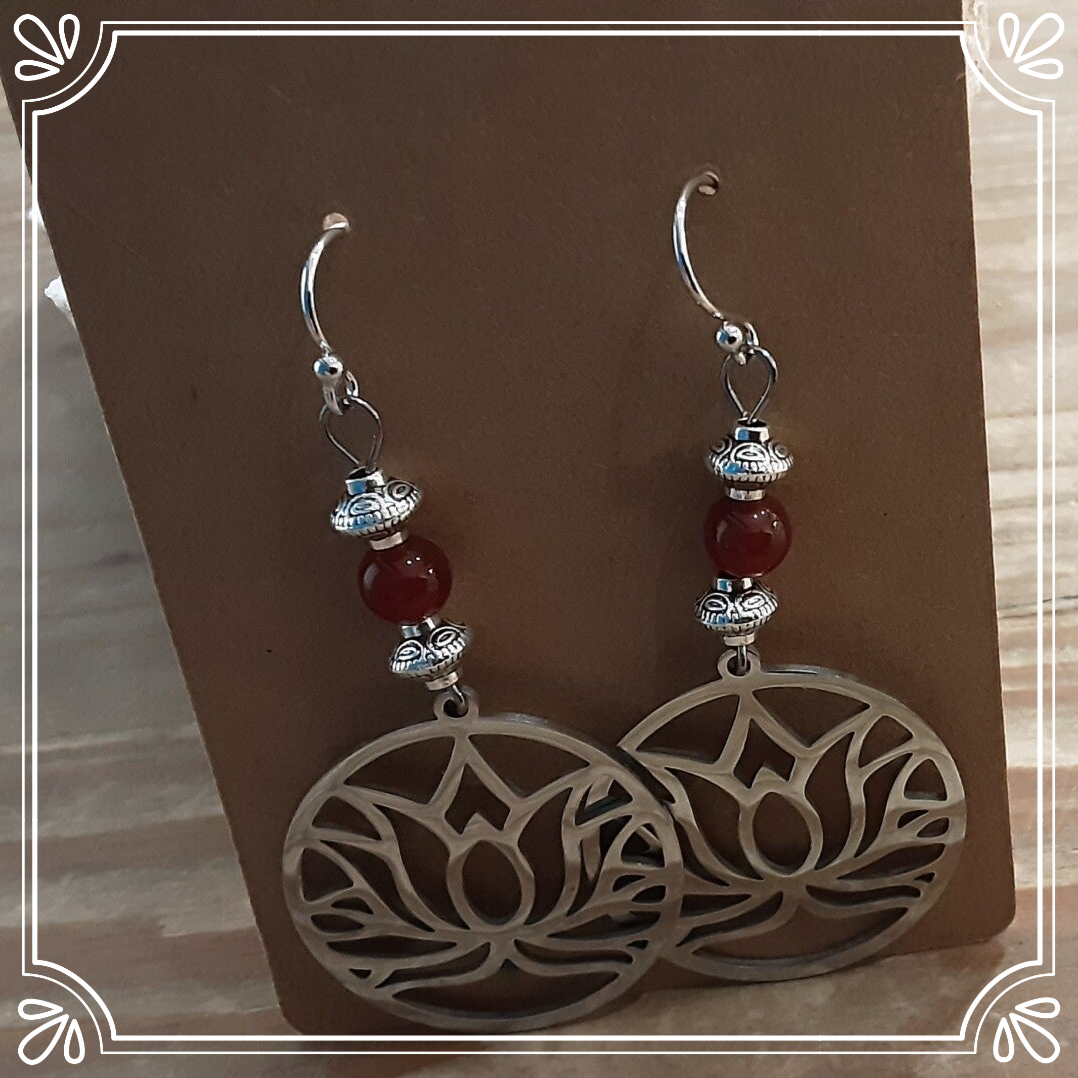 Boucles d'oreilles composées de perles de Cornaline, entretoises en métal argenté, fleurs de Lotus en acier inoxydable et crochets d'oreilles en argent 925/1000.