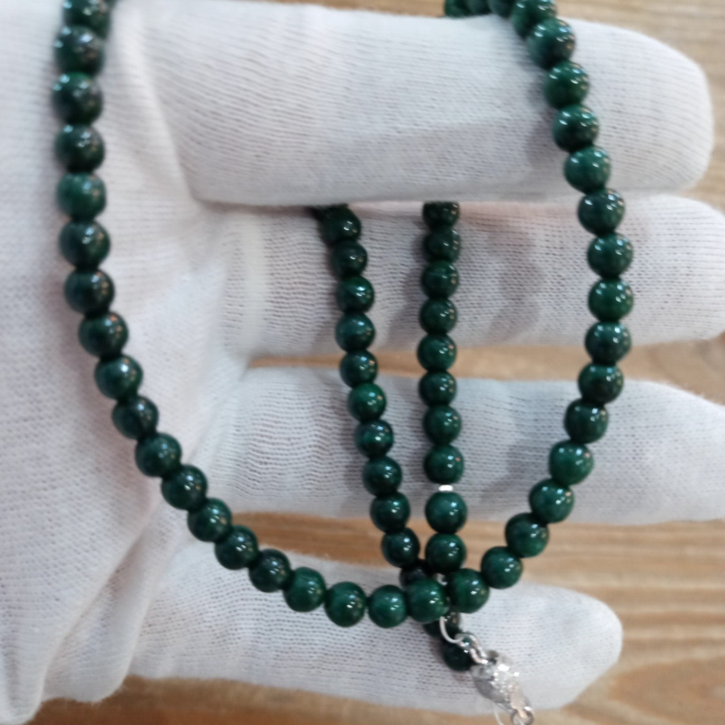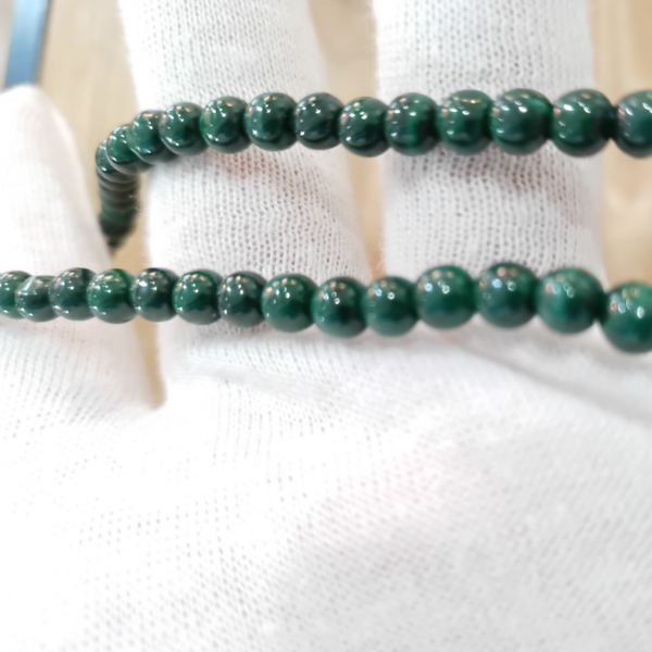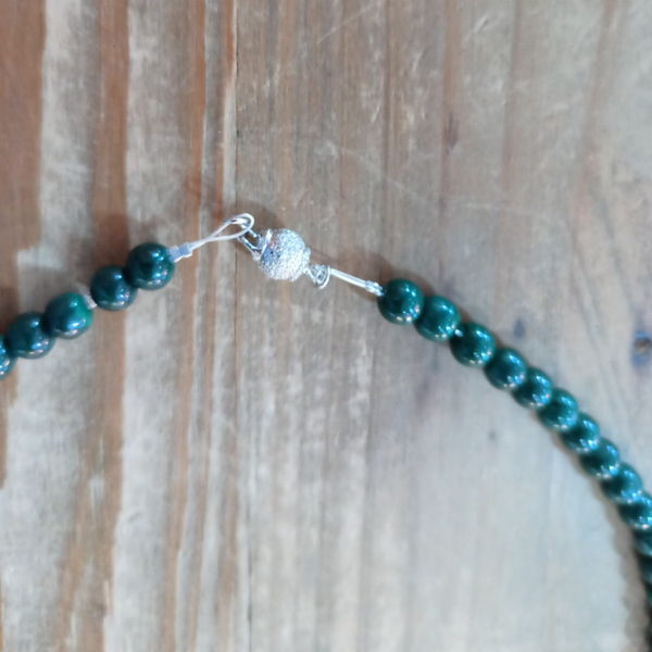 Collier ras de cou en perles rondes de Malachite vert sapin, finitions et fermoir sécurité en Argent 925/1000. Longueur 44 cm.