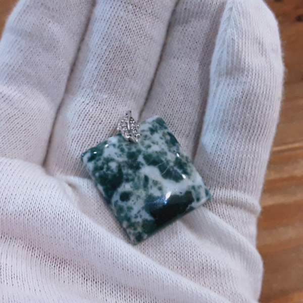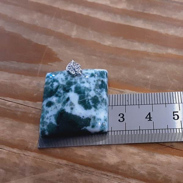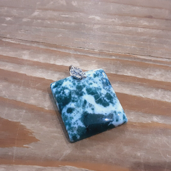 Pendentif en Agate arbre et Argent 925/1000.Ce pendentif est composé d'un cabochon rectangulaire d'Agate Arbre vert/blanc, d'une bélière feuille en Argent 925/1000 ornée de Zirconium.