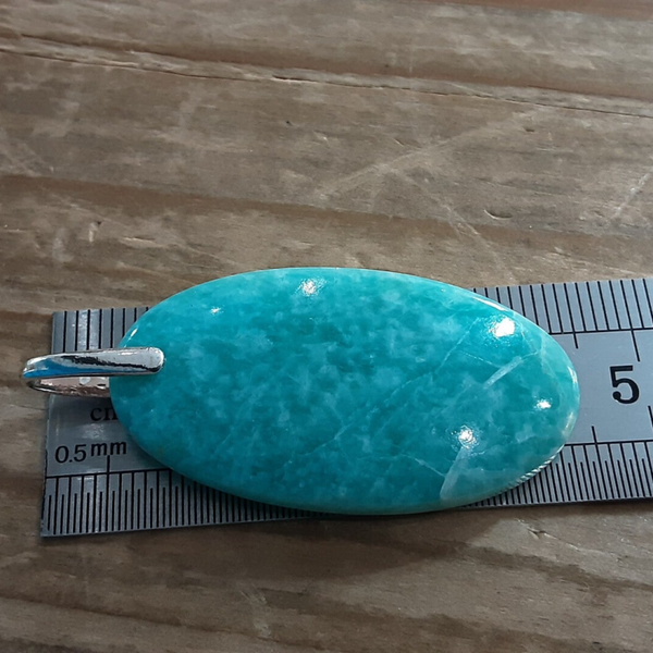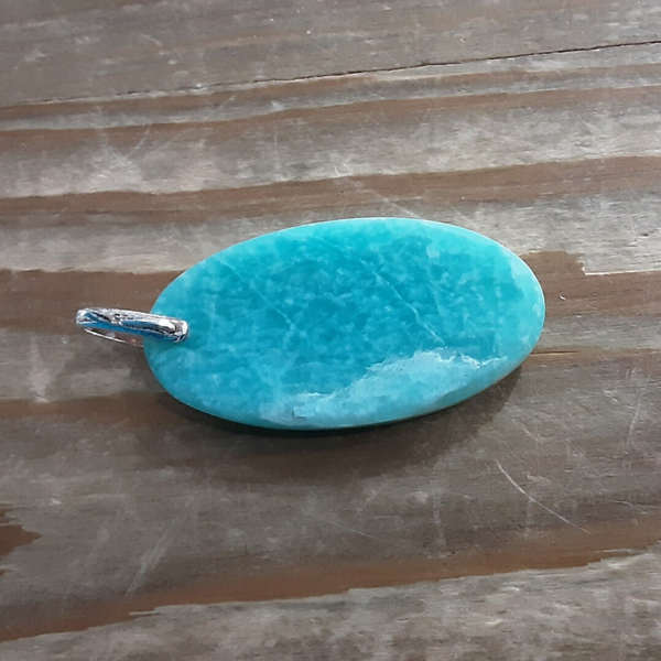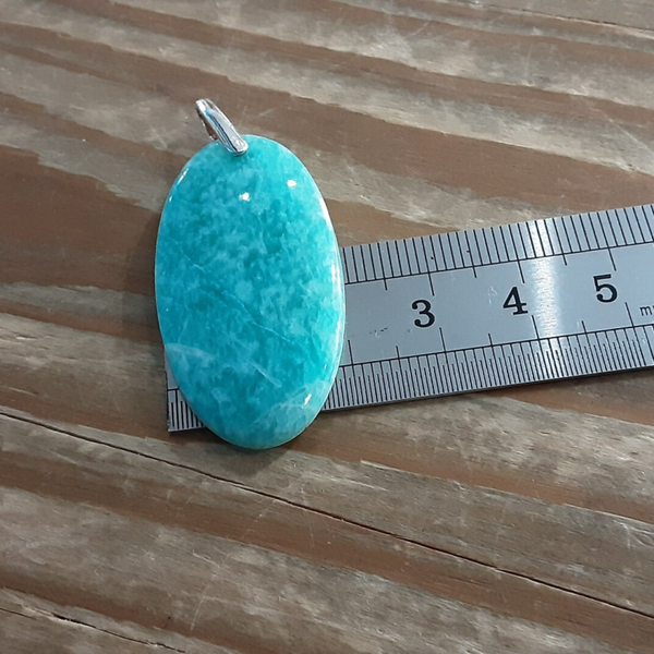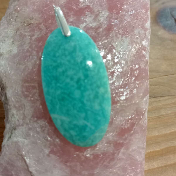 Pendentif en Amazonite naturelle et Argent 925/1000. Il est composé d'un cabochon ovale en Amazonite naturelle vert très clair et d'une bélière en Argent 925/1000.