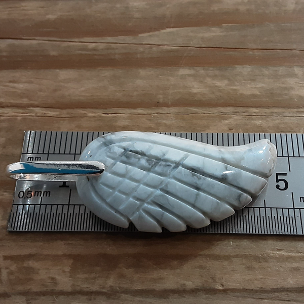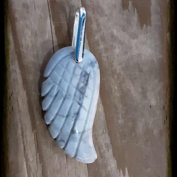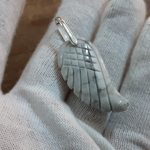 Pendentif en Howlite et Argent 925/1000. Il est composé d'un cabochon en forme d'aile d'Ange en Howlite blanc/noir et d'une bélière en Argent 925/1000.