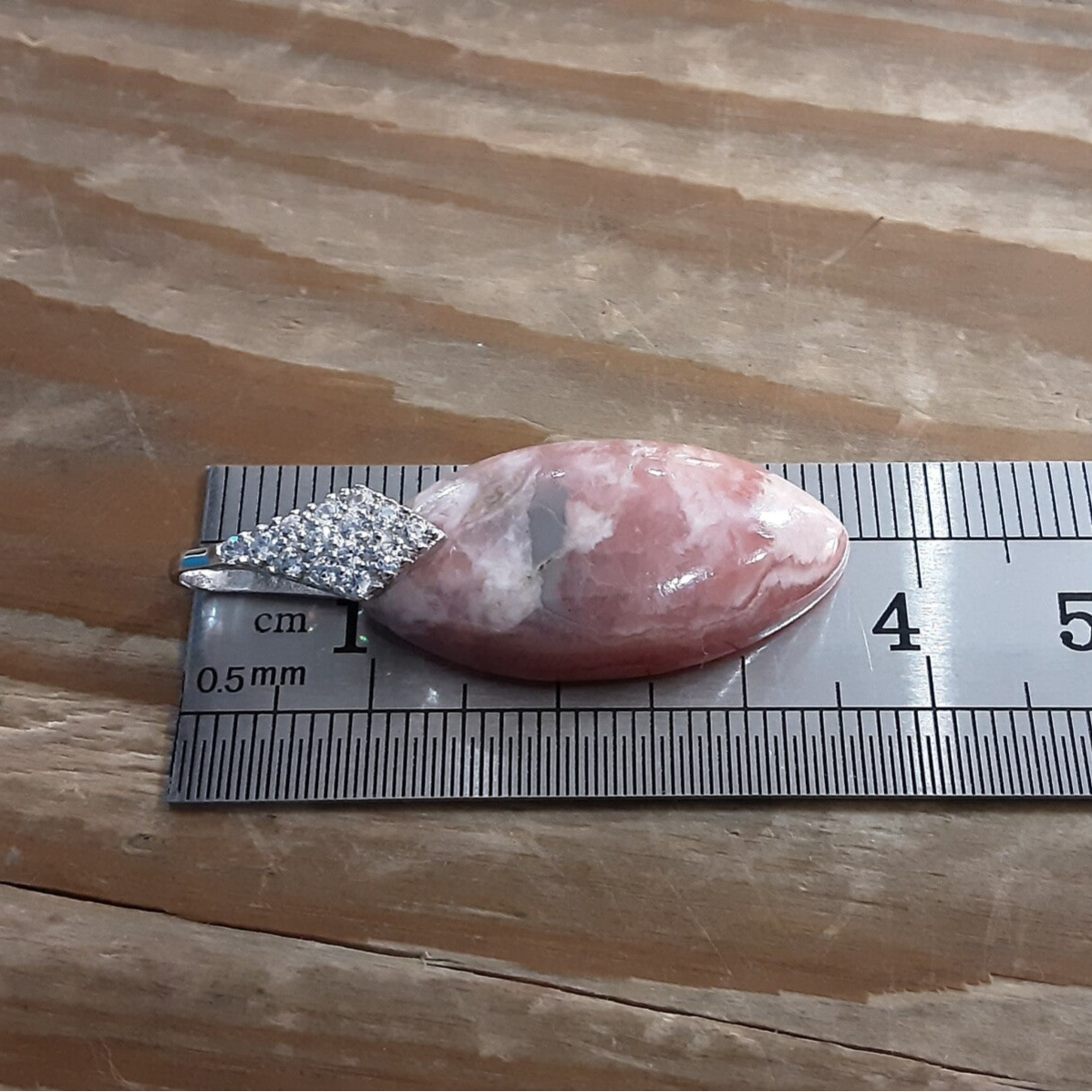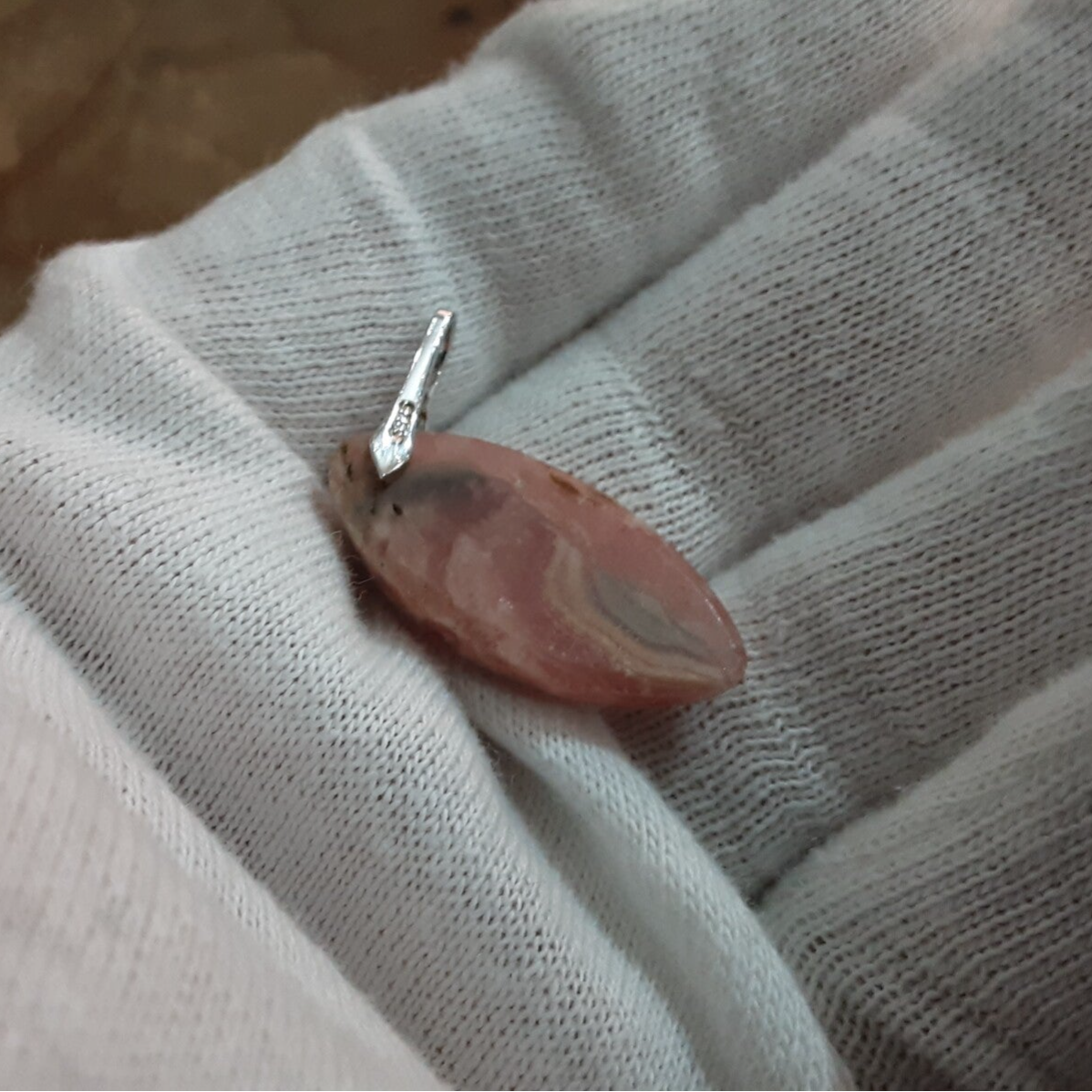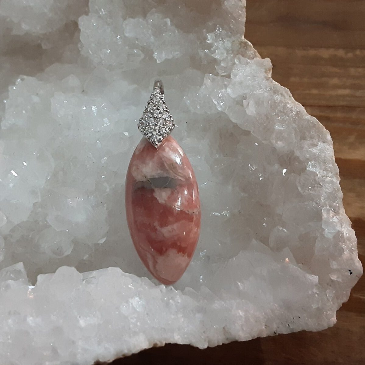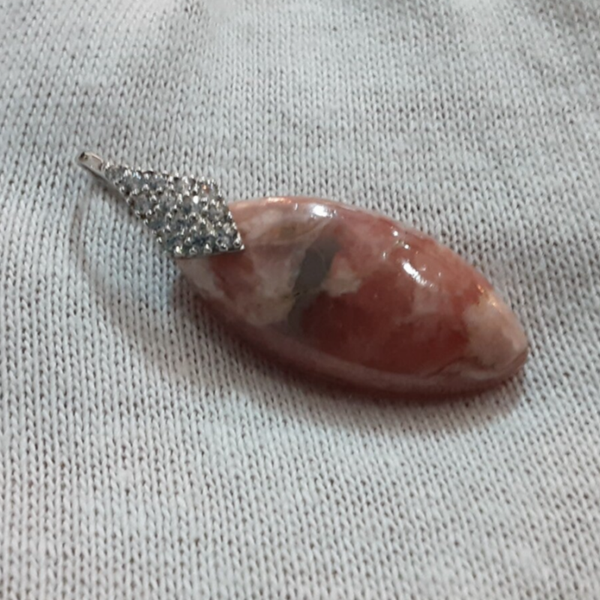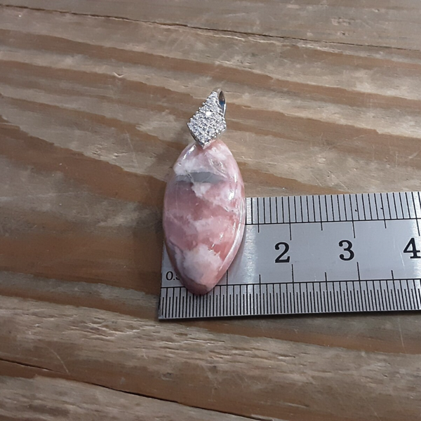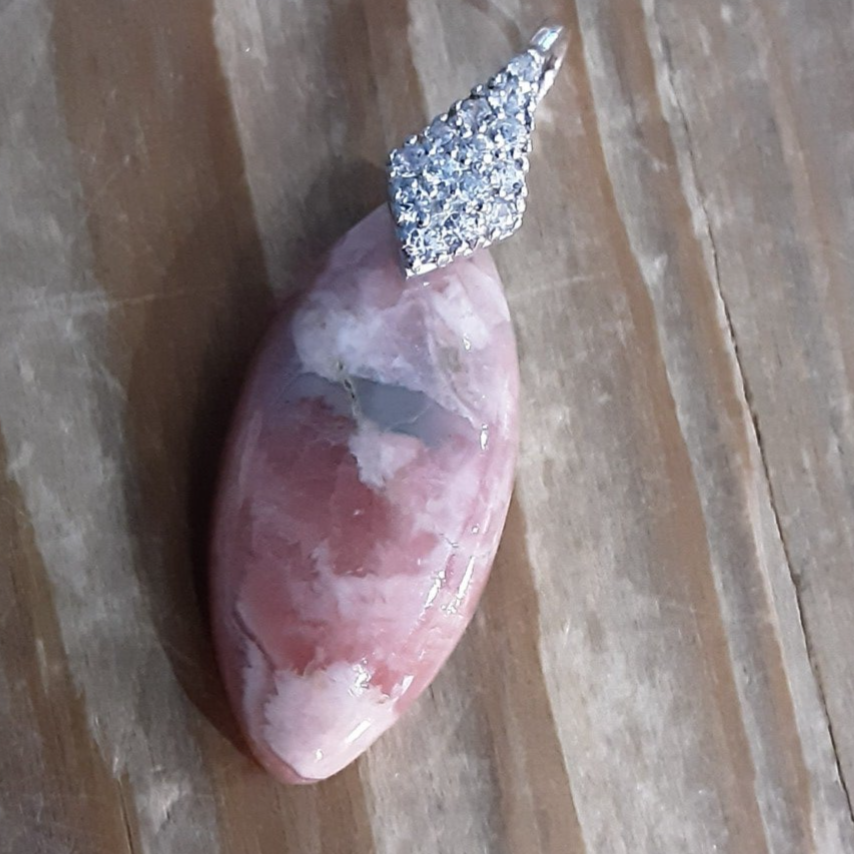Pendentif en Rhodochrosite et Argent 925/1000. Il est composé d'un cabochon de forme marquise de Rhodochrosite d'Argentine rose/blanc et d'une bélière en Argent 925/1000 ornée de Zirconium.