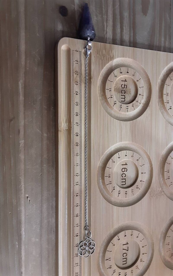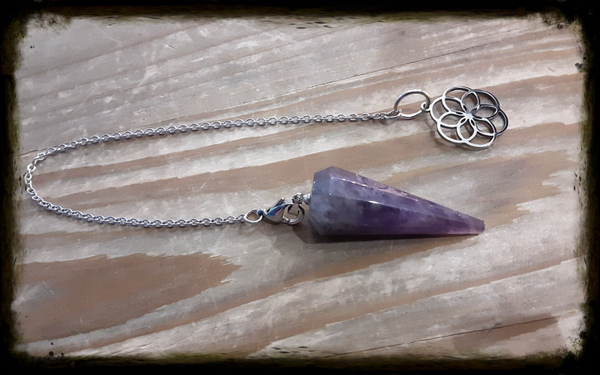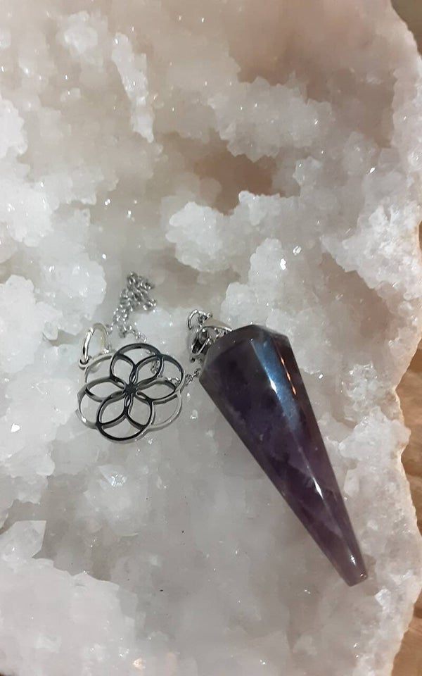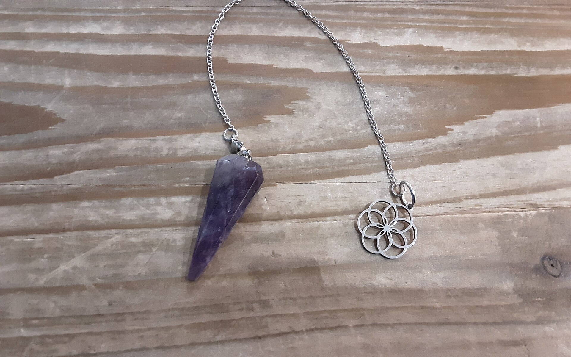 Création artisanale d’un pendule conique en Améthyste naturelle et graine de vie en acier inoxydable.