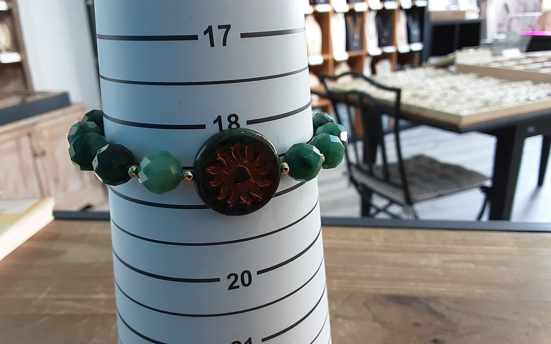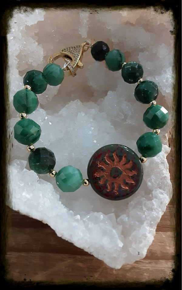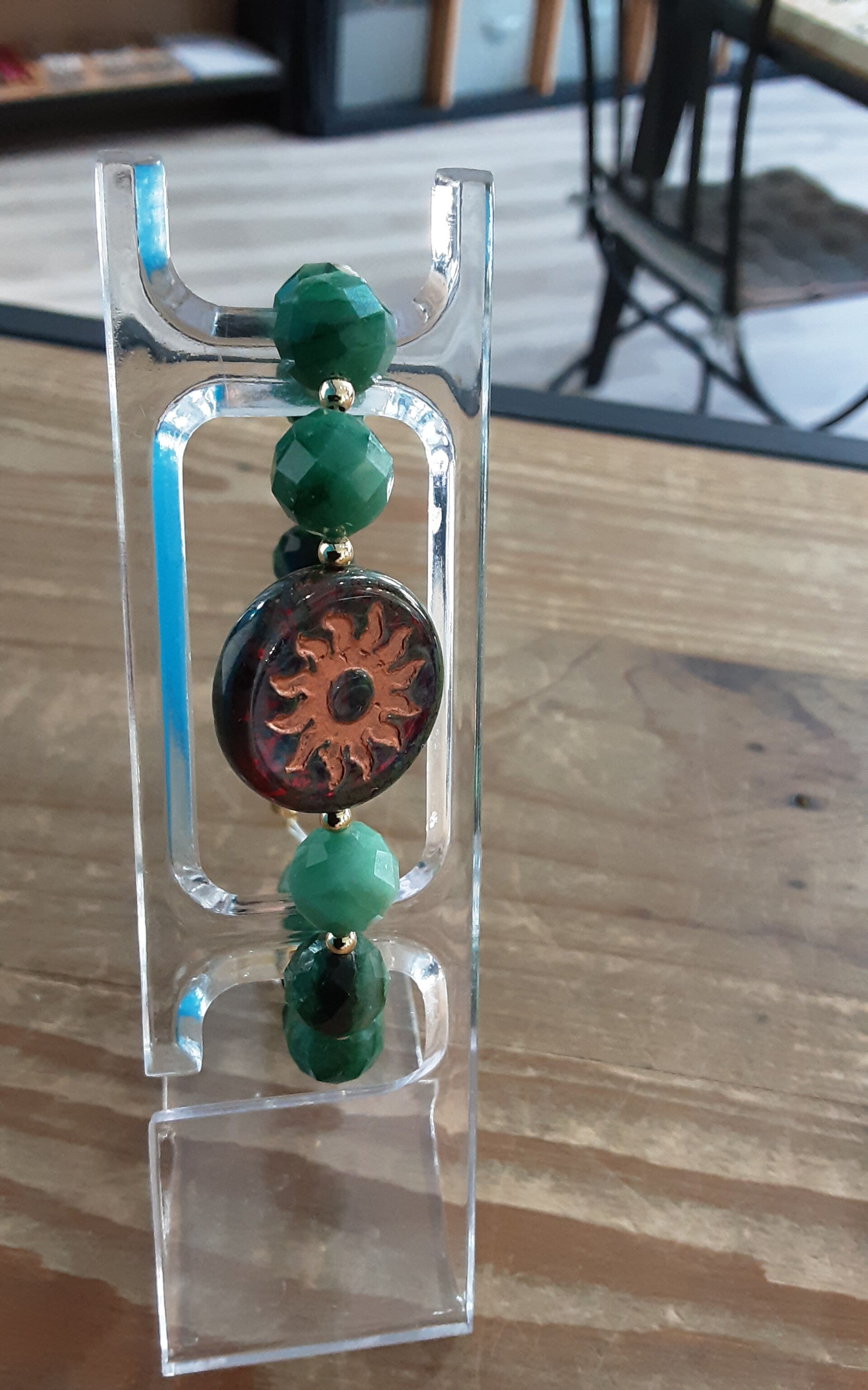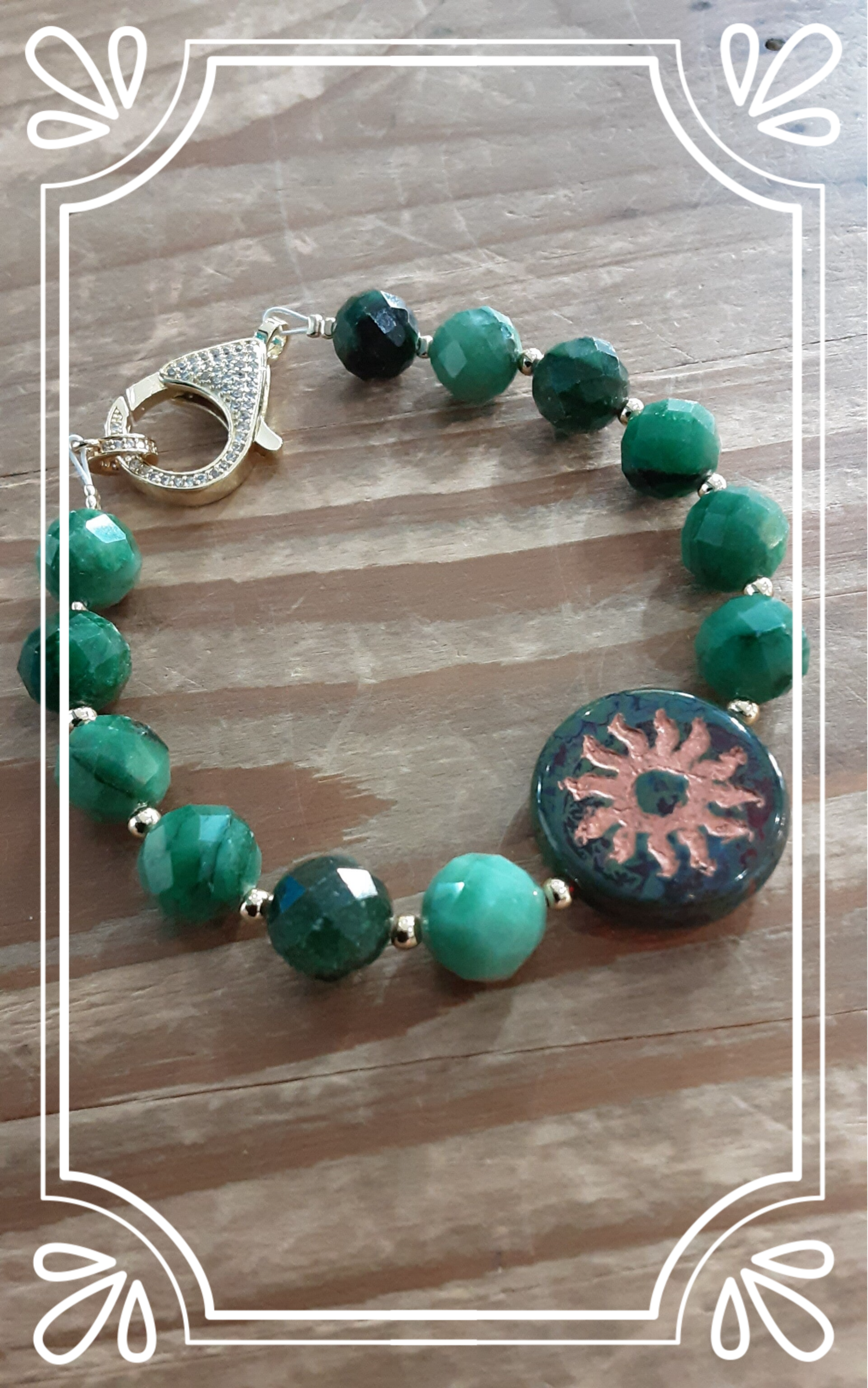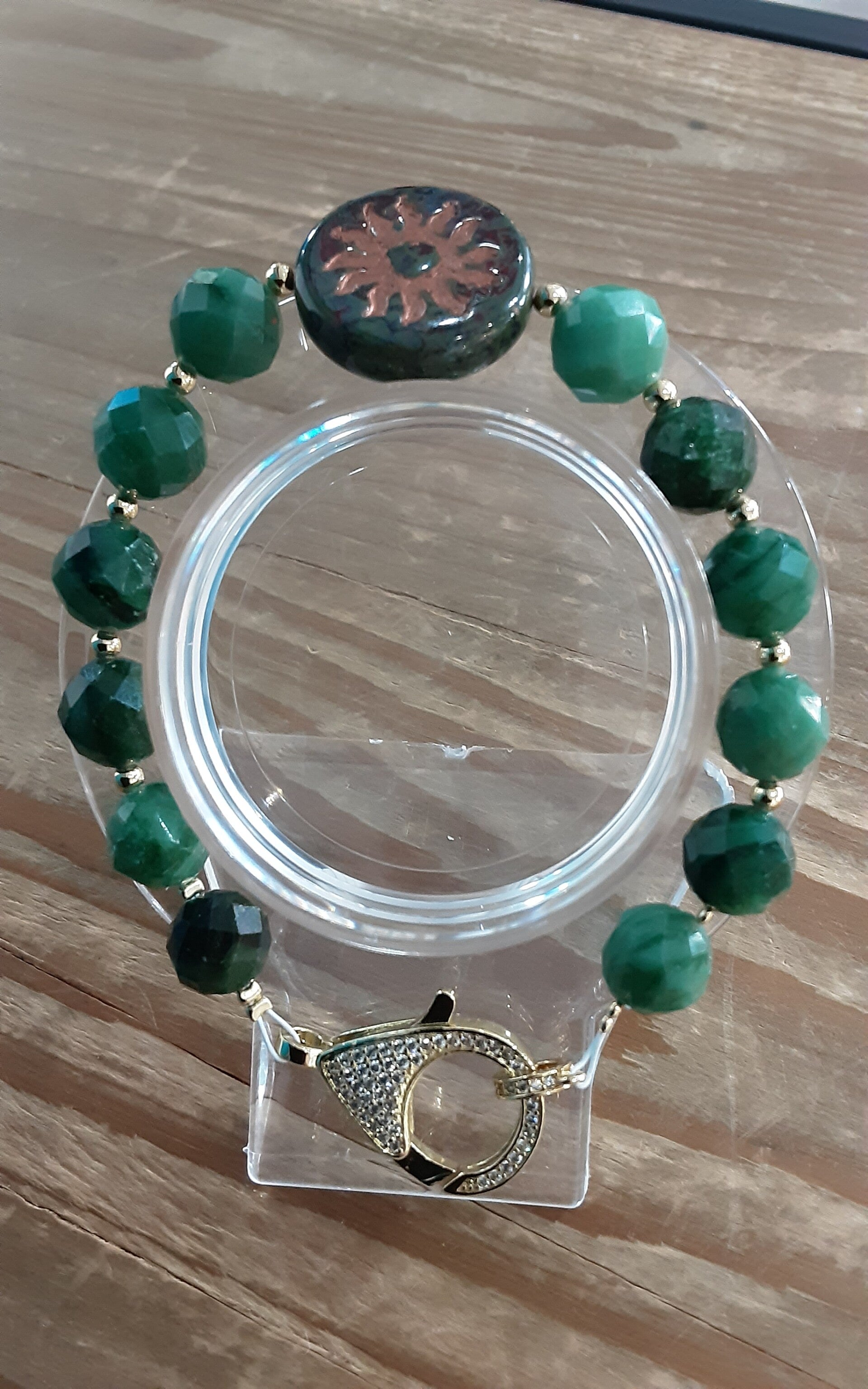 Création artisanale en perles d'Emeraude, taillées à facettes, perle de verre Tchèque, perles et fermoir mousqueton Laiton doré. Longueur poignet 18,5 cm.