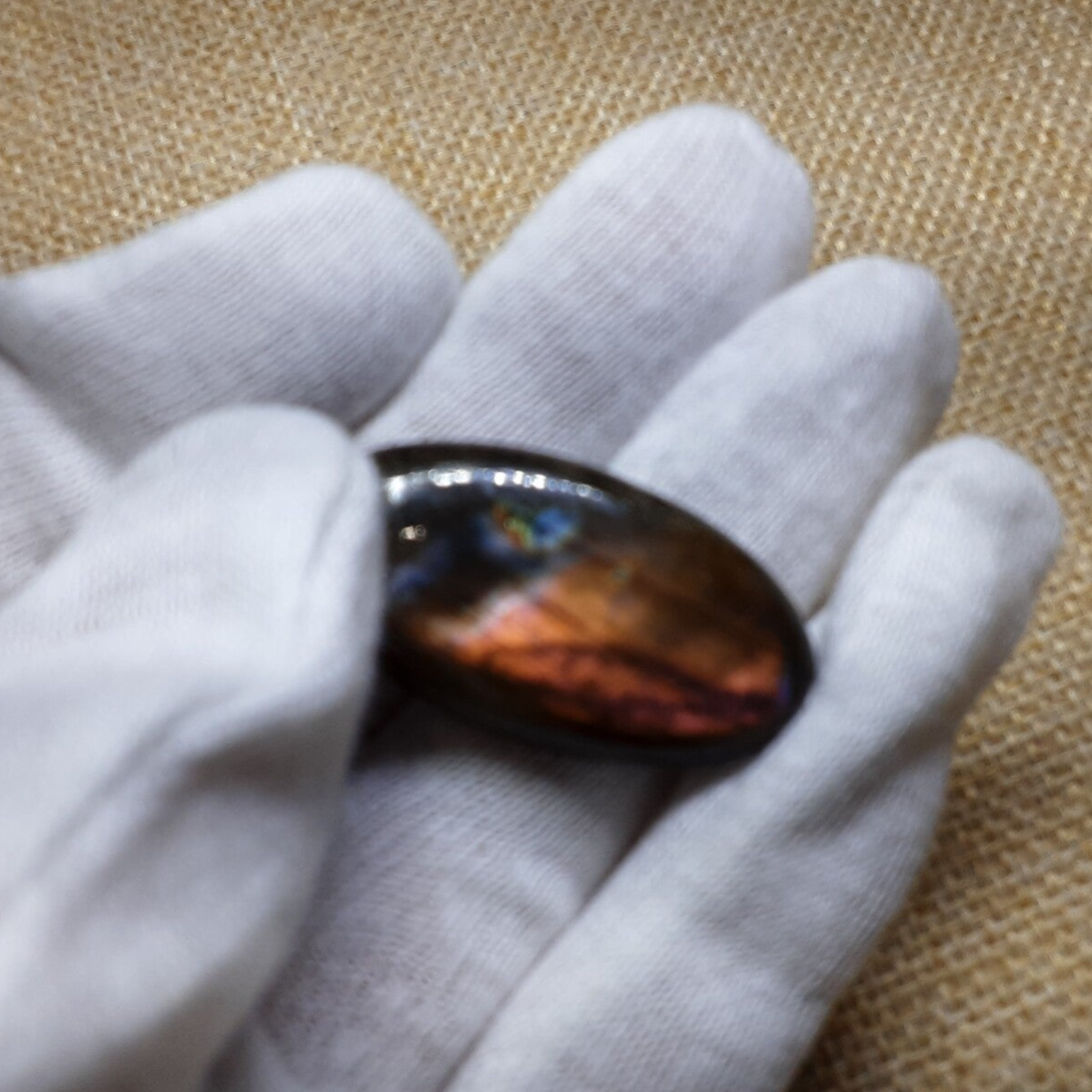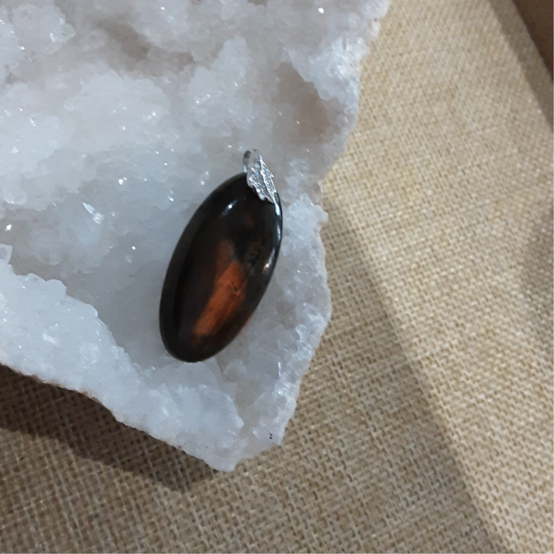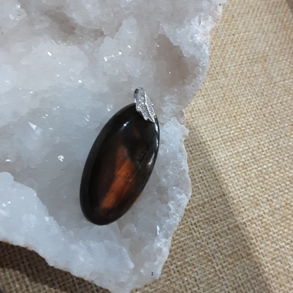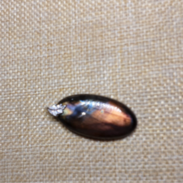 Pendentif en Labradorite de forme ovale couleur feu vif, bélière feuille en Argent 925/1000 ornée de Zirconium.