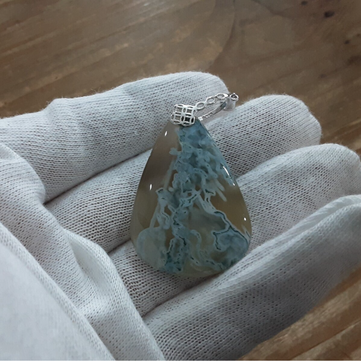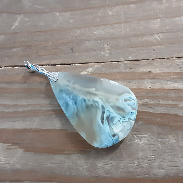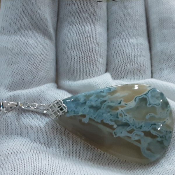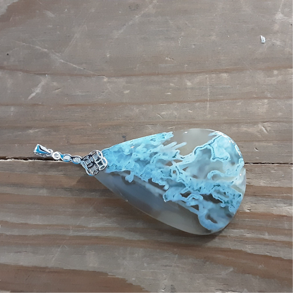 Pendentif en Agate mousse et Argent 925/1000.Création artisanale composé d'un cabochon de forme goutte en Agate Mousse vert/ transparent et d'une bélière en Argent 925/1000. Modèle unique.
