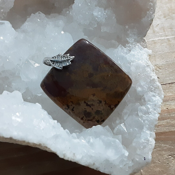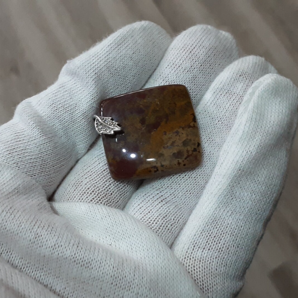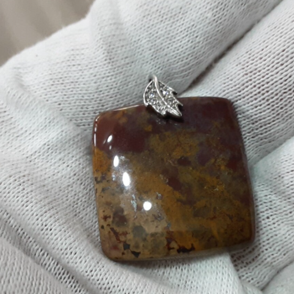 Pendentif en Jaspe polychrome rouge/ocre et bélière feuille en Argent 925/1000 ornée de Zirconium.