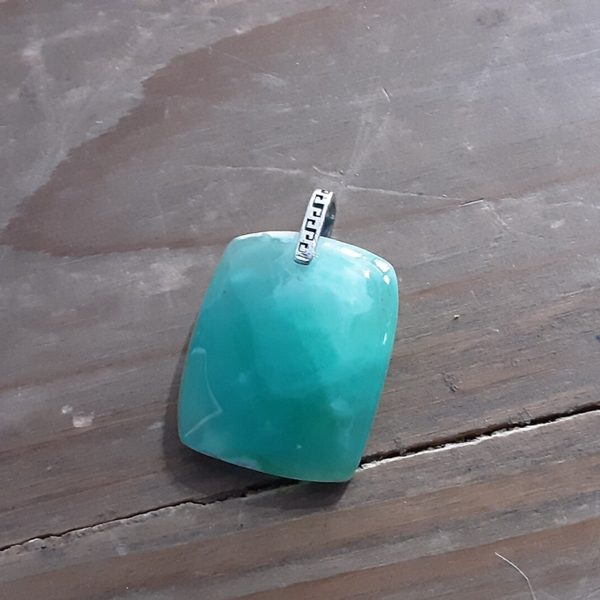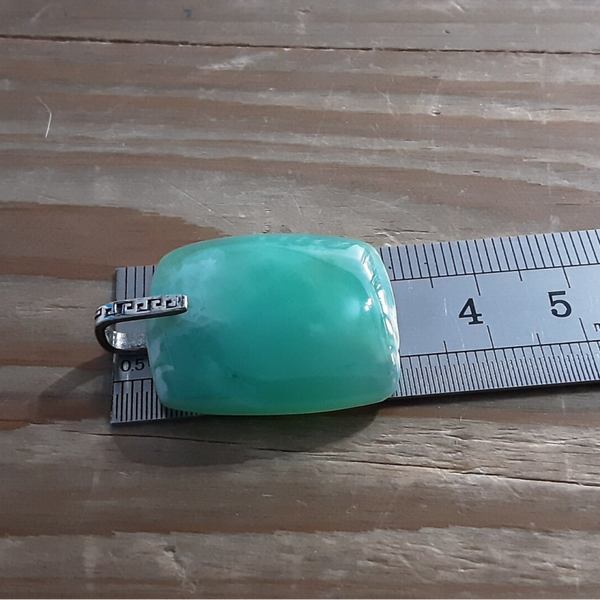 Pendentif en Chrysoprase et Argent 925/1000. Il est composé d'un cabochon de Chrysoprase rectangulaire vert pomme/blanc et d'une bélière en Argent 925/1000.