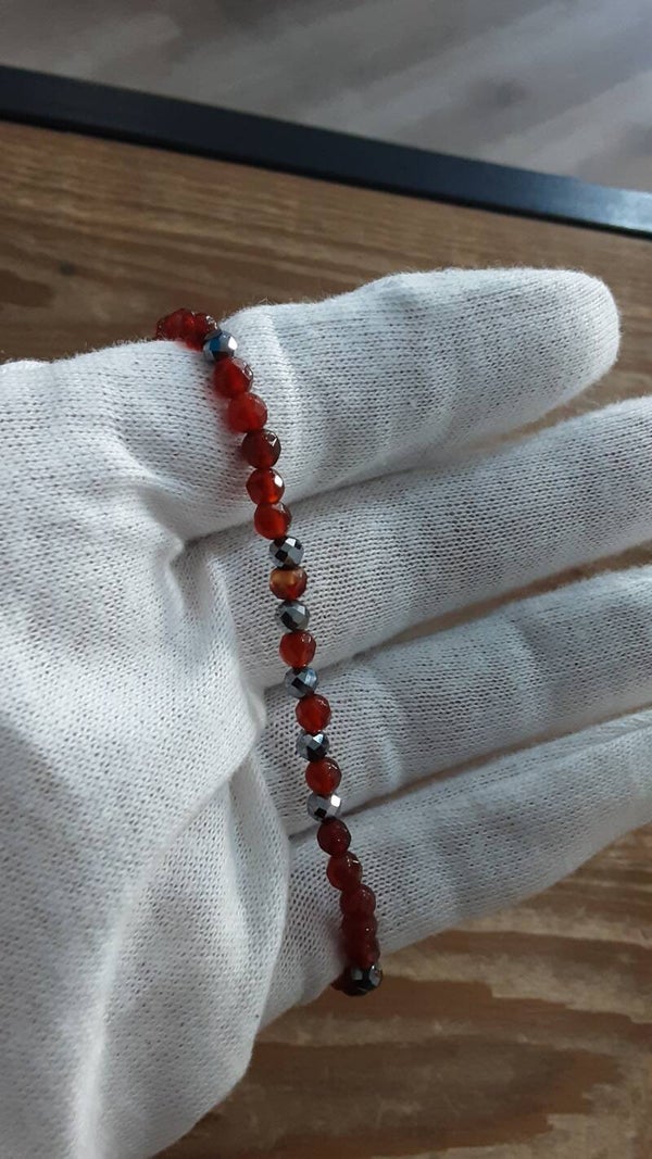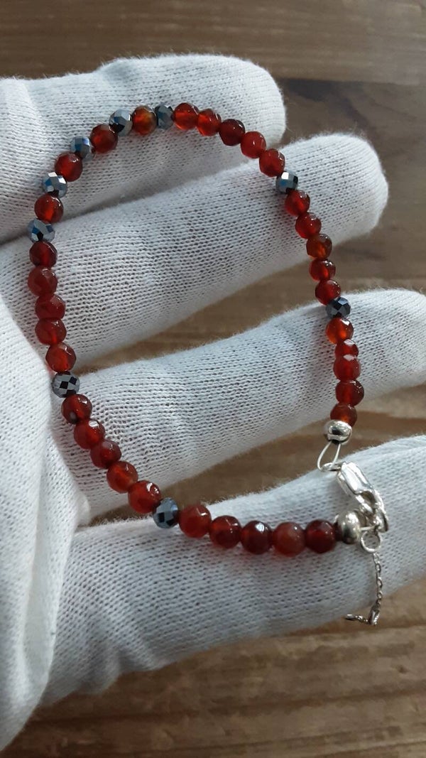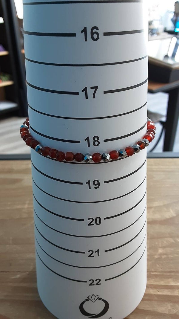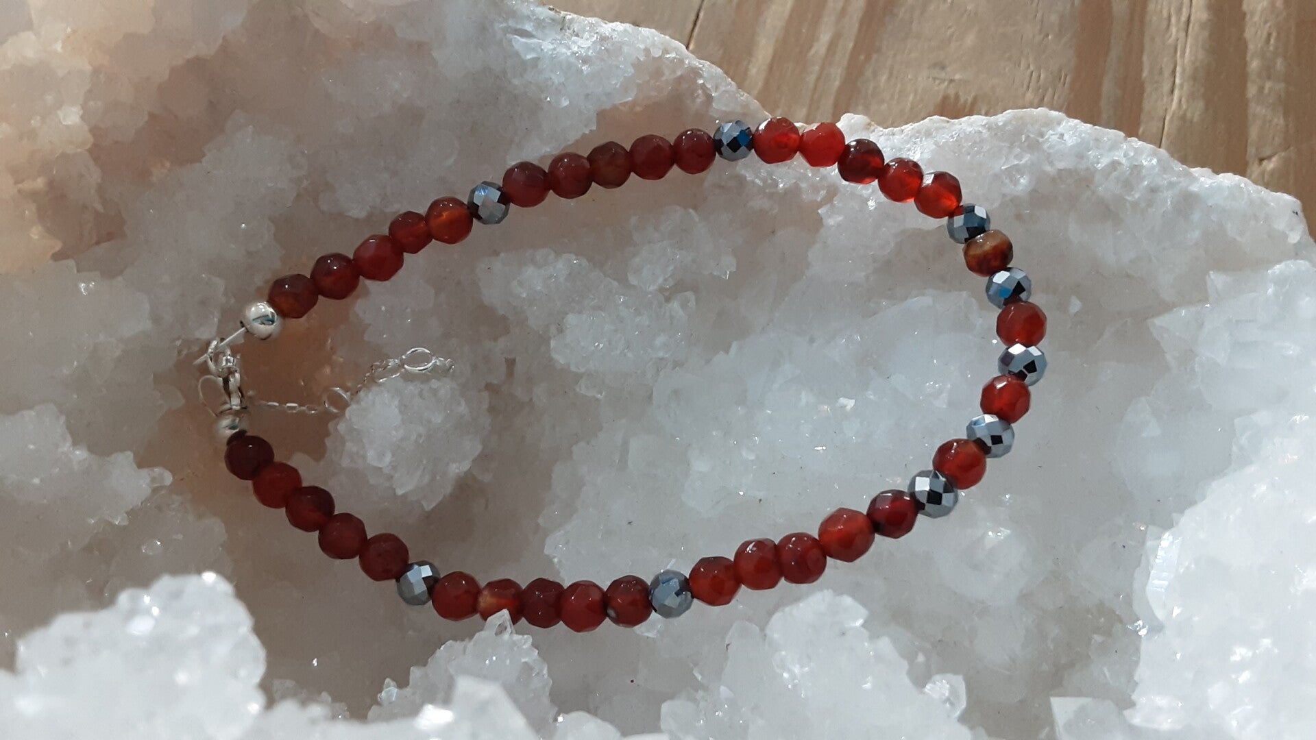Création artisanale d'un bracelet composé de perles rondes taillées à facettes de diamètre 3 mm en Cornaline et Térahertz, finitions, ralonge et fermoir mousqueton en Argent 925/1000. Convient à un poignet de 18,5 à 19,5 cm.
