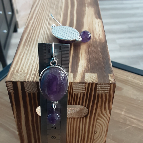 Boucles d'oreilles composées d'un cabochon ovale en Améthyste sur plateau en alliage style tibétain de 25 x 18 mm, perle ronde en Améthyste et crochet d'oreille en argent 925/1000.