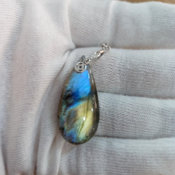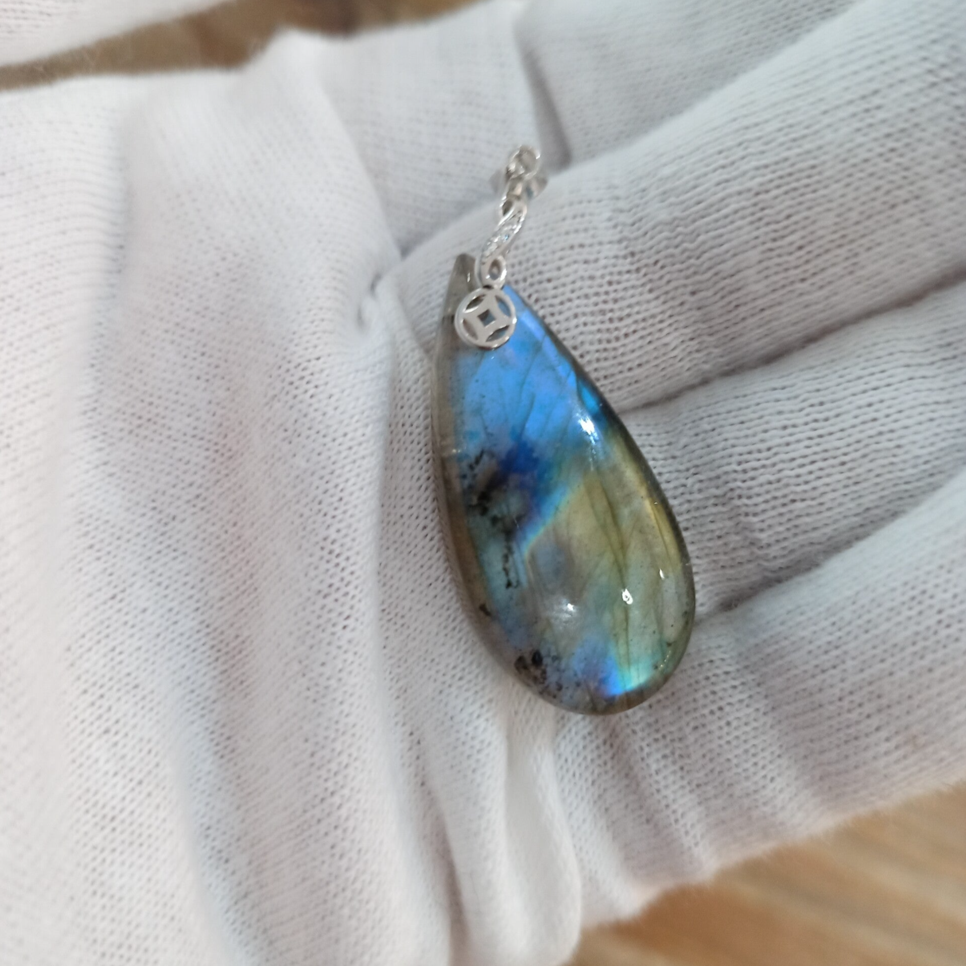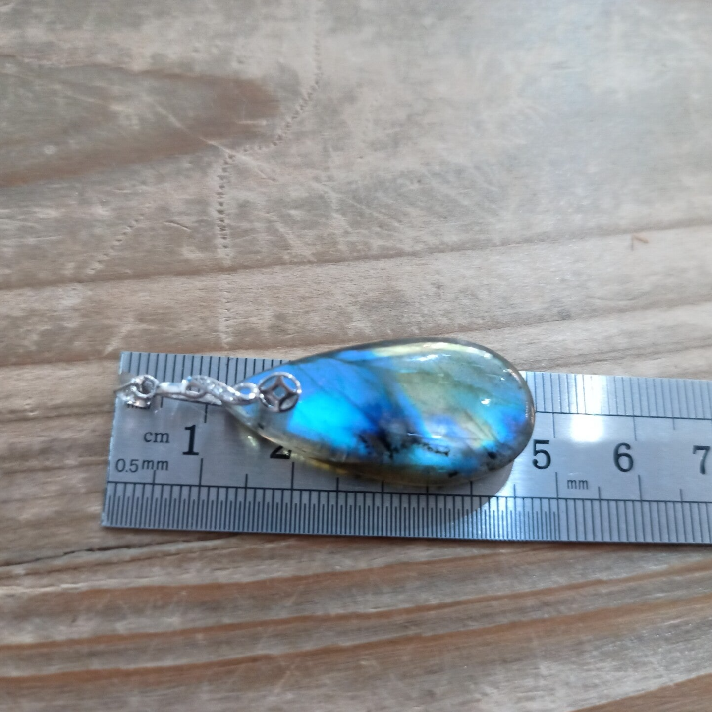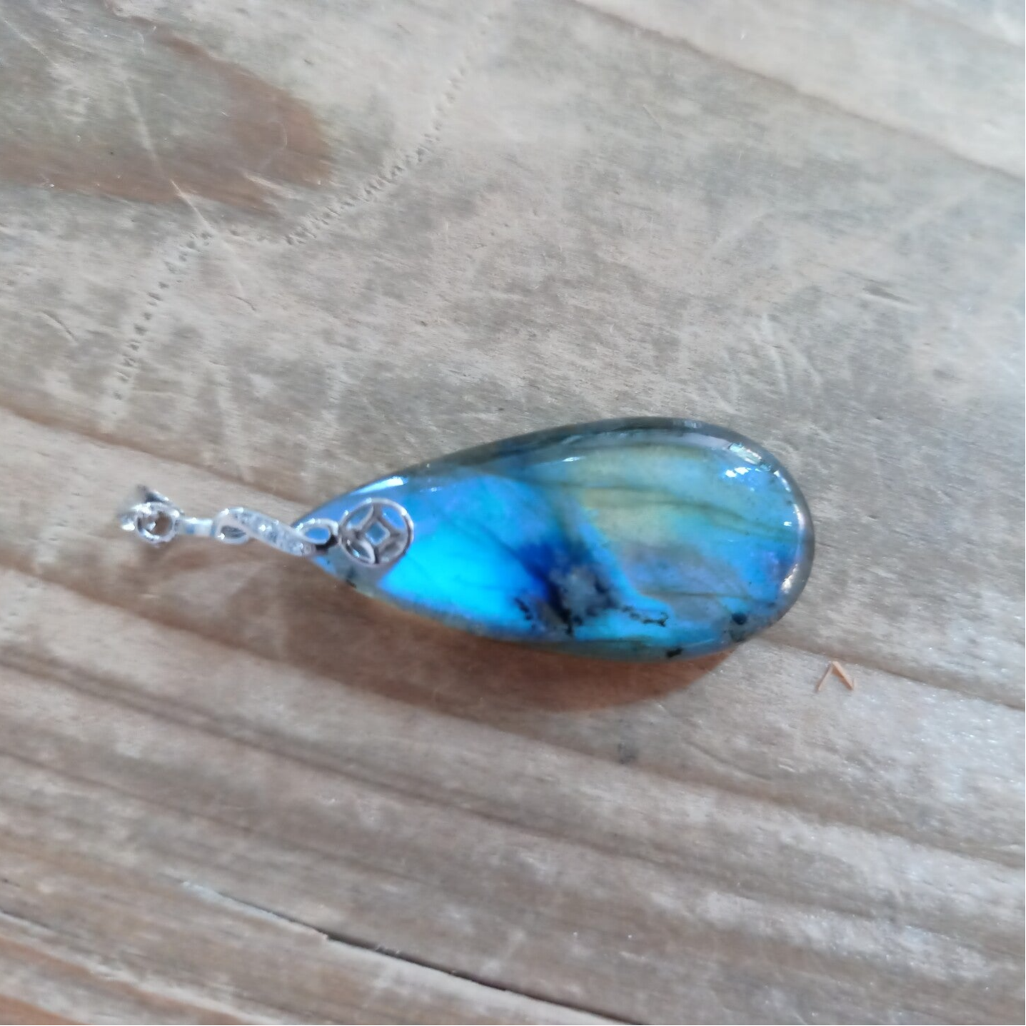 Pendentif en Labradorite bleu et or, forme goutte, bélière en Argent 925/1000.
