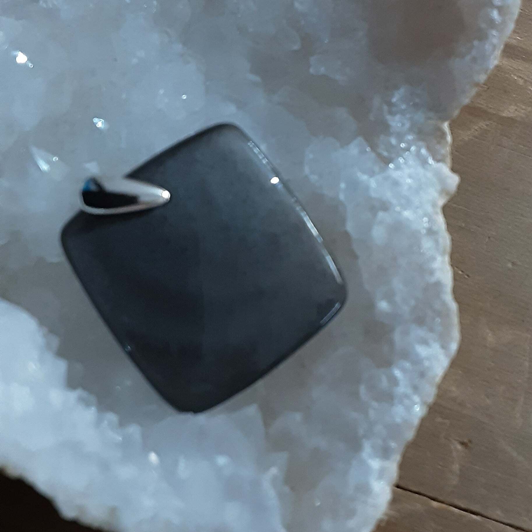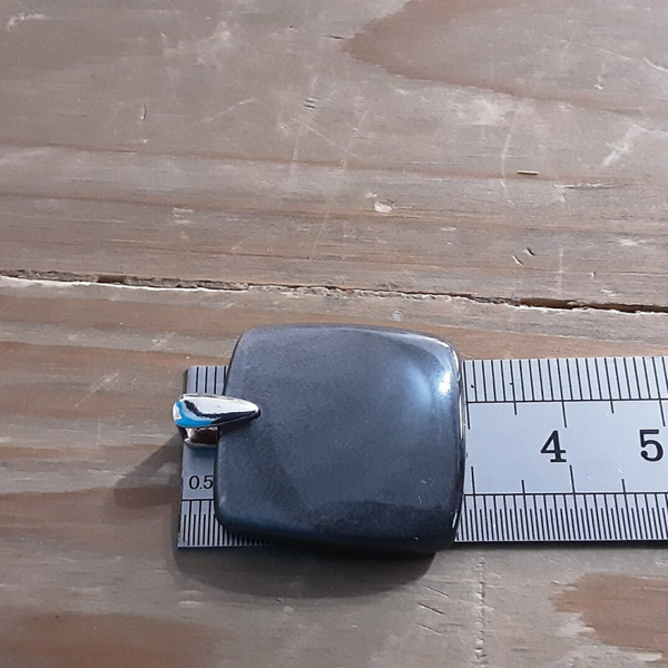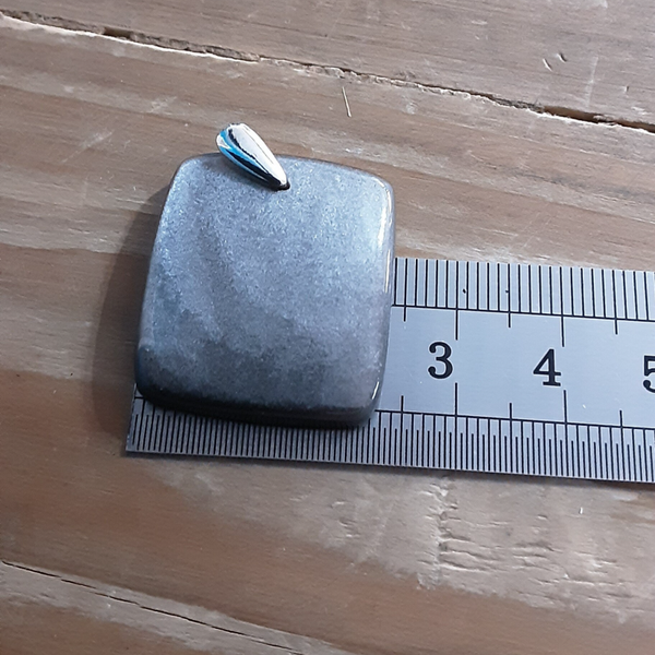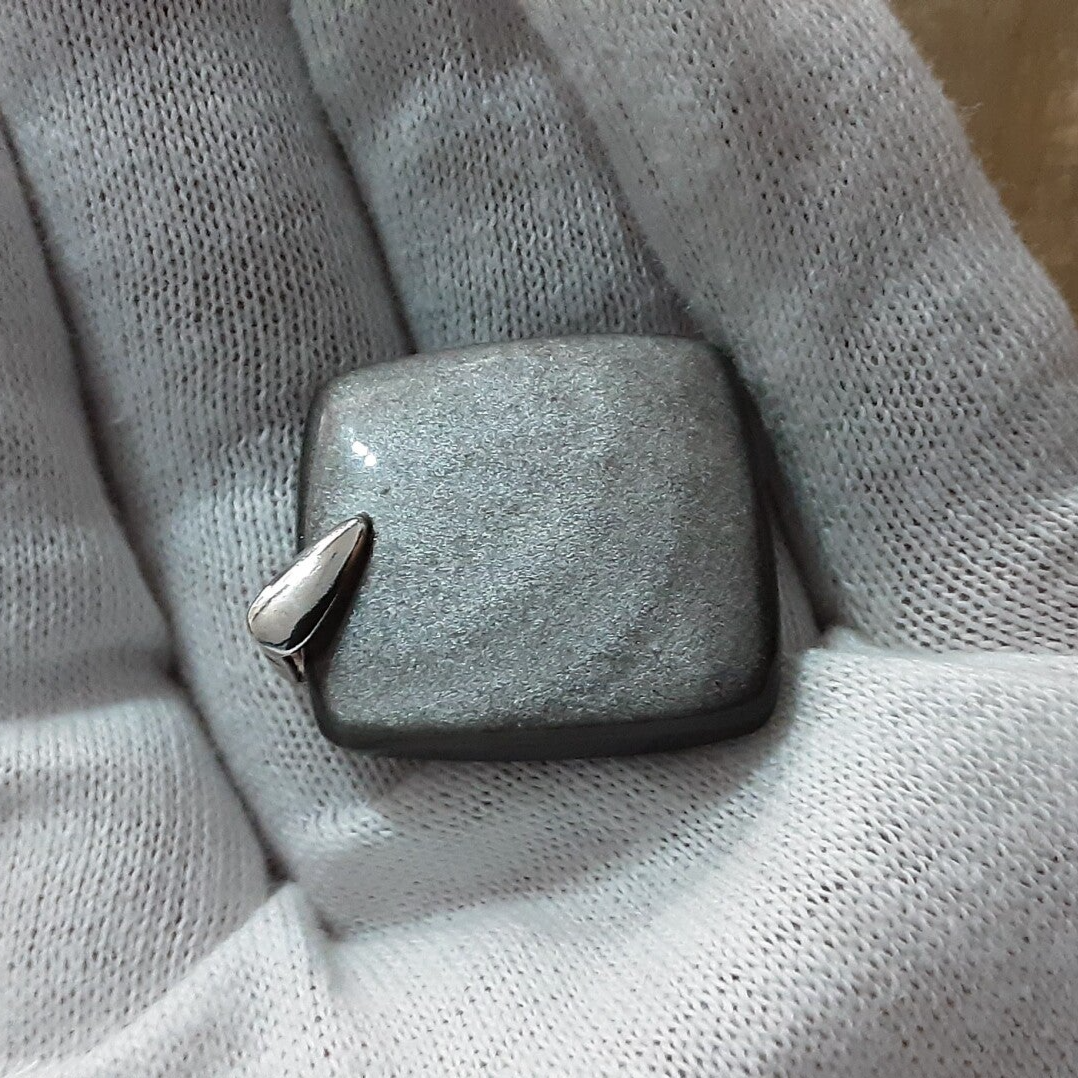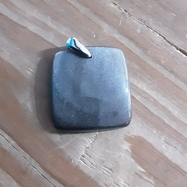 Pendentif en Obsidienne Argentée et Argent 925/1000. Il est composé d'un cabochon +/- carré d'Obsidienne Argentée et d'une bélière en Argent 925/1000.