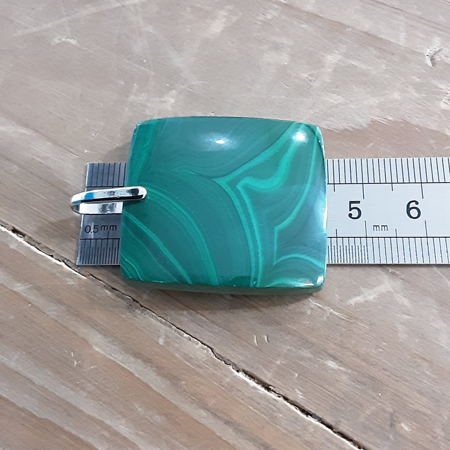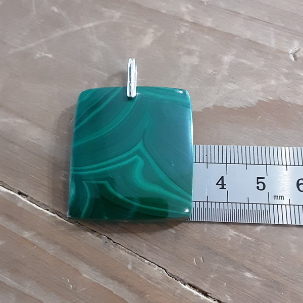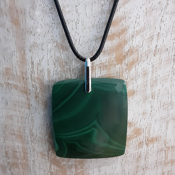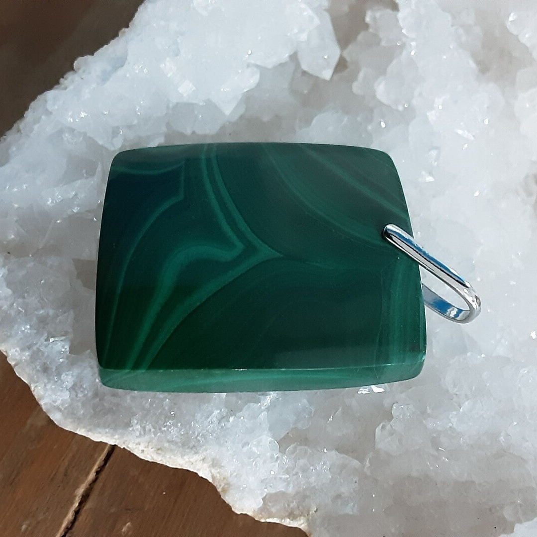 Pendentif en Malachite et bélière en Argent 925/1000, livré avec un cordon en coton ciré de 40 cm et fermoir en Argent 925/1000.