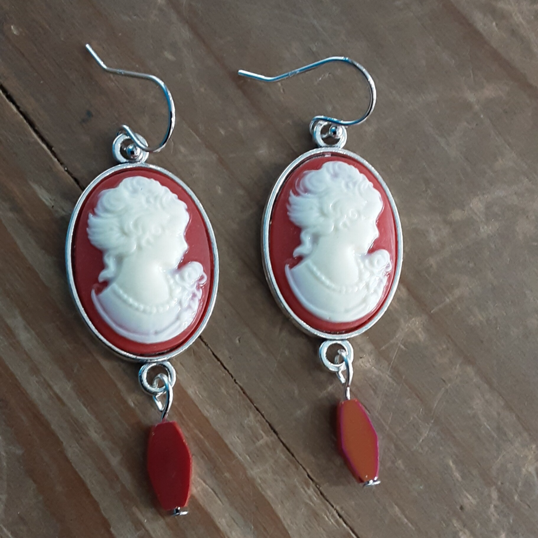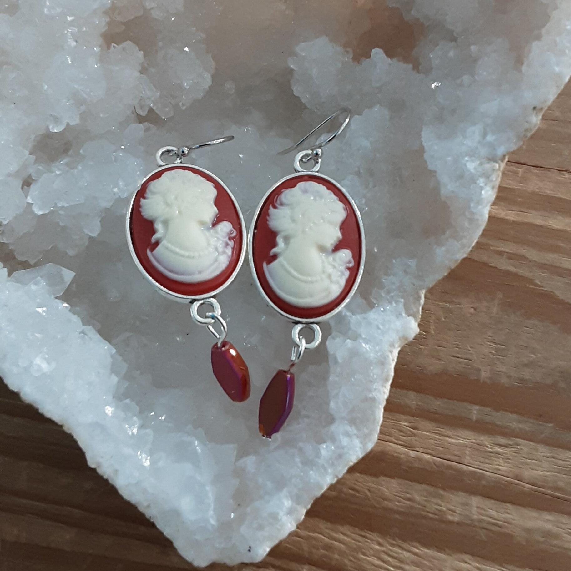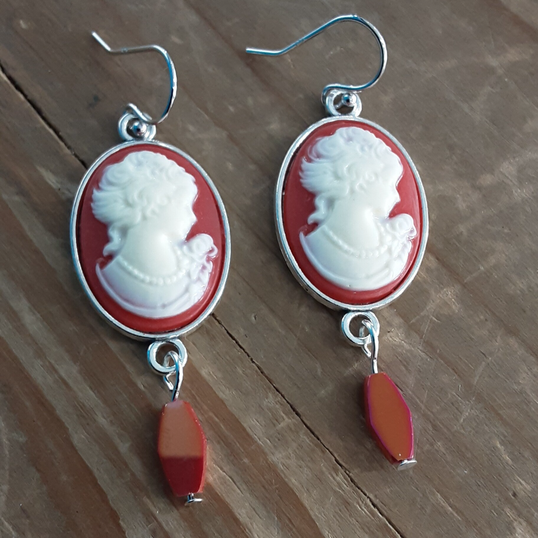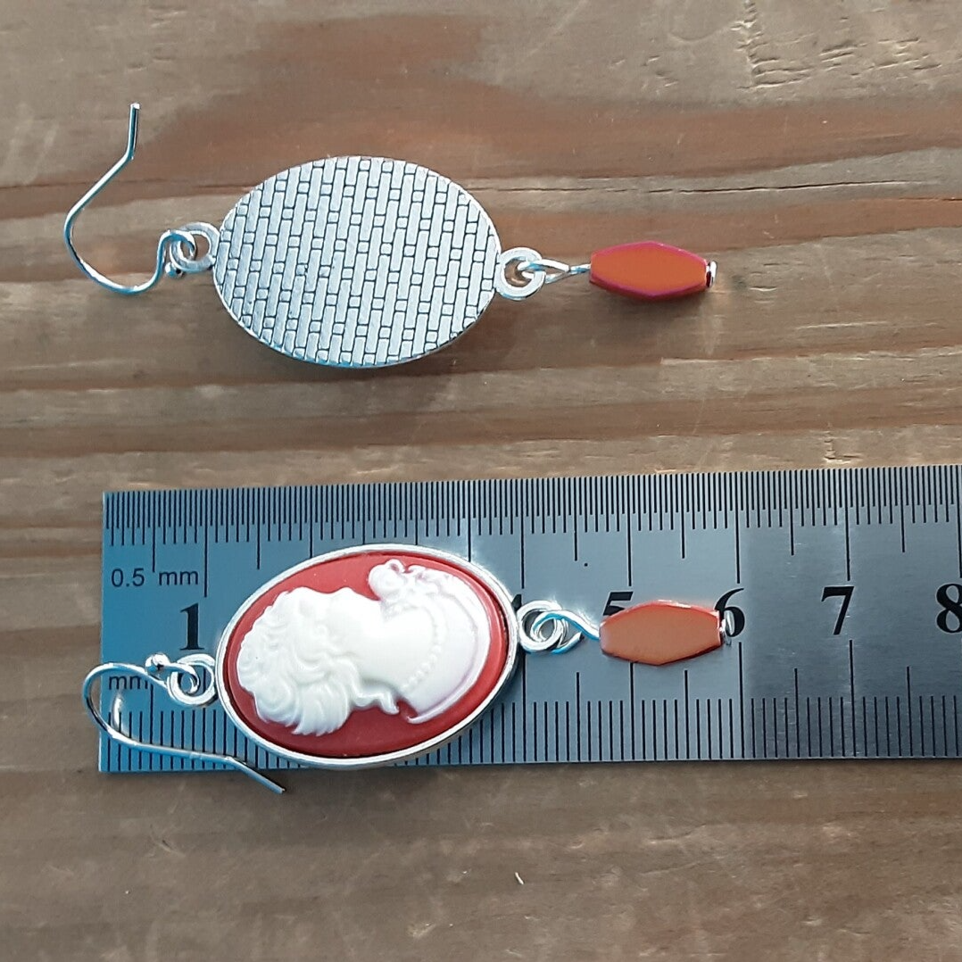 Boucles d'oreilles de création artisanale, composées de camées en résine opaque 25x18 mm de teinte orange foncé et blanc nacré, plateaux en alliage de style tibétain sans cadmium et sans plomb, tiges en métal, perles de verre électroplaqué à facettes de teinte orange/rouille et crochets d'oreilles en Argent 925/1000 (Argent sterling).