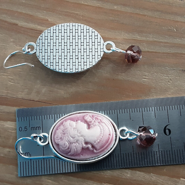 Boucles d'oreilles de création artisanale, composées de camées en résine opaque 25x18 mm de teinte vieux rose et blanc, plateaux en alliage de style tibétain sans cadmium et sans plomb, tiges en métal, perles de cristal à facettes vieux rose foncé et crochets d'oreilles en Argent 925/1000 (Argent sterling).