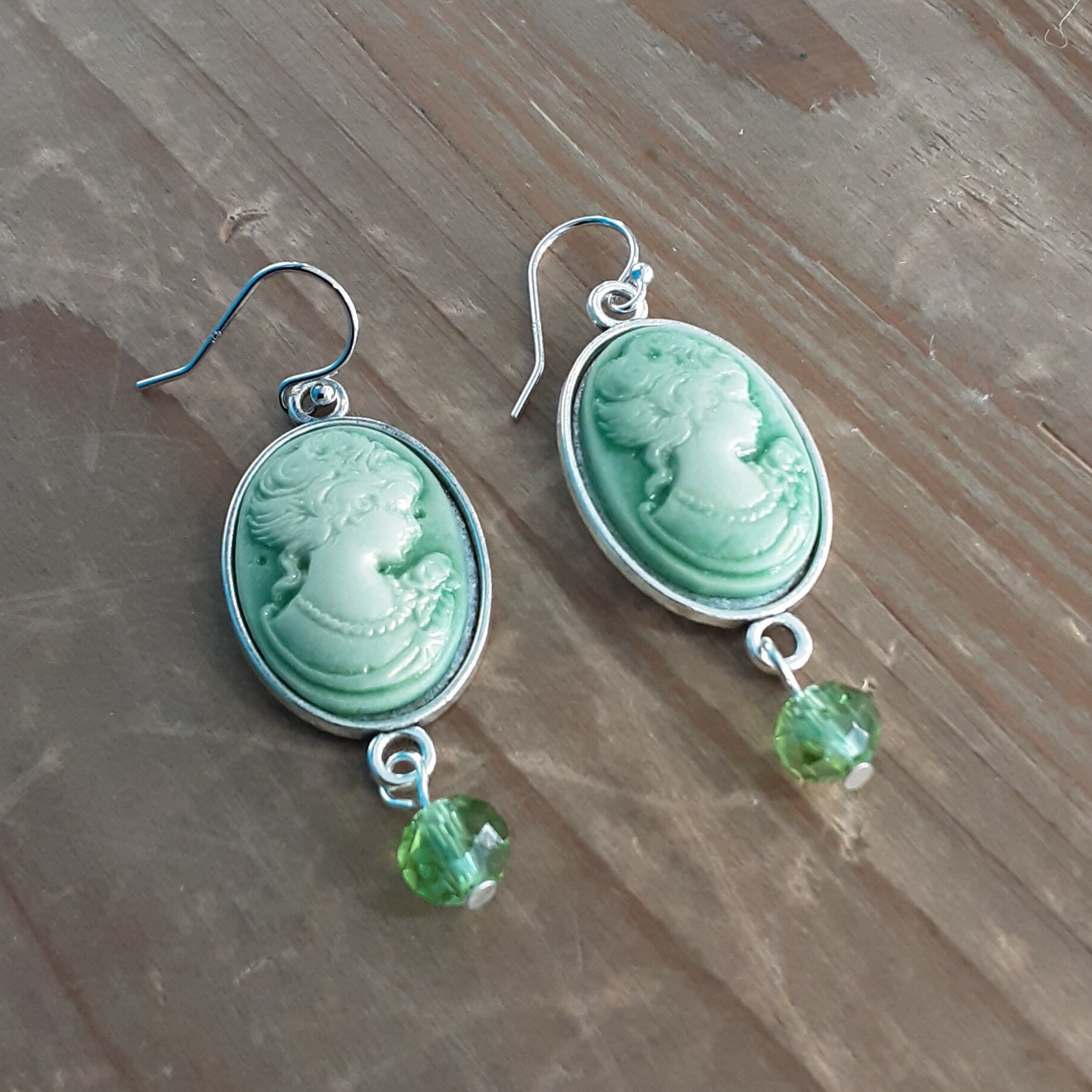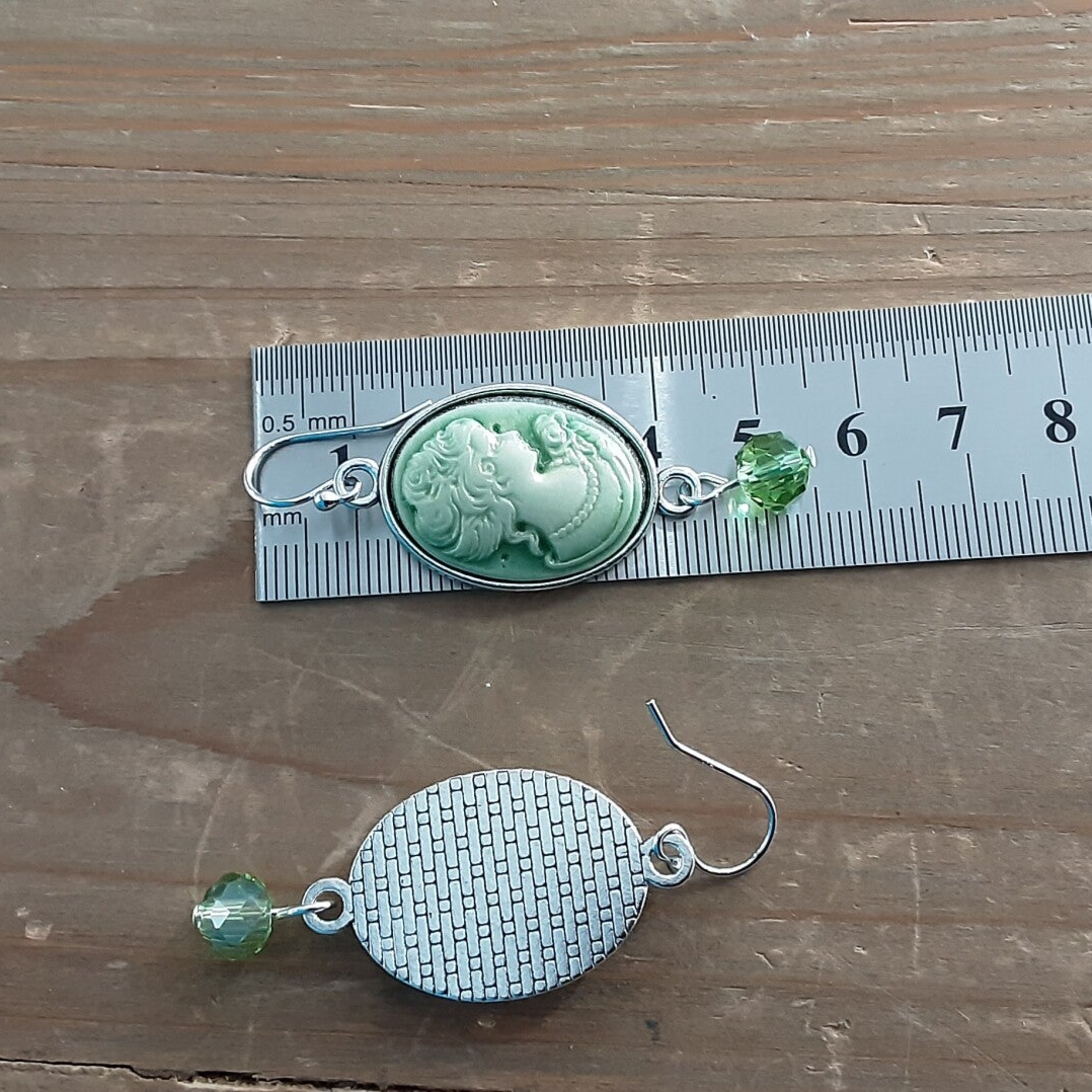 Boucles d'oreilles de création artisanale, composées de camées en résine opaque 25x18 mm de teinte vert clair et blanc, plateaux en alliage de style tibétain sans cadmium et sans plomb, tiges en métal, perles de cristal à facettes de teinte vert et crochets d'oreilles en Argent 925/1000 (Argent sterling).