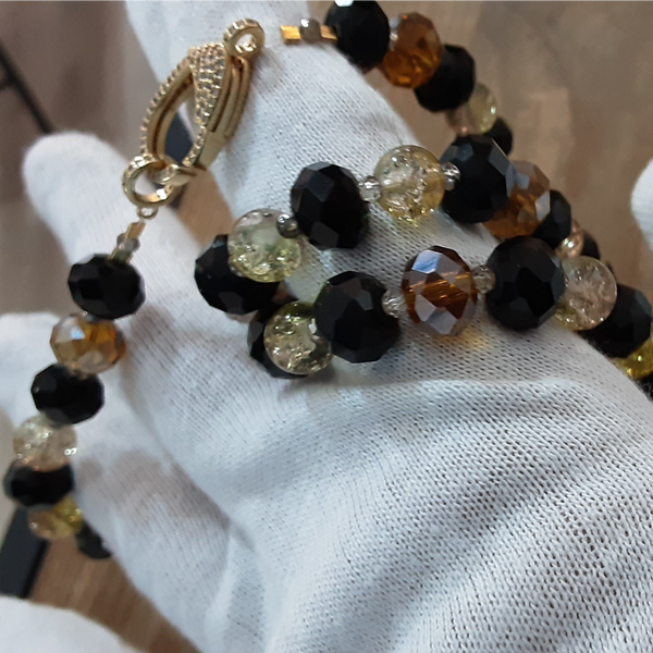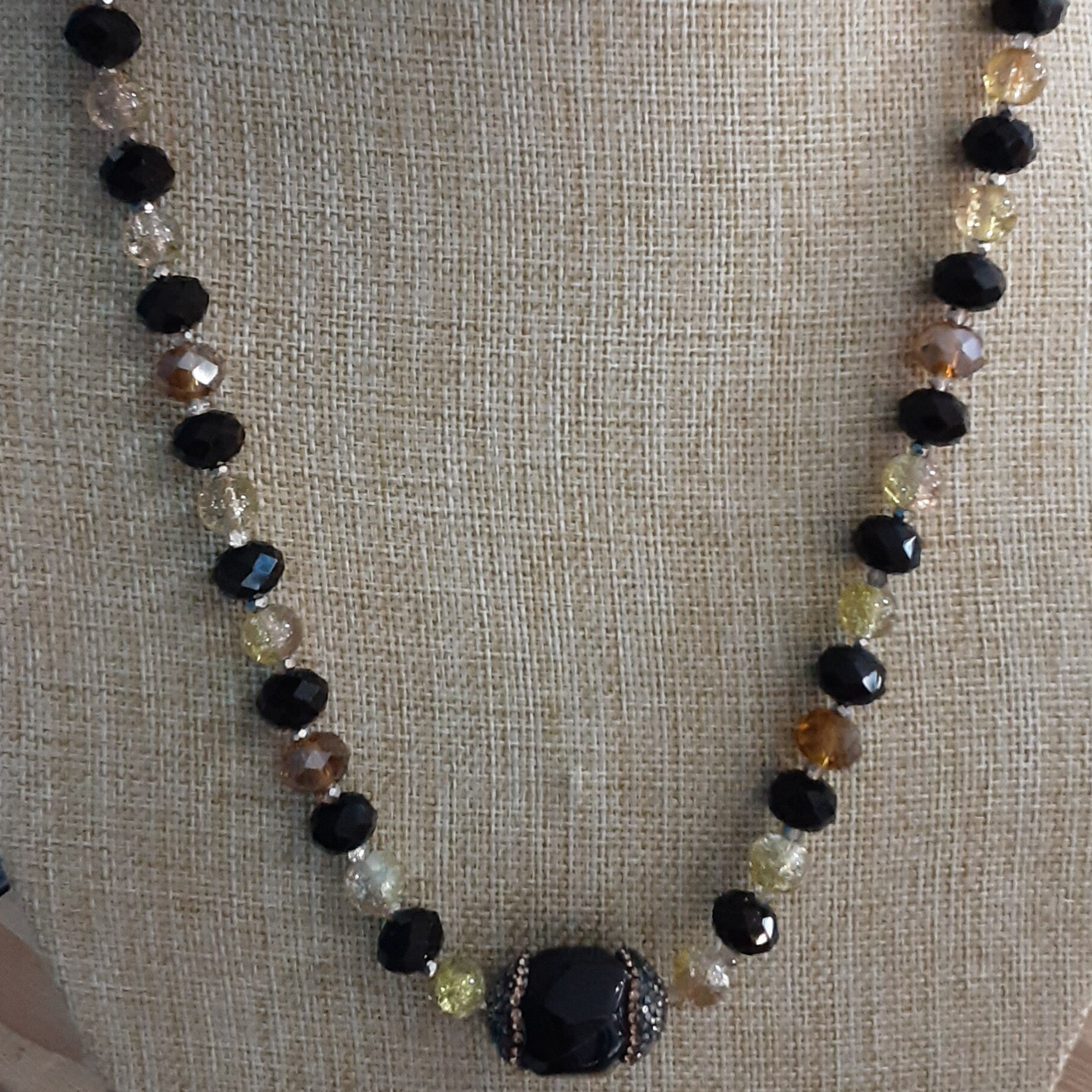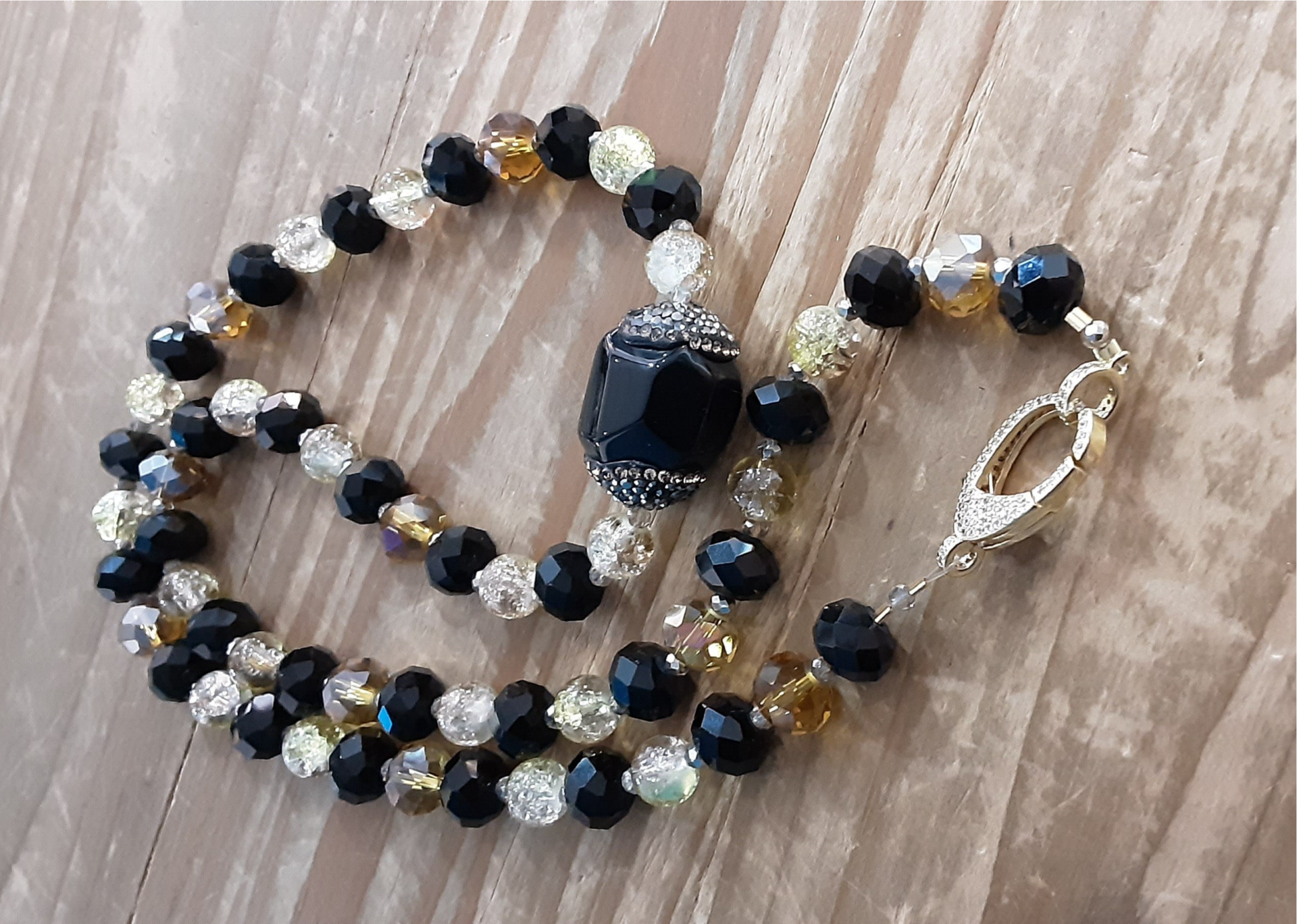 Collier mi-long composé de perles de verre Tchèque taillées à facettes de teinte miel et noir, perles de verre soufflé sur feuille d'or jaune et or, perles de cristal beige doré, perle d'onyx noir au centre, fermoir mouston en Laiton recouvert placage or et strass.