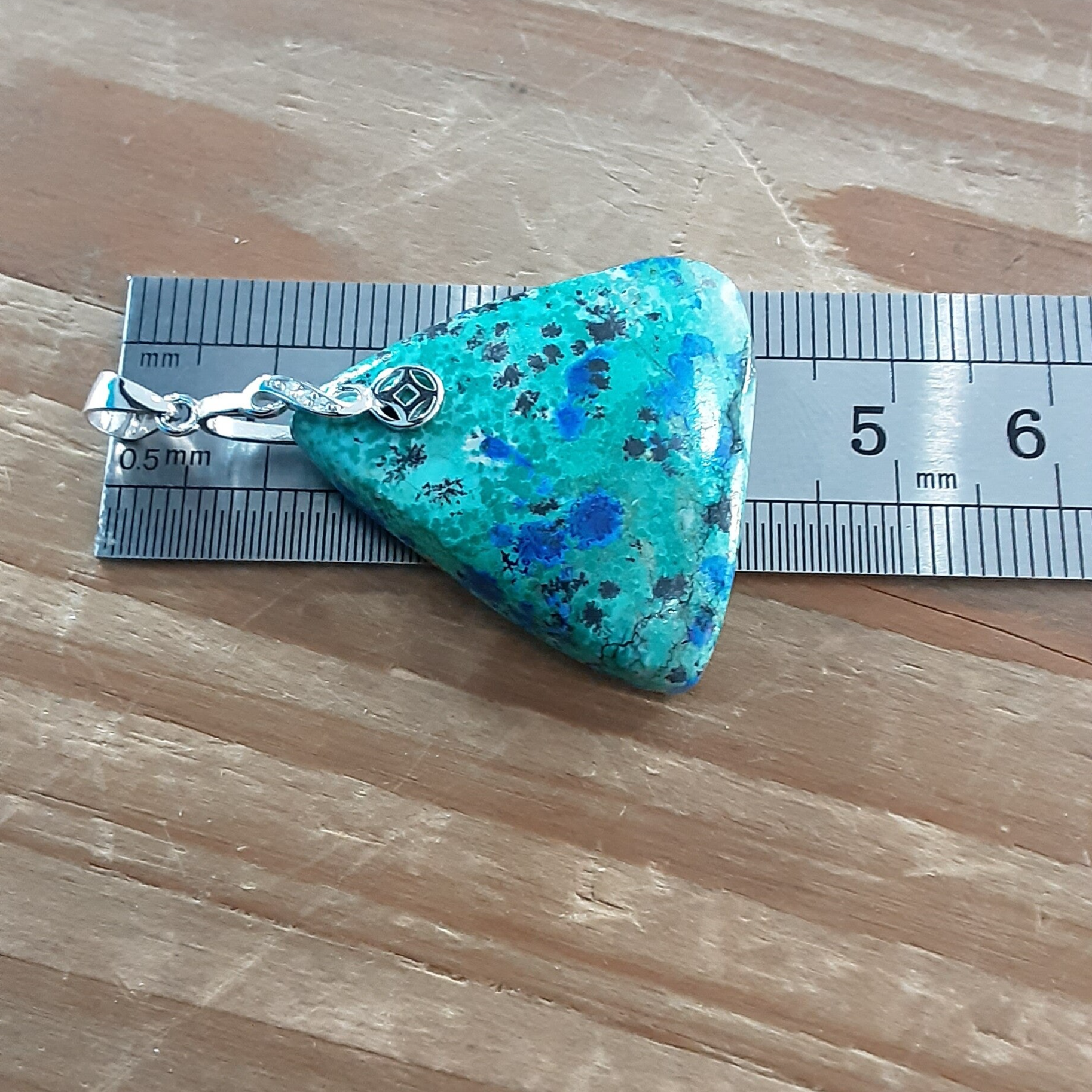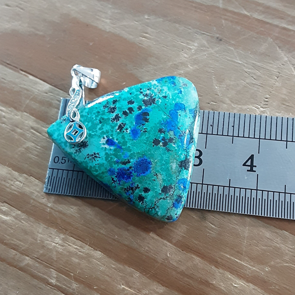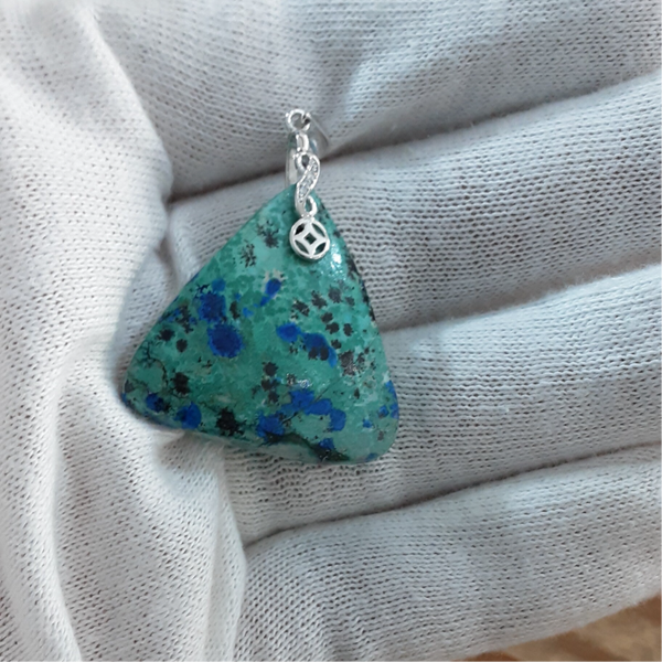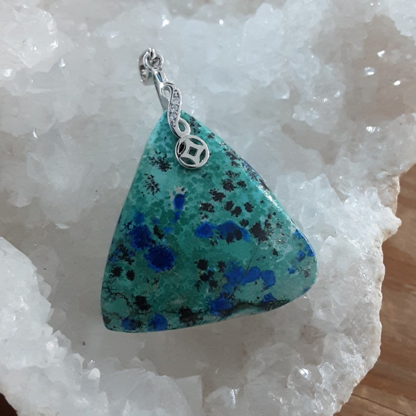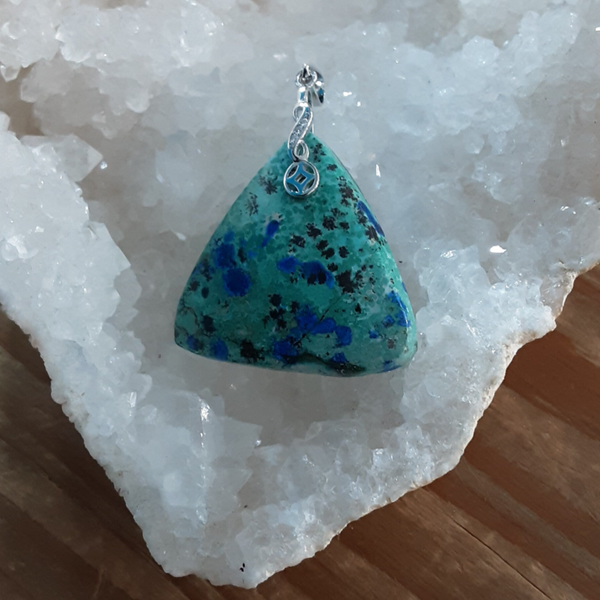 Création artisanale par Bijoux Que gemmes composé d'un cabochon +/- triangulaire en Shattuckite naturelle vert très clair et nodules d'Azurite bleu nuit, bélière en Argent 925/1000 ornée de Zirconiums.
