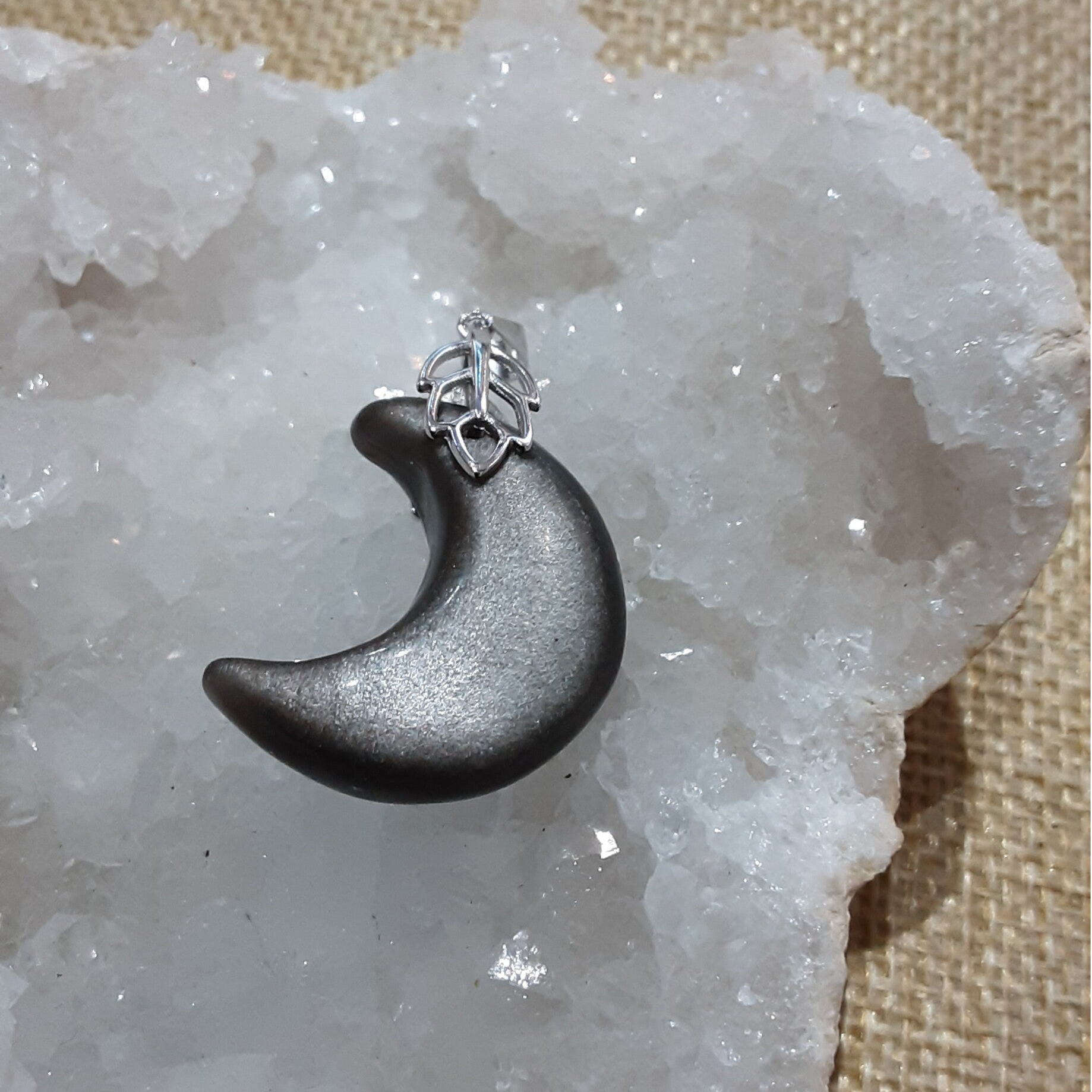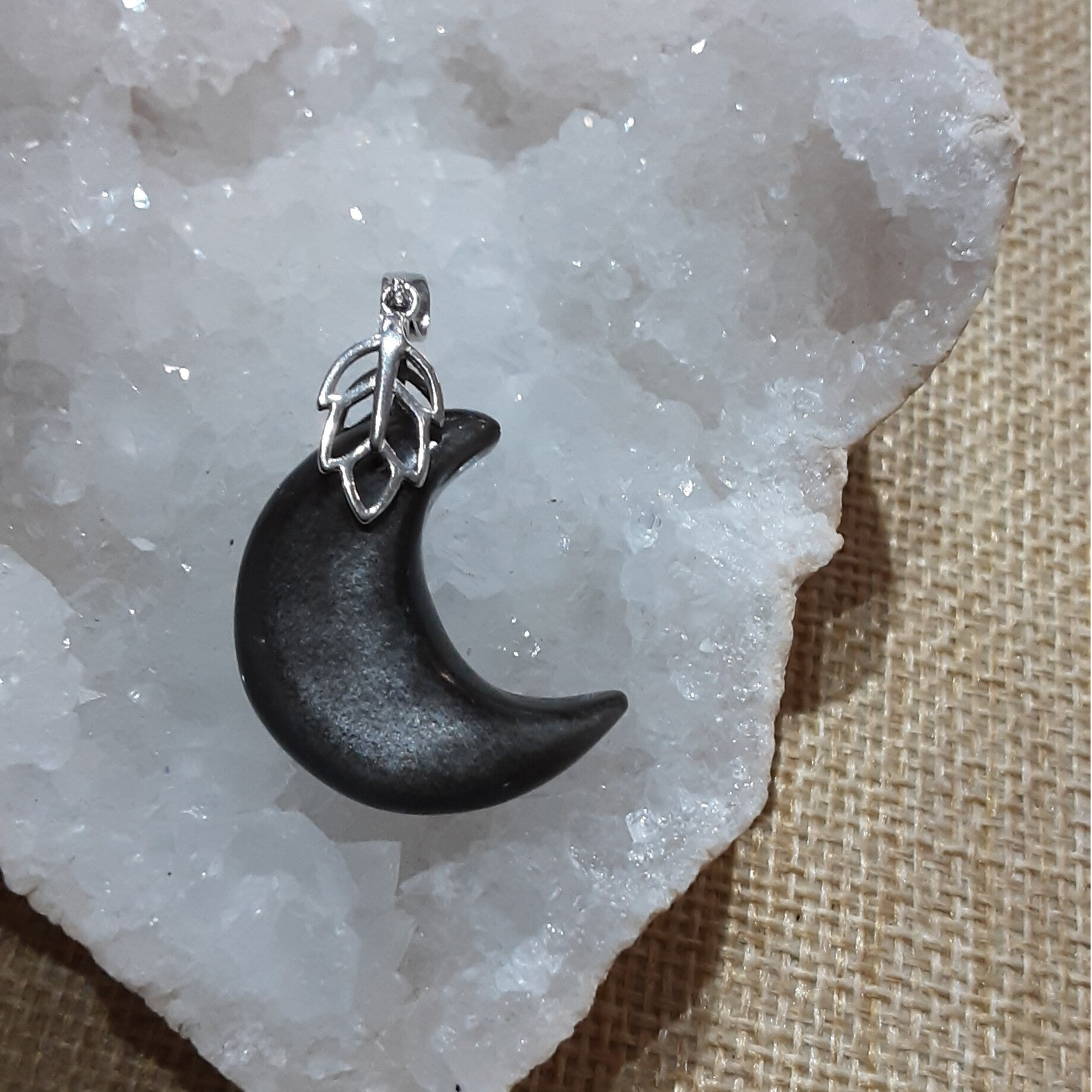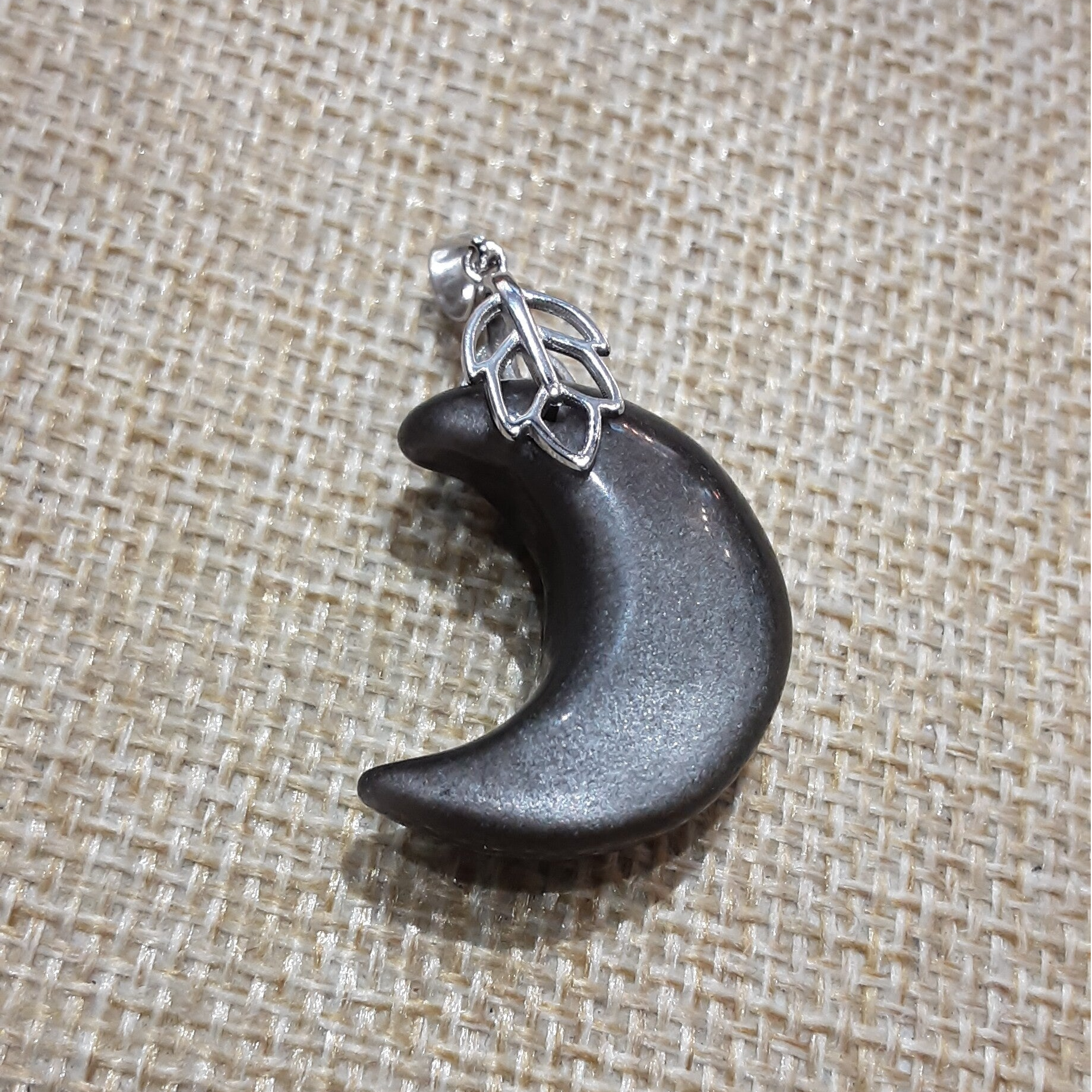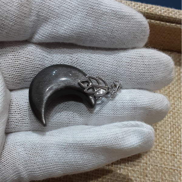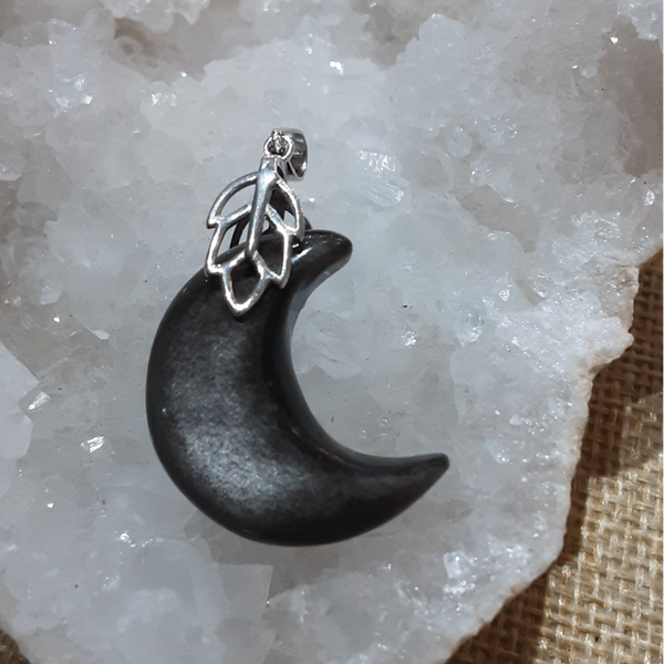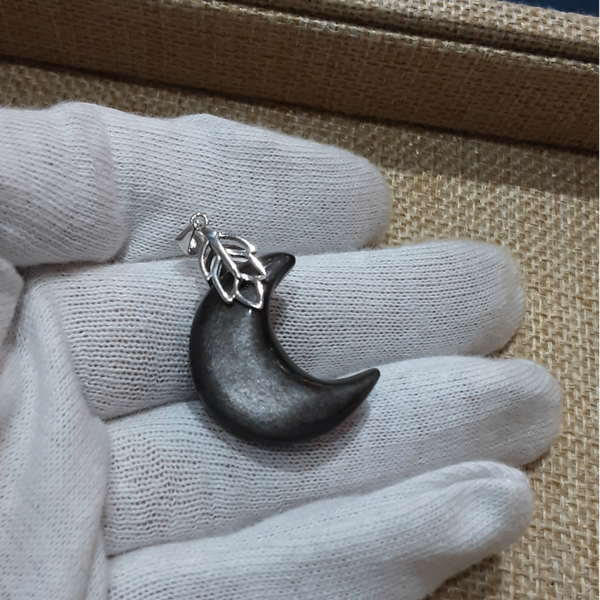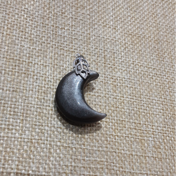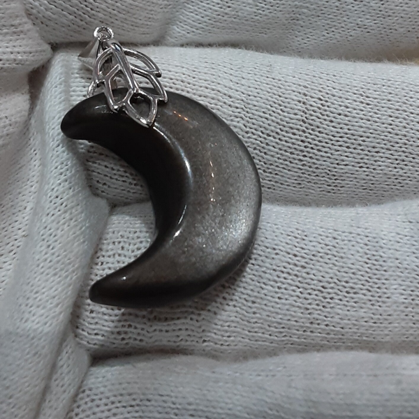 Pendentif de forme Lune en pierre naturelle : Obsidienne Argentée et sa bélière feuille en Argent 925/1000 (Argent dit massif ou sterling). Création artisanale par Bijoux Que Gemmes, modèle unique. Dimensions sur photos.