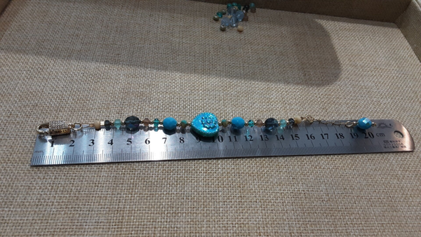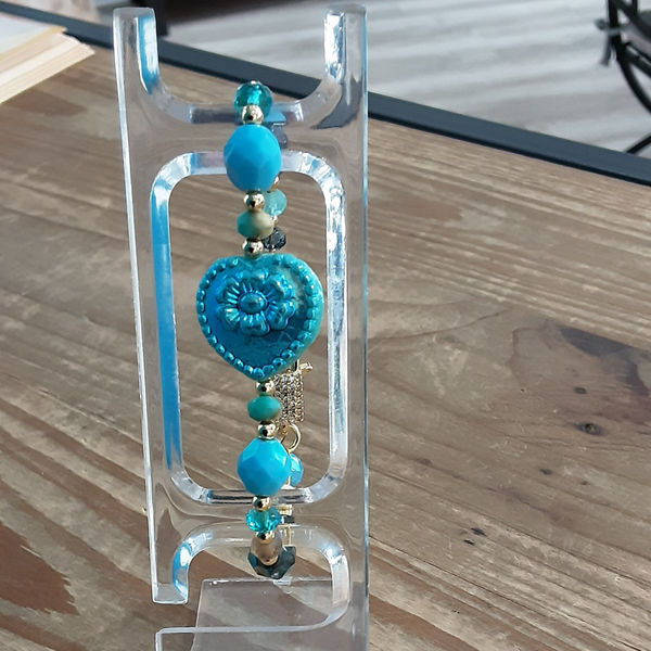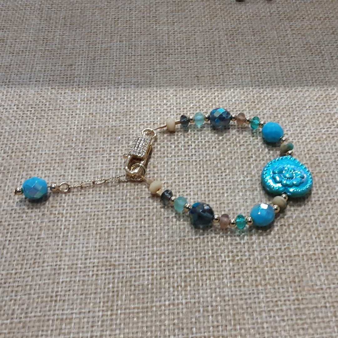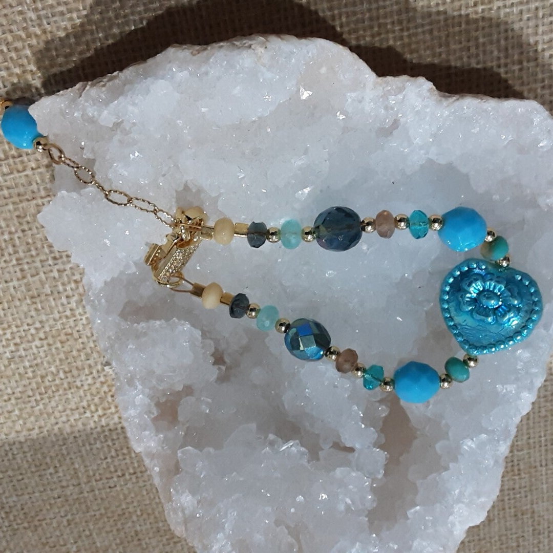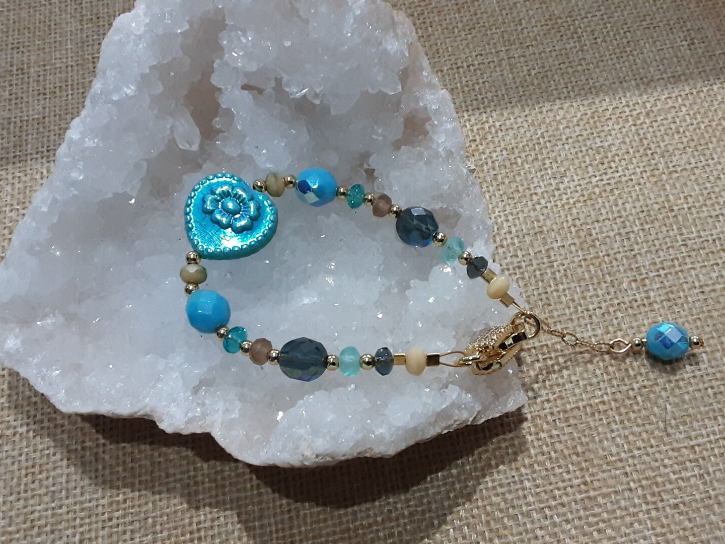 Composition artisanale pour ce magnifique bracelet en perles de verre Tchèque (perles de verre soufflées au feu, sans plomb) en dégradé de bleu tropical, comme une invitation au voyage, perles intercalaires en Laiton doré, fermoir mousqueton en Laiton Plaqué or 18K, tour de poignet +/- 15 cm + chaînette de rallonge +/- 3 cm en Laiton doré. Modèle unique.