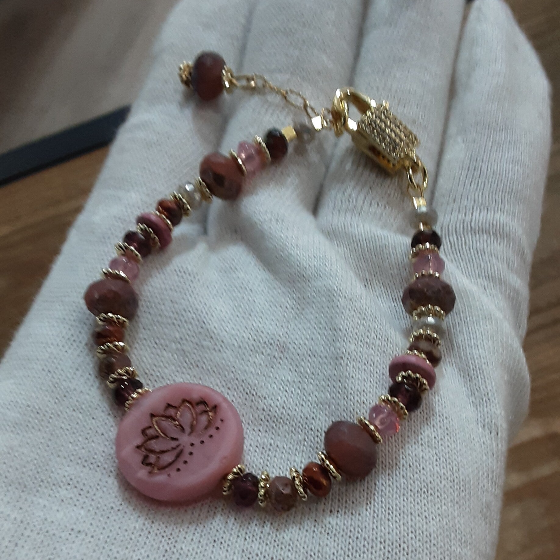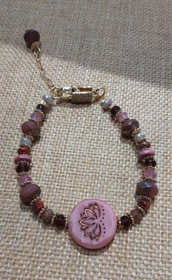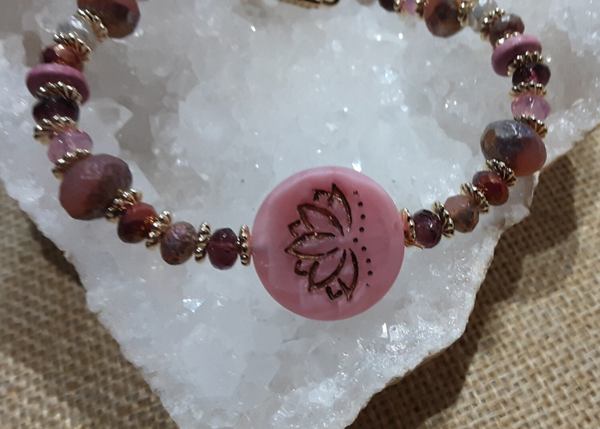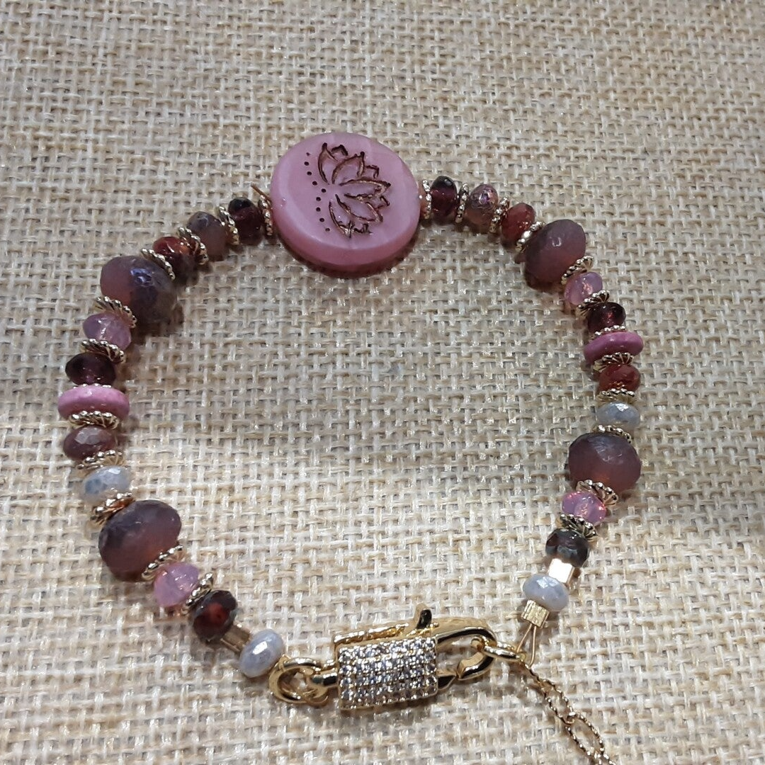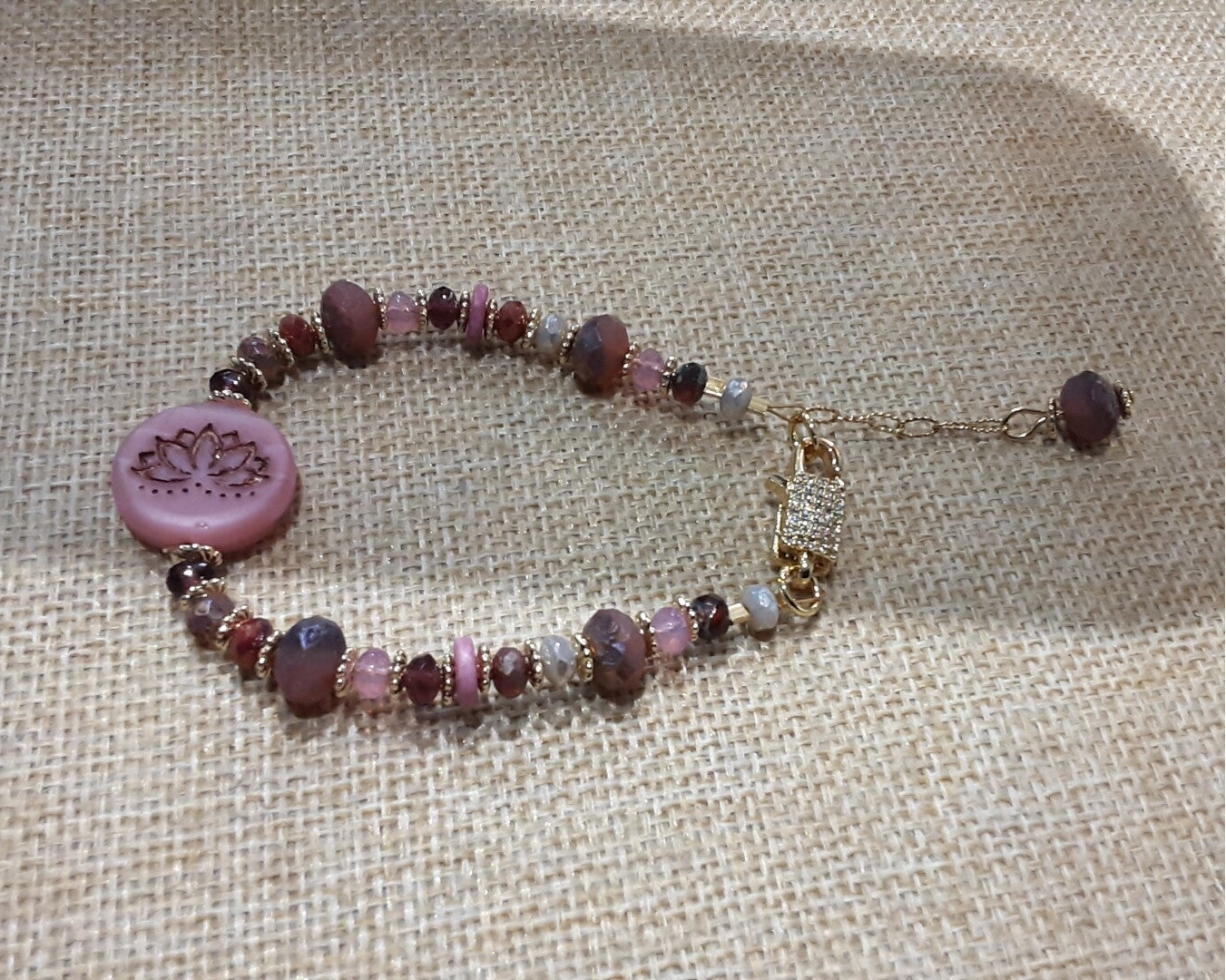 Composition artisanale pour ce magnifique bracelet en perles de verre Tchèque (perles de verre soufflées au feu, sans plomb) en dégradé de rose, perles intercalaires en Laiton doré, fermoir mousqueton en Laiton Plaqué or 18K, tour de poignet +/- 16cm + chaînette de rallonge +/- 3 cm en Laiton doré. Modèle unique.