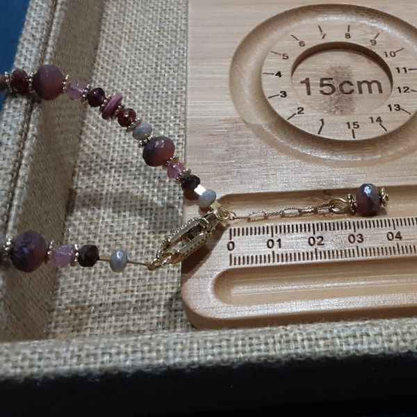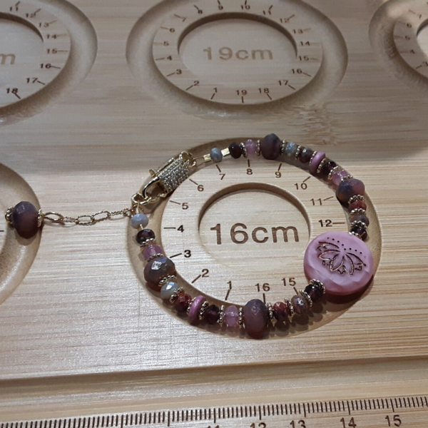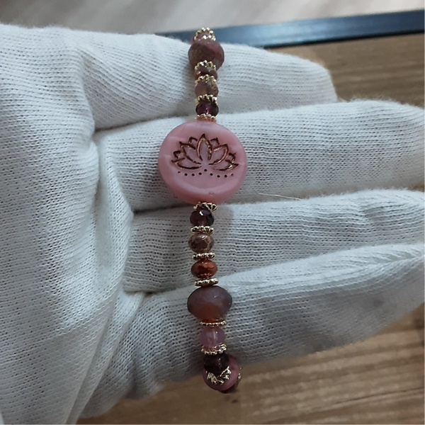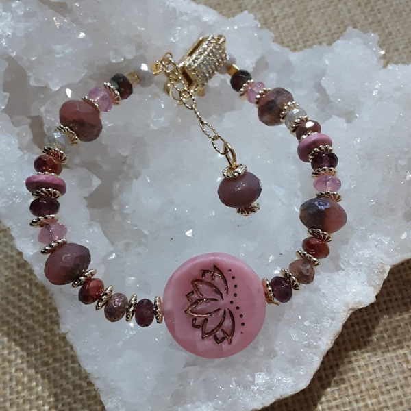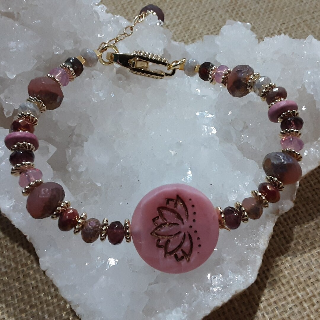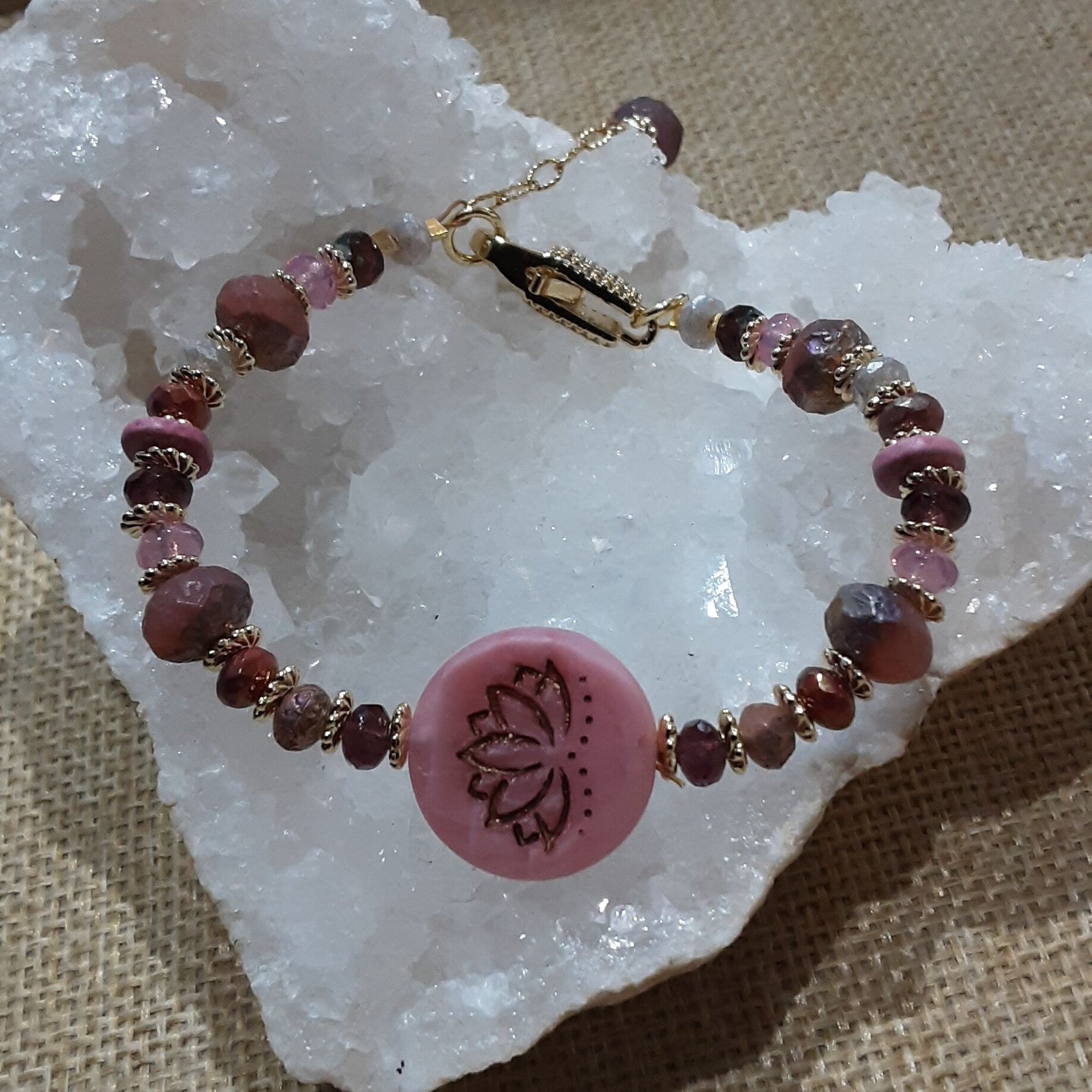 Composition artisanale pour ce magnifique bracelet en perles de verre Tchèque (perles de verre soufflées au feu, sans plomb) en dégradé de rose, perles intercalaires en Laiton doré, fermoir mousqueton en Laiton Plaqué or 18K, tour de poignet +/- 16cm + chaînette de rallonge +/- 3 cm en Laiton doré. Modèle unique.