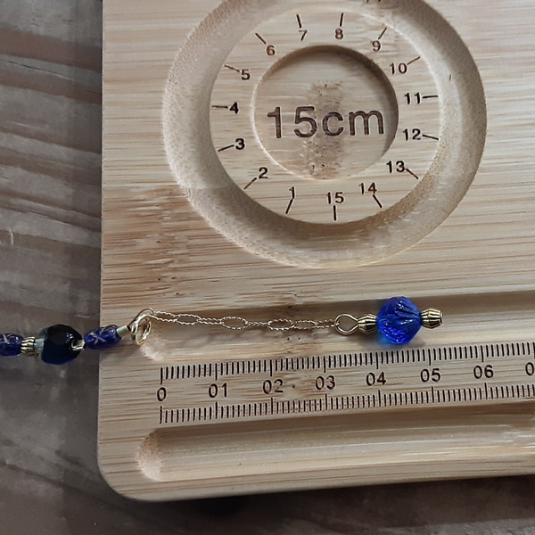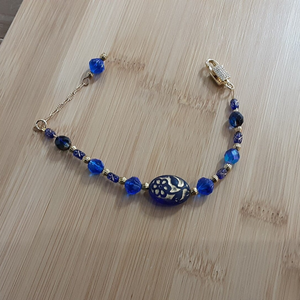 Joli bracelet de confection artisanale en perles de verre Tchèque de couleur bleu nuit et perles de Laiton doré, fermoir mousqueton en Laiton Plaqué Or et Zirconiums + ralonge +/- 3 cm en Laiton doré. Dimensions sur photos. Tour de poignet +/- 16 cm. Modèle unique.