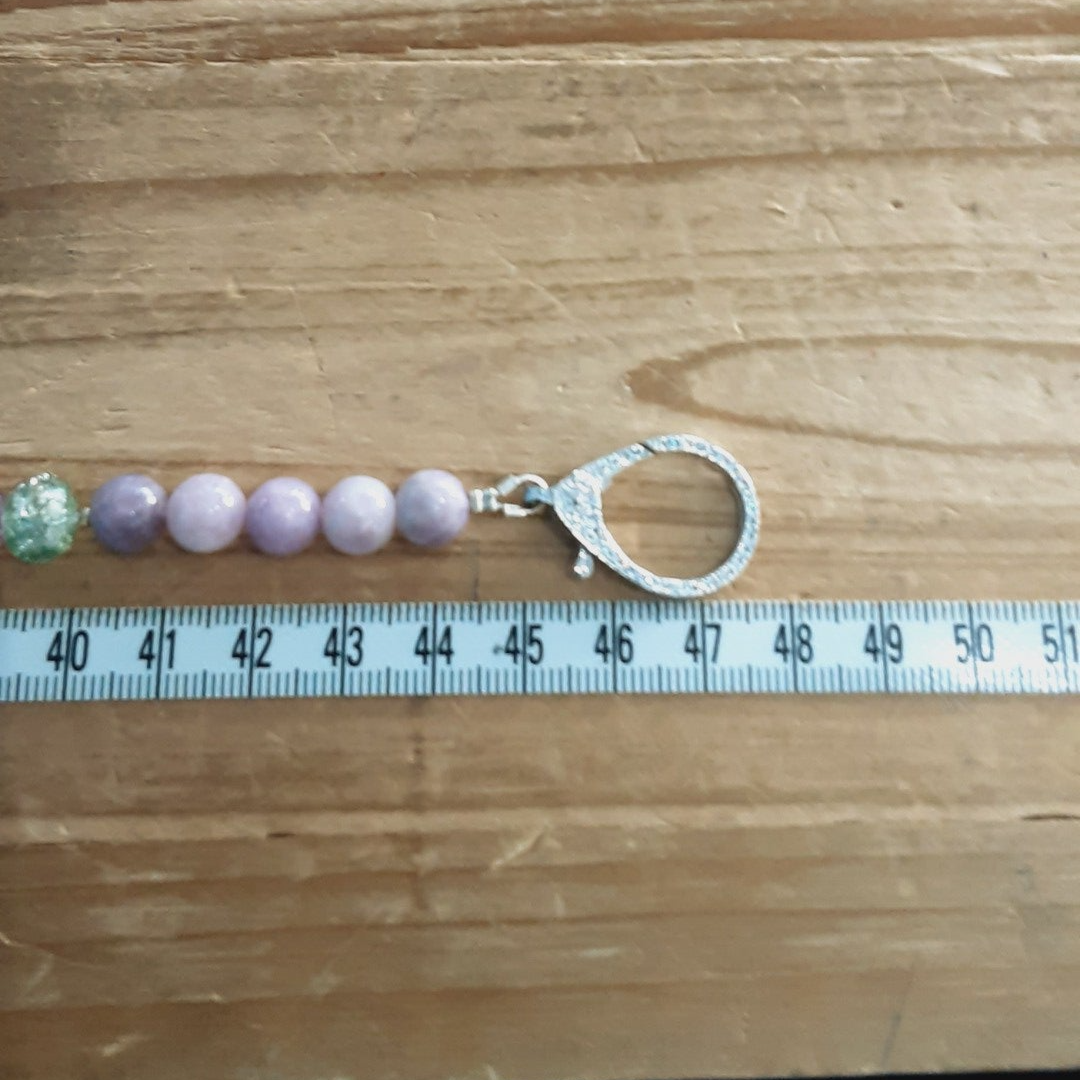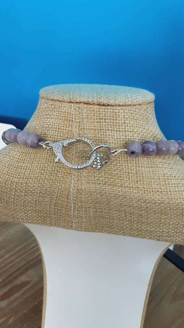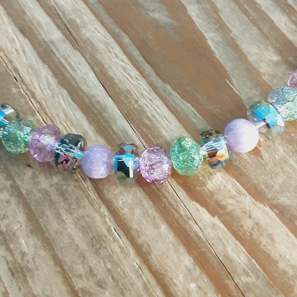 Ravissant collier ras de cou aux couleurs chatoyantes et printanières. Il est composé de perles rondes de Lépidolite naturelle de couleur mauve/lilas, perles de verre Tchèque taillées à facettes 10x8 mm de couleur violine/vert et perles de Cristal irridescentes. Longueur du collier +/- 47 cm.