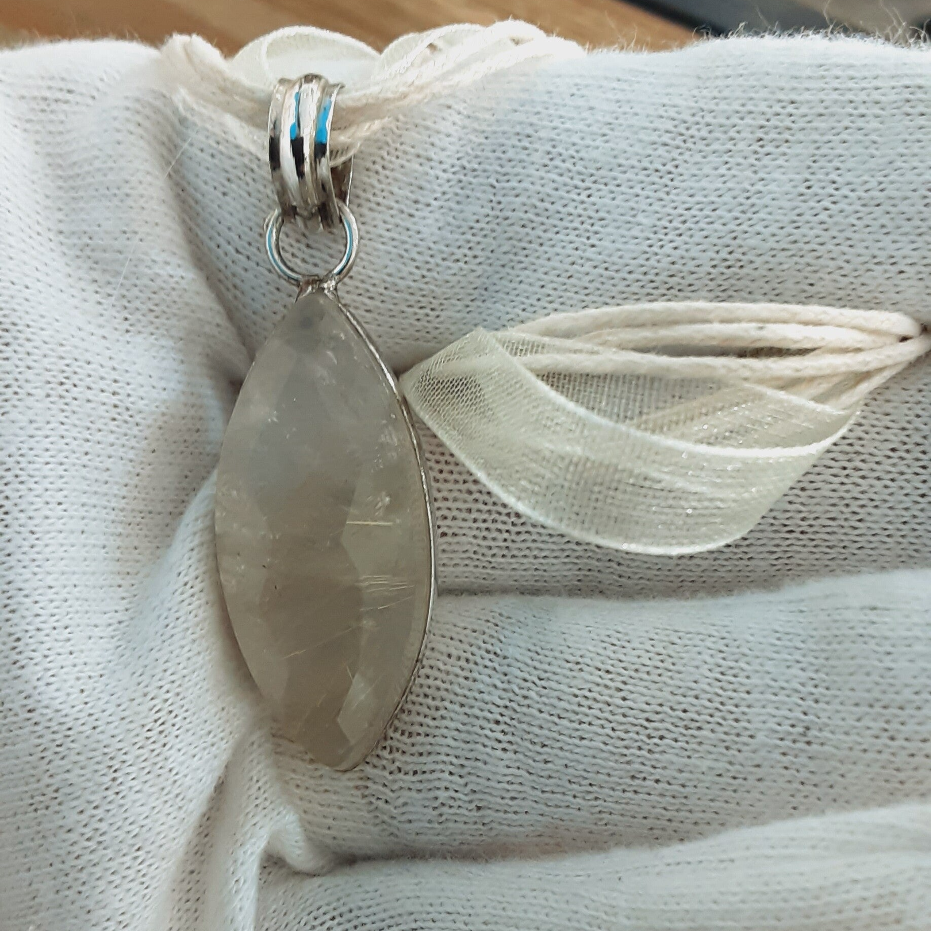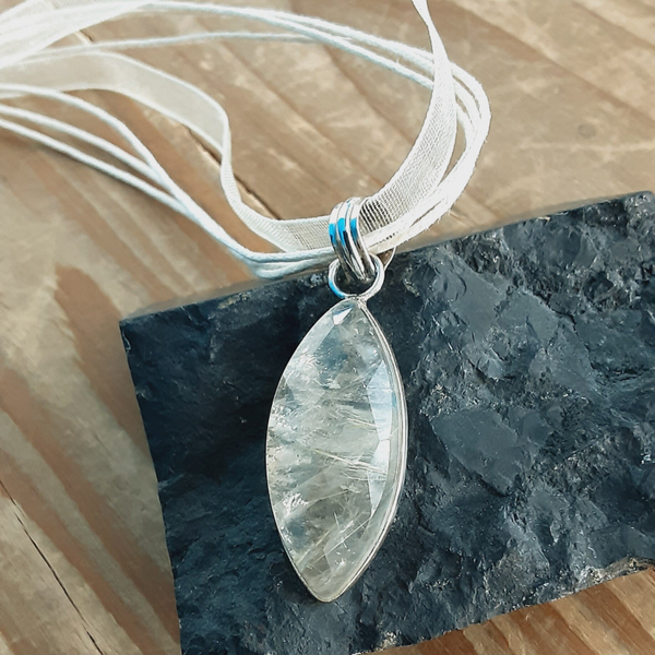 Ravissant pendentif en Quartz Rutile taillé à facettes, forme marquise, serti Argent 925/1000, bélière Argent 925/1000, livré avec son cordon assorti couleur champagne en coton ciré et organza, fermoir métal argenté. Modèle unique.