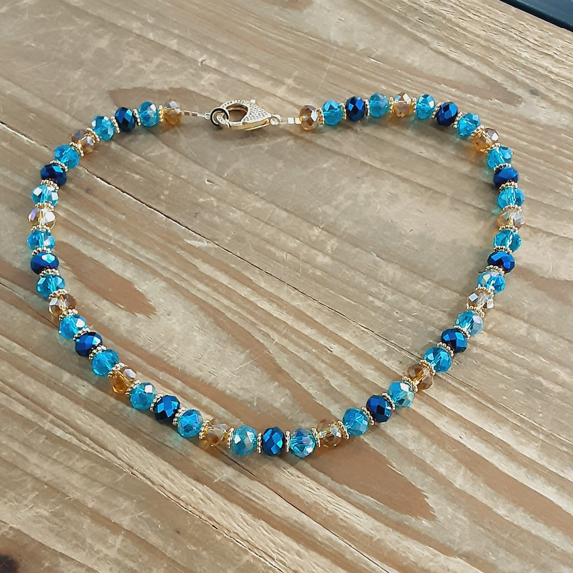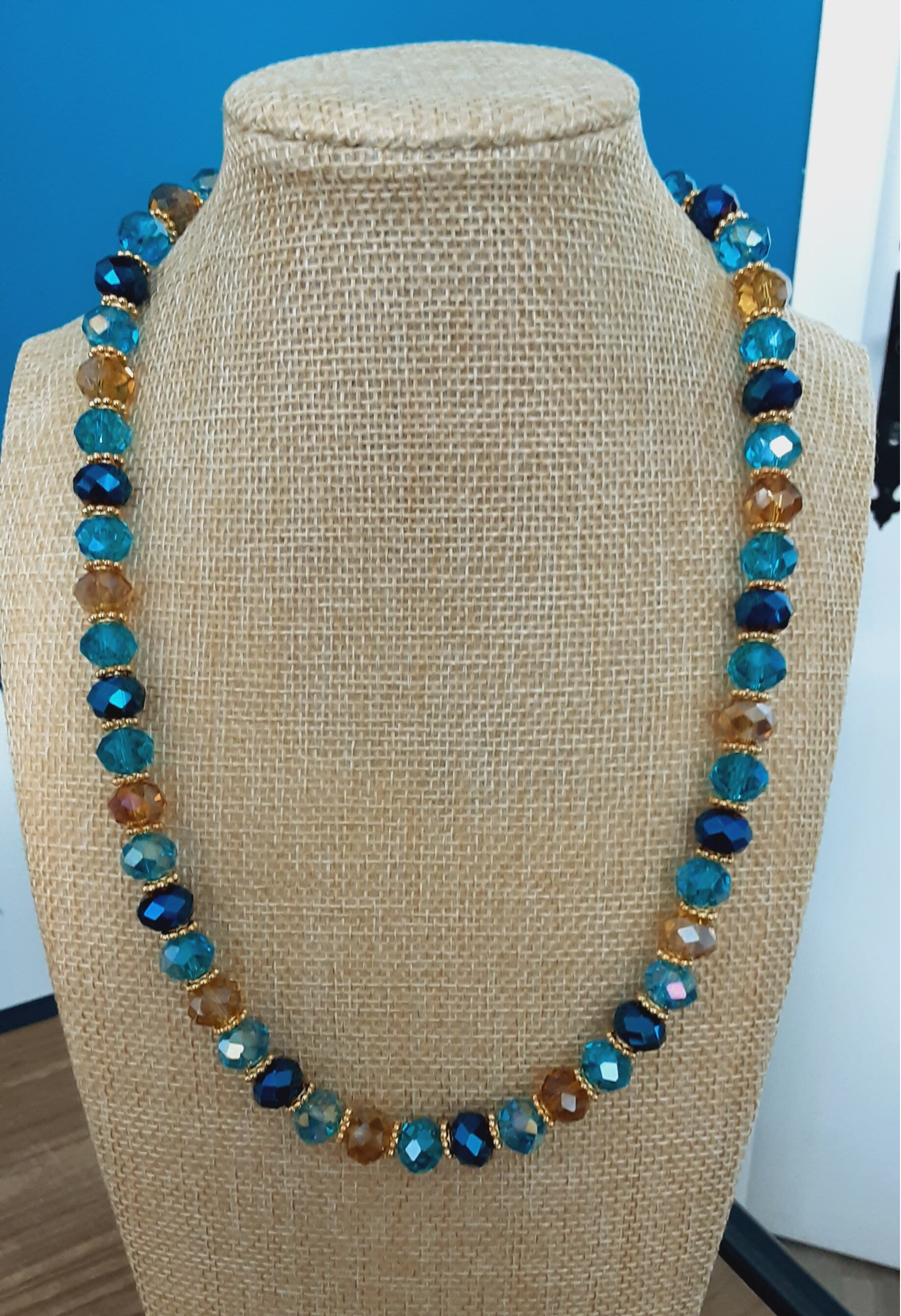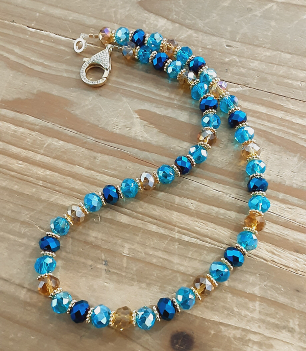 Collier ras de cou "Tara" en perles de verre Tchèque (verre soufflé) taillées à facettes de 10 x 8 mm, couleurs : bleu deux tons et miel doré, disques et fermoir mousqueton en Laiton doré sans cadmium, sans nickel et sans plomb. Zirconiums sur le fermoir. Très lumineux et très chic.
