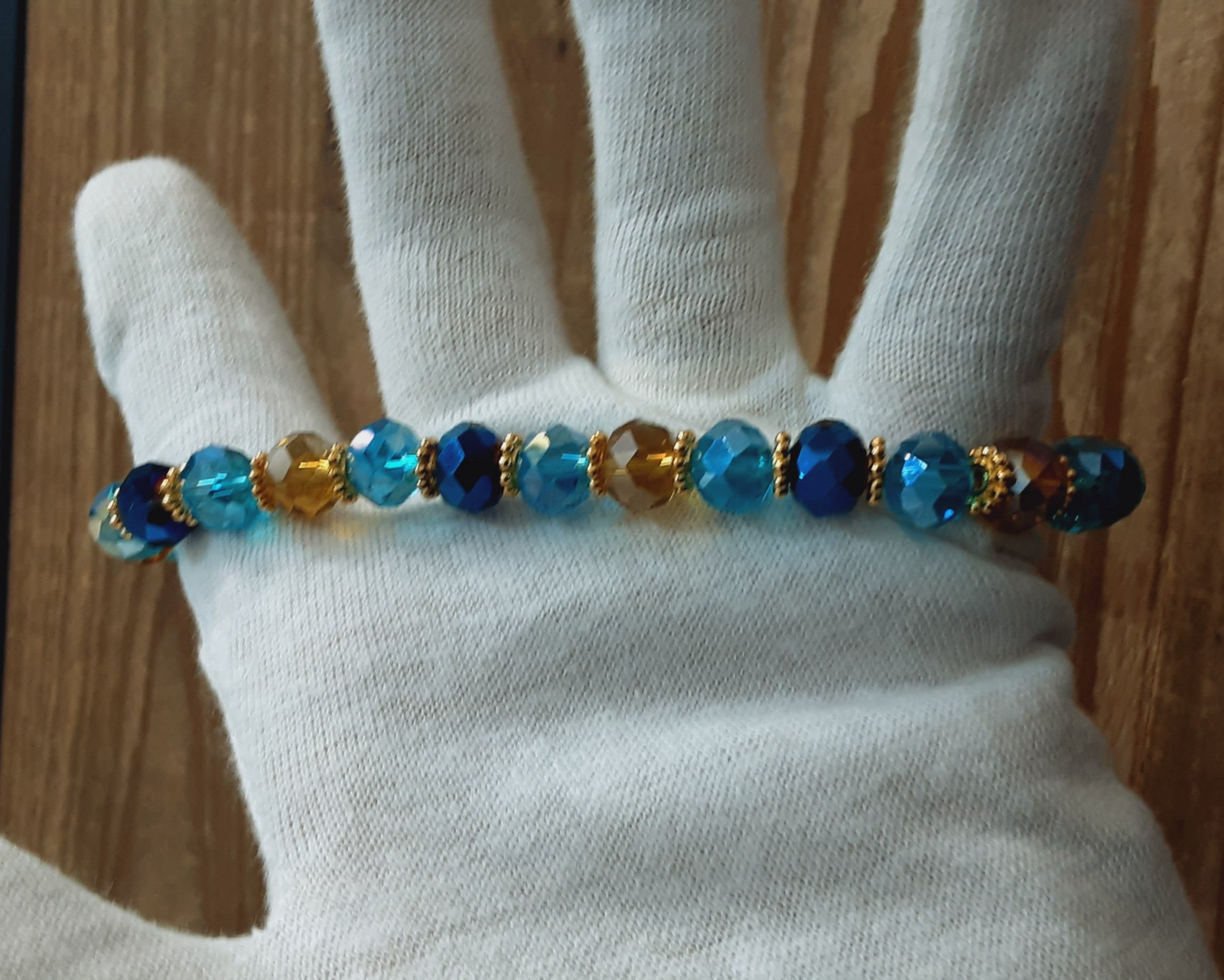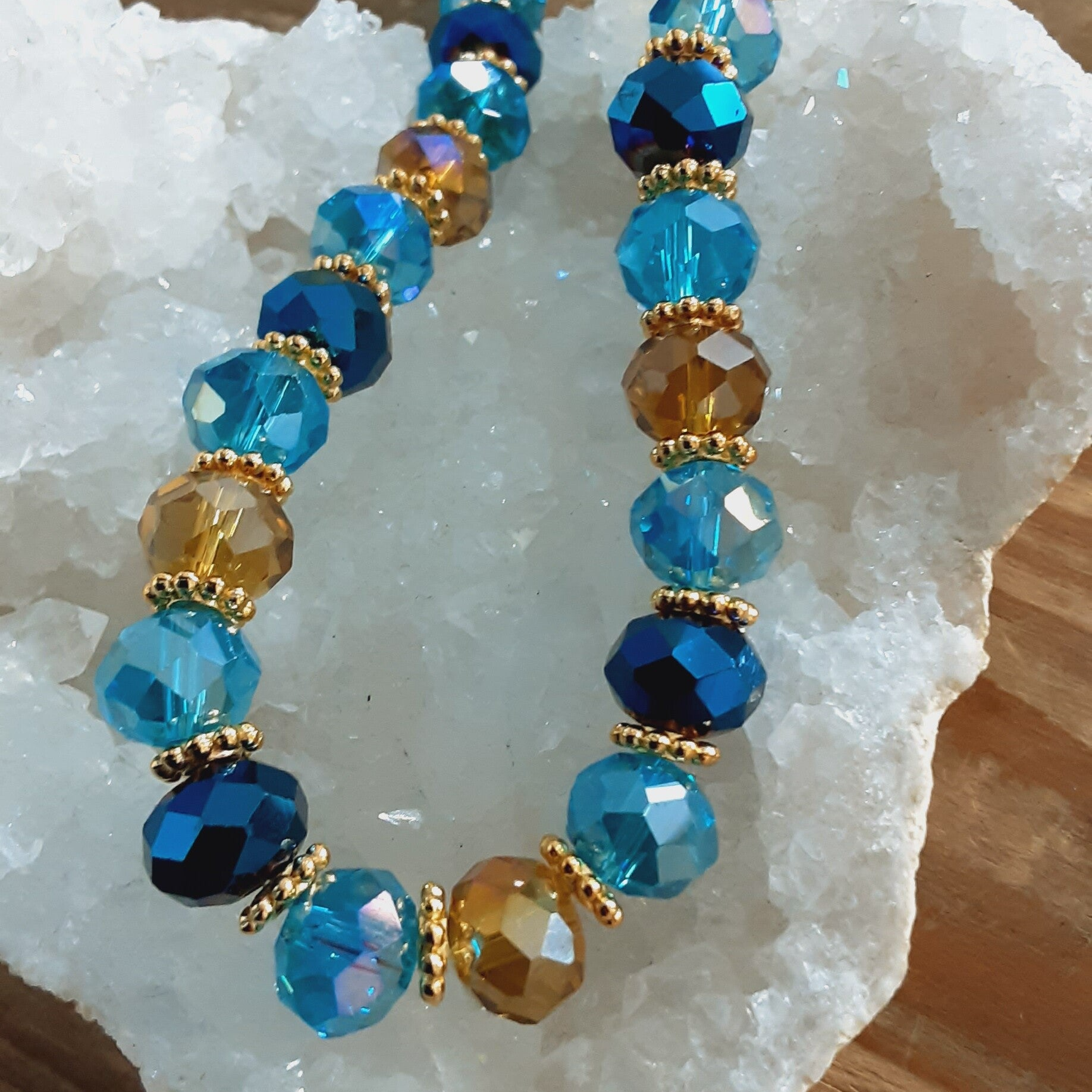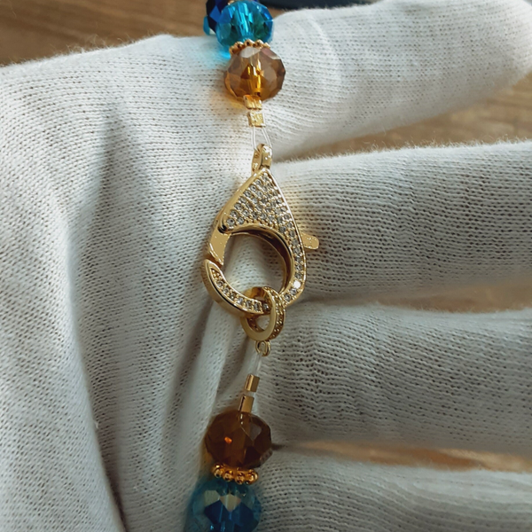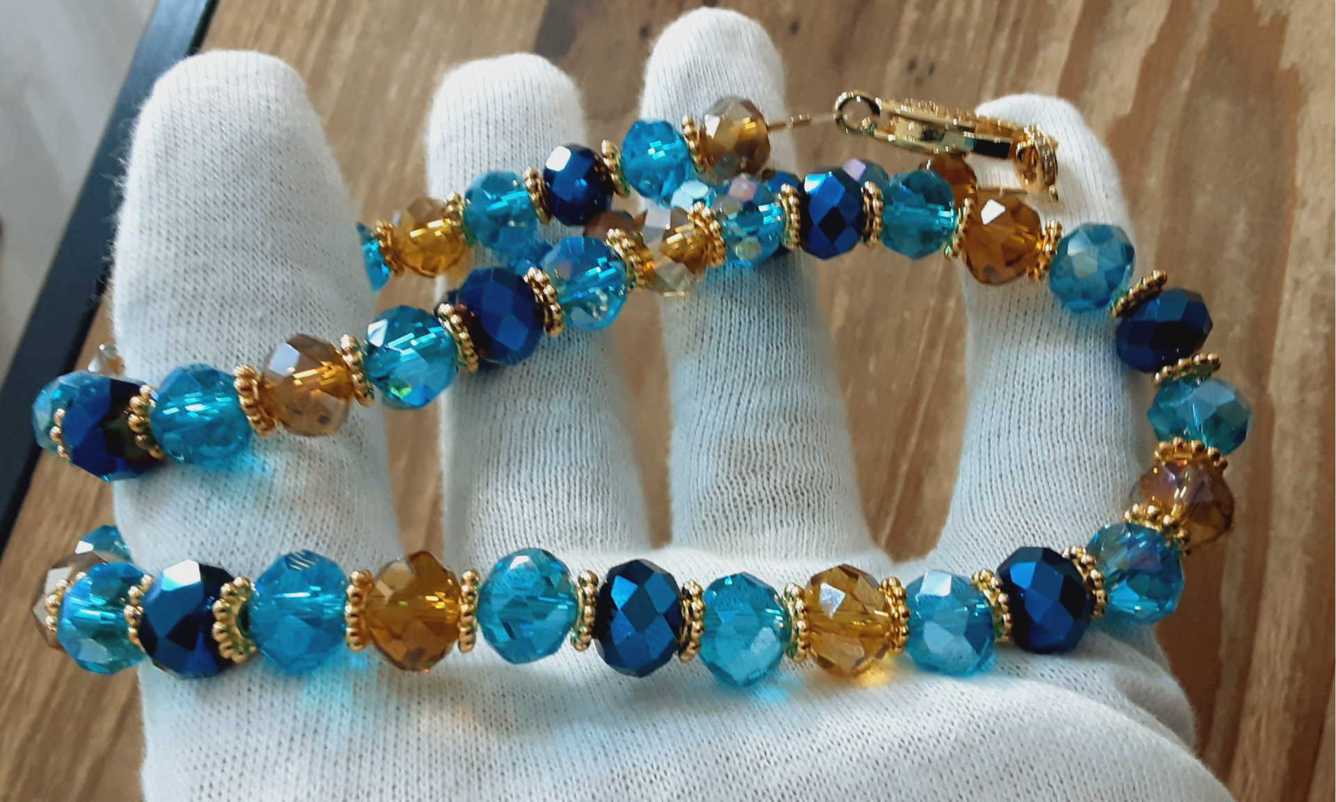 Collier ras de cou "Tara" en perles de verre Tchèque (verre soufflé) taillées à facettes de 10 x 8 mm, couleurs : bleu deux tons et miel doré, disques et fermoir mousqueton en Laiton doré sans cadmium, sans nickel et sans plomb. Zirconiums sur le fermoir. Très lumineux et très chic.