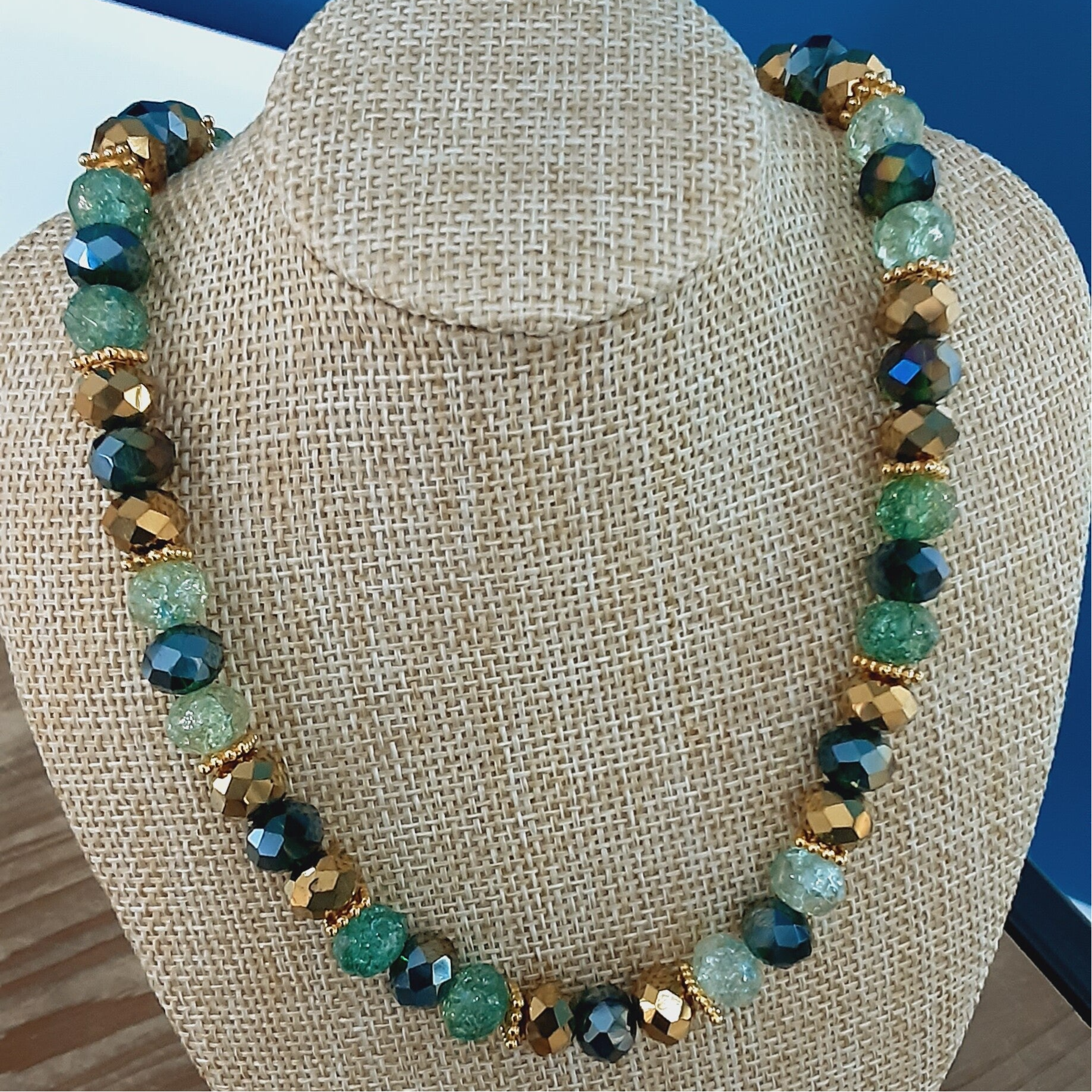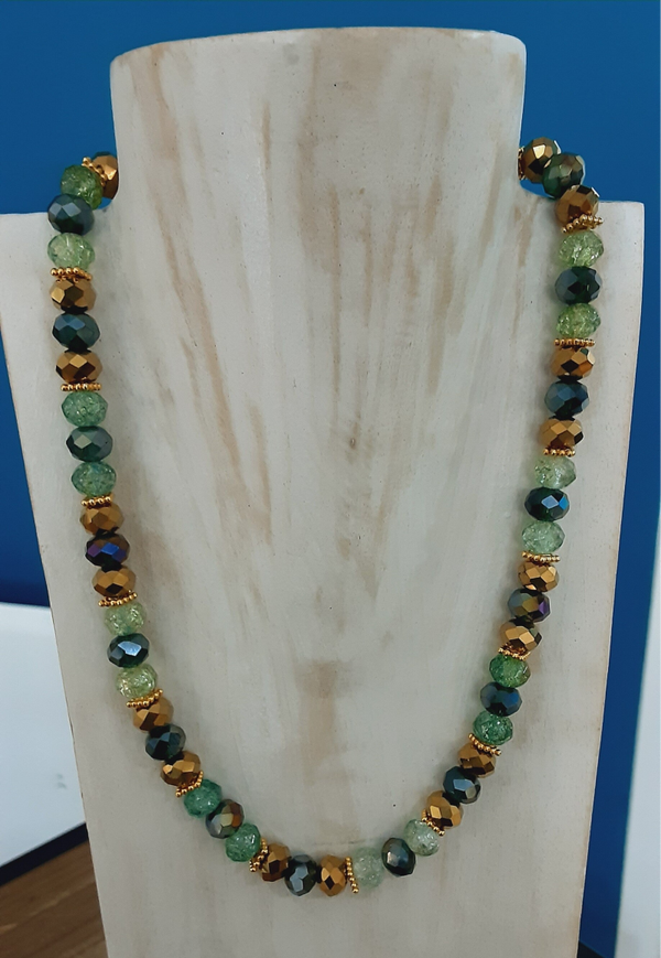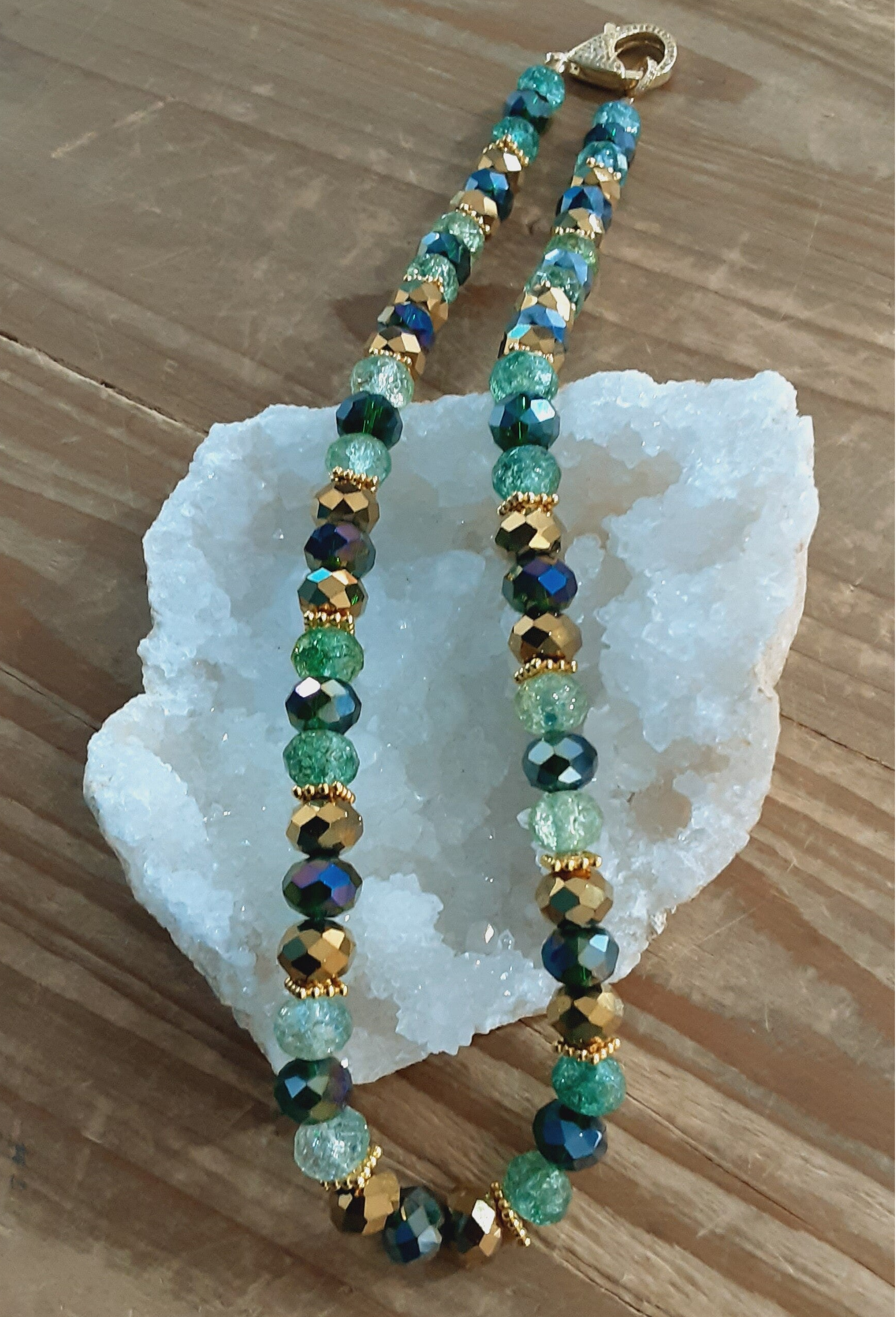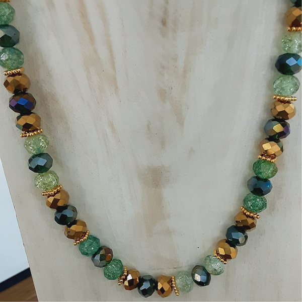 Ravissant ras de cou en perles de verre Tchèque (perles polies au feu manuellement), taillées à facettes, de 10 x 8 mm, nuances de différents vert et or antique, fermoir mousqueton Plaqué Or et Zirconiums.