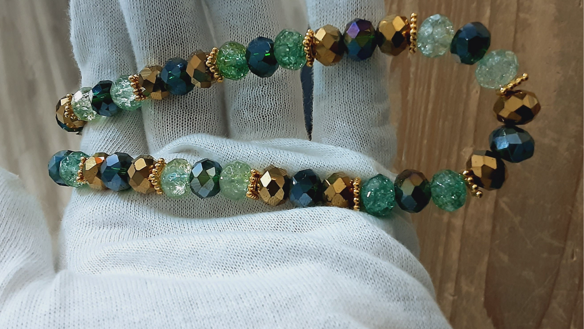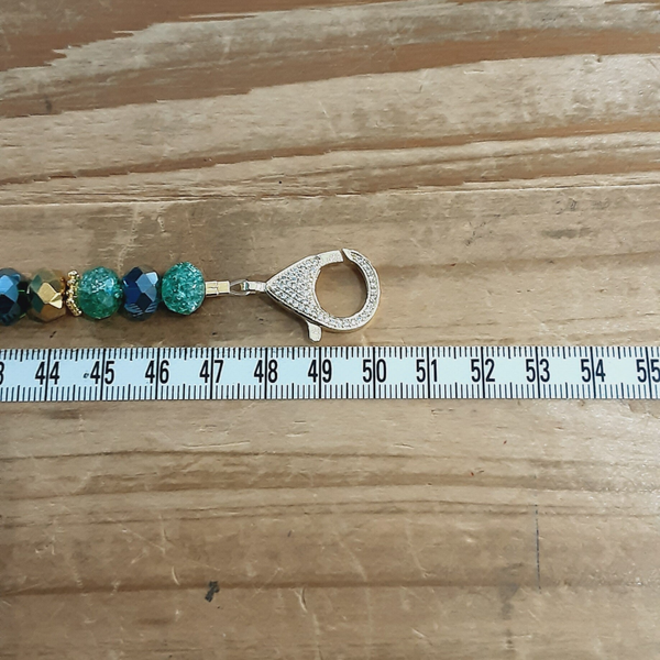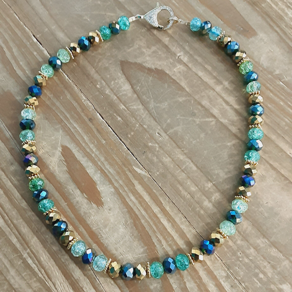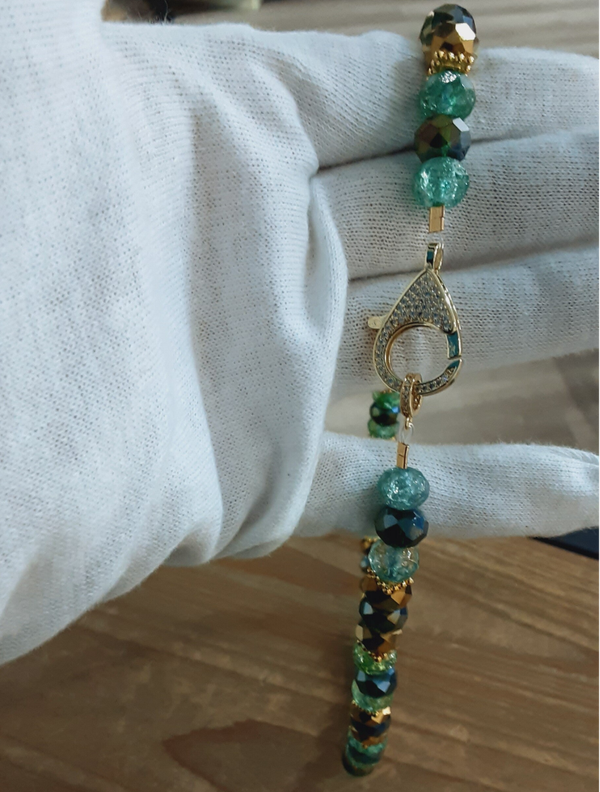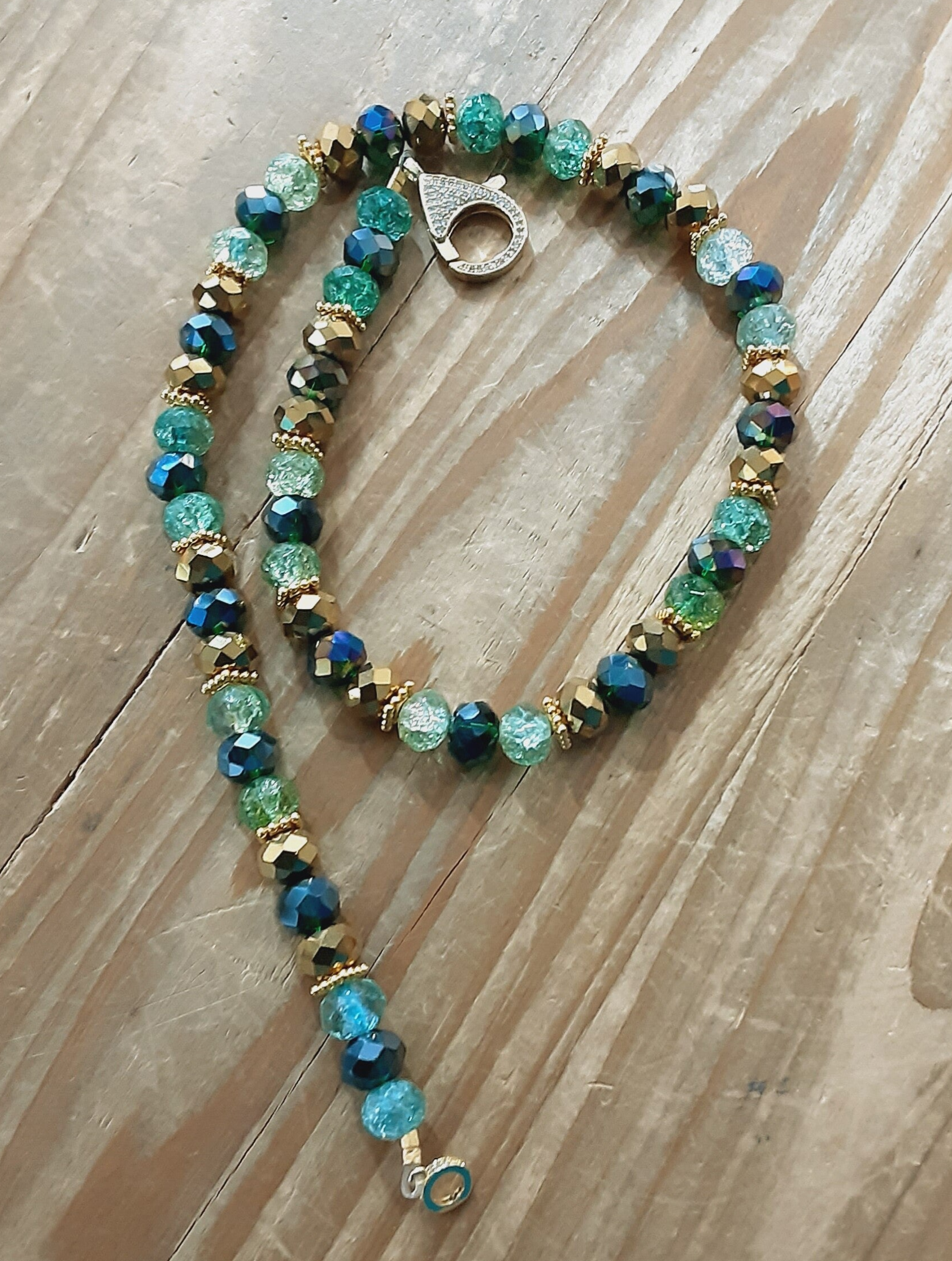 Ravissant ras de cou en perles de verre Tchèque (perles polies au feu manuellement), taillées à facettes, de 10 x 8 mm, nuances de différents vert et or antique, fermoir mousqueton Plaqué Or et Zirconiums.