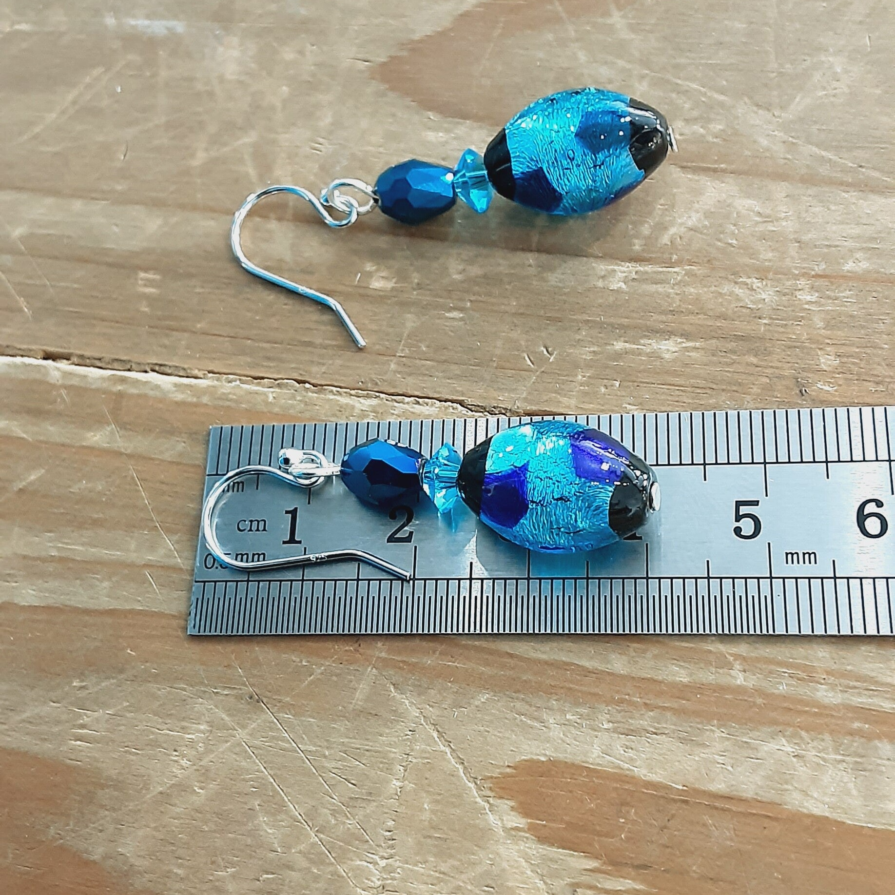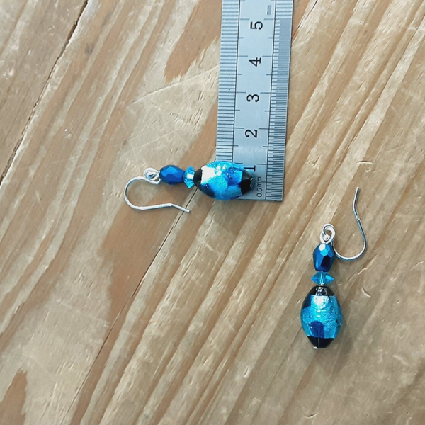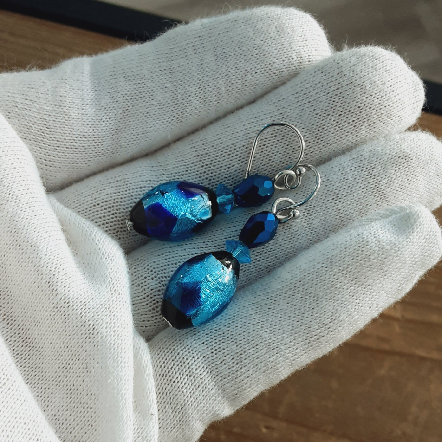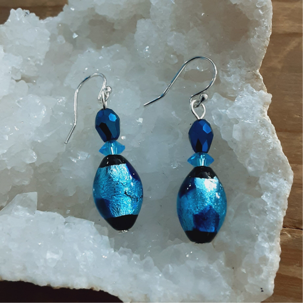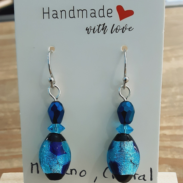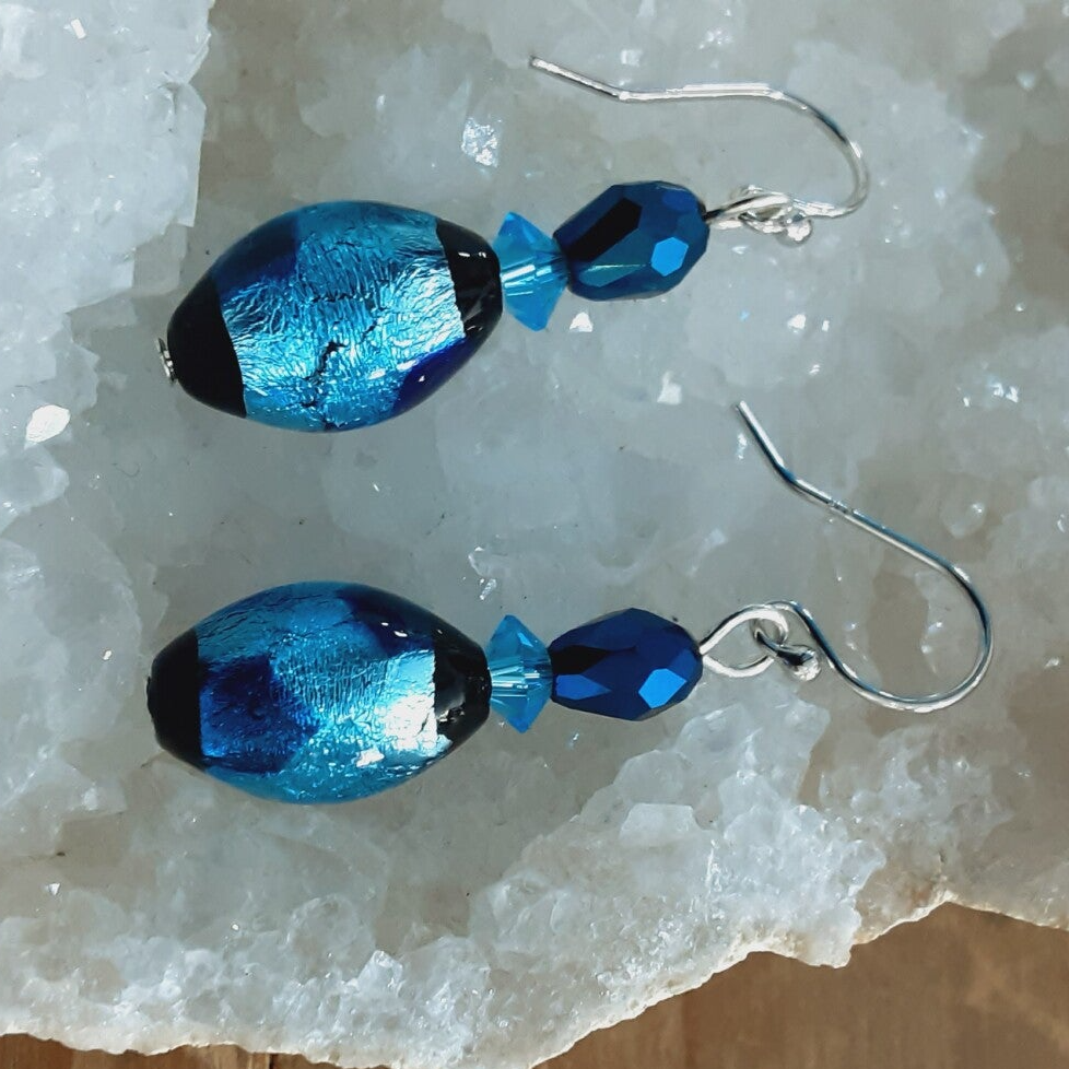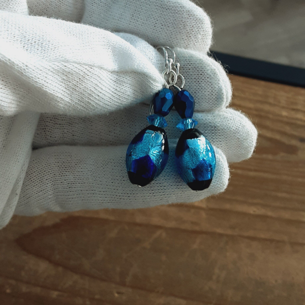 Ravissante paire de boucles d'oreilles composées de perles de Murano (perles de verre soufflé sur feuille d'Argent), perles de Cristal taillées à facettes, crochets d'oreilles en Argent massif (Argent 925/1000).