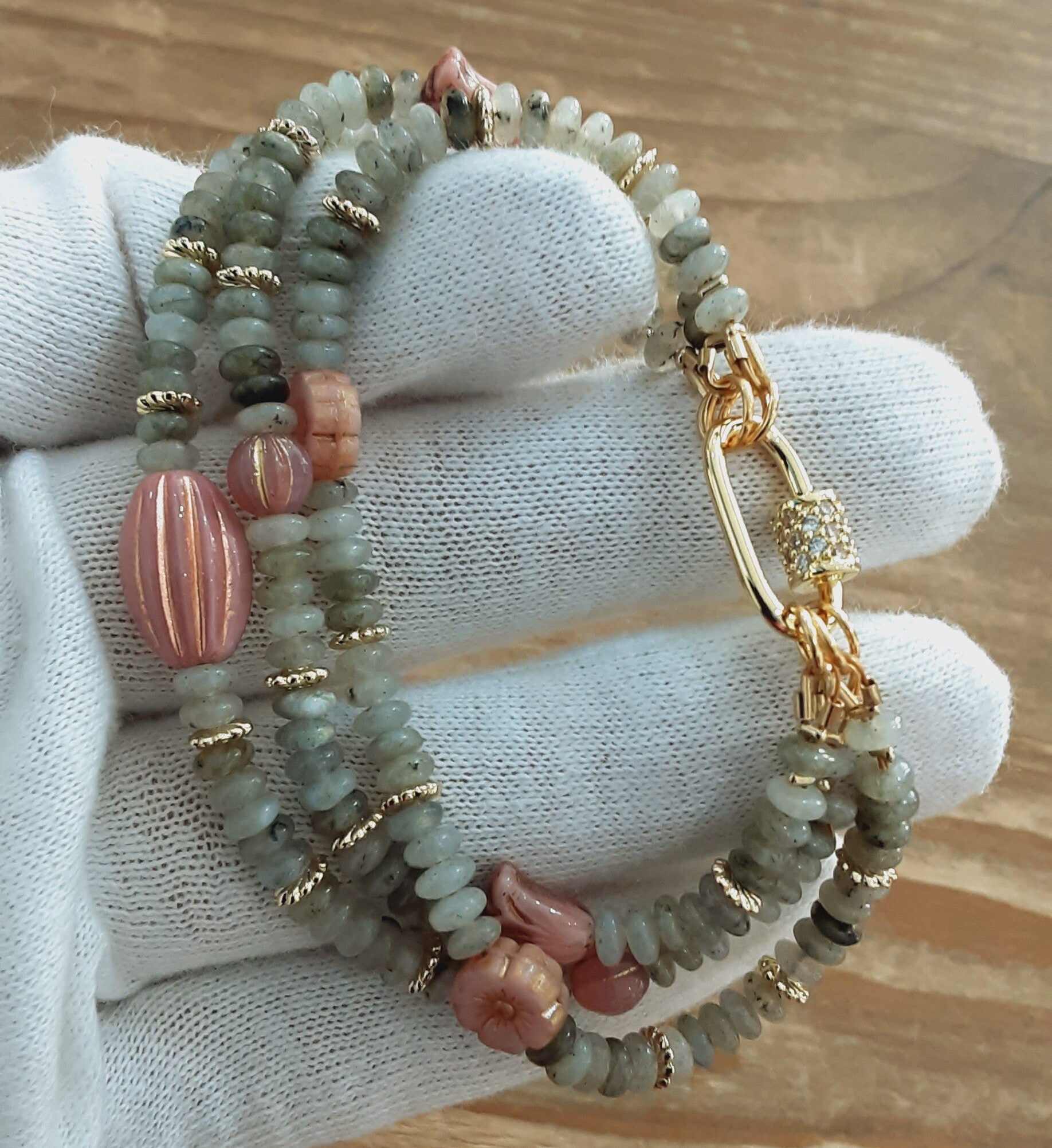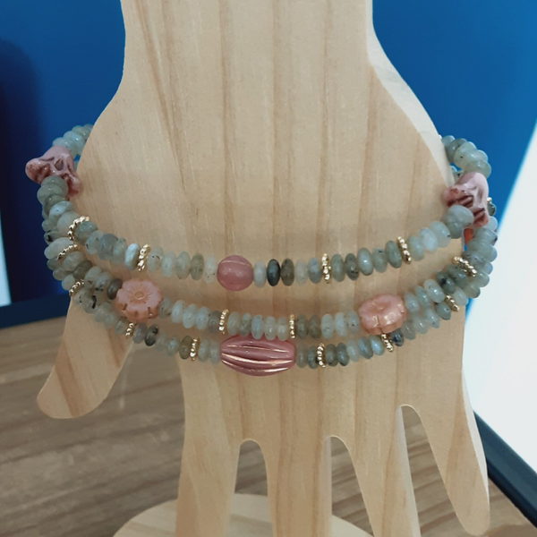 Création artisanale pour ce superbe bracelet 3 rangs en perles de Labradorite naturelle (disques de +/- 4 mm) et perles de Verre Tchèque rose (perles polies au feu artisanalement), fermoir vis en Laiton doré.