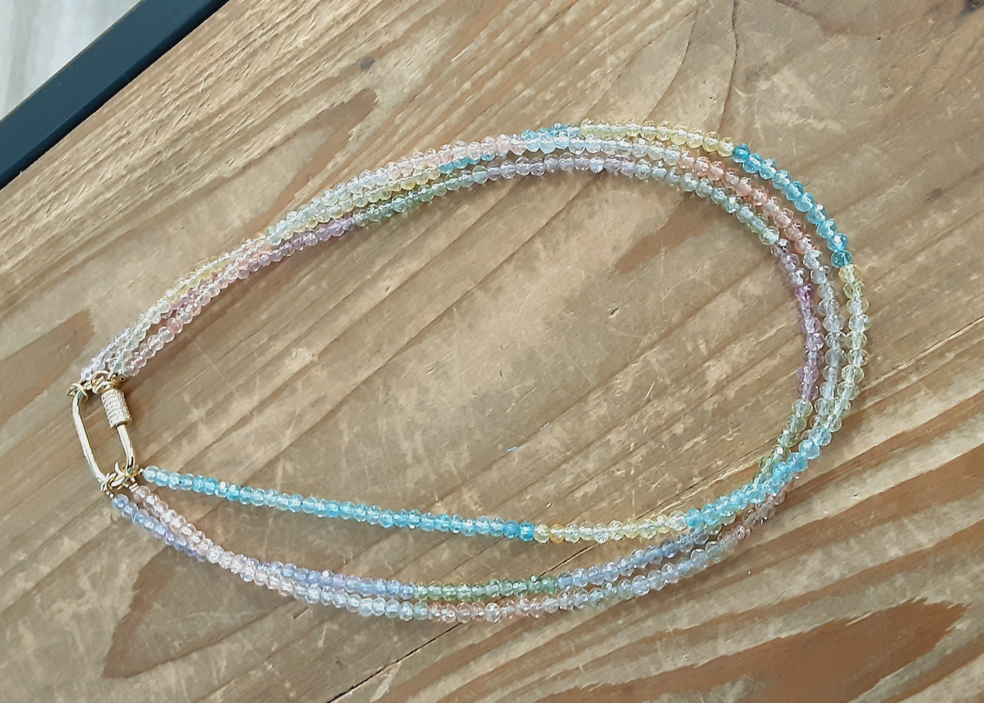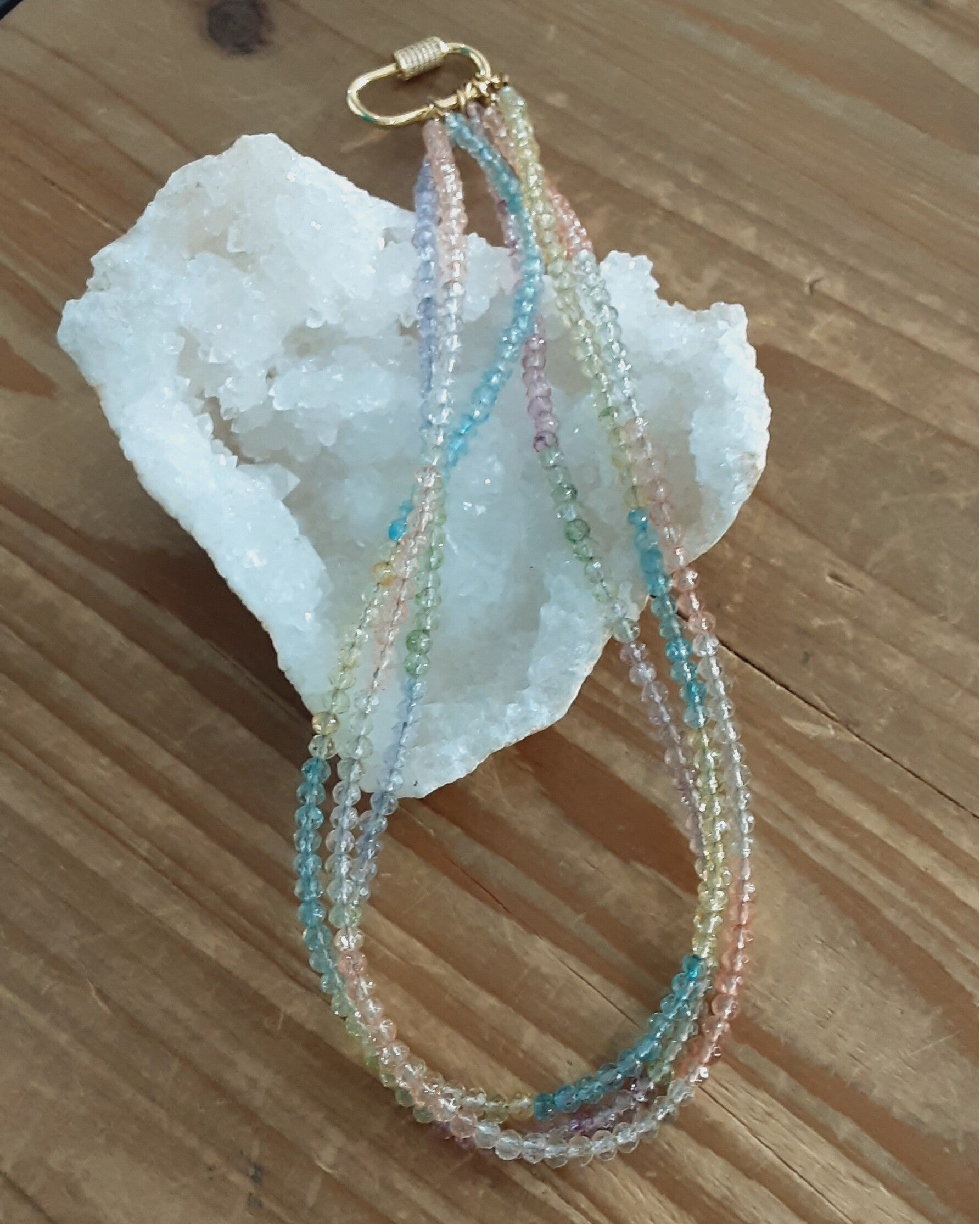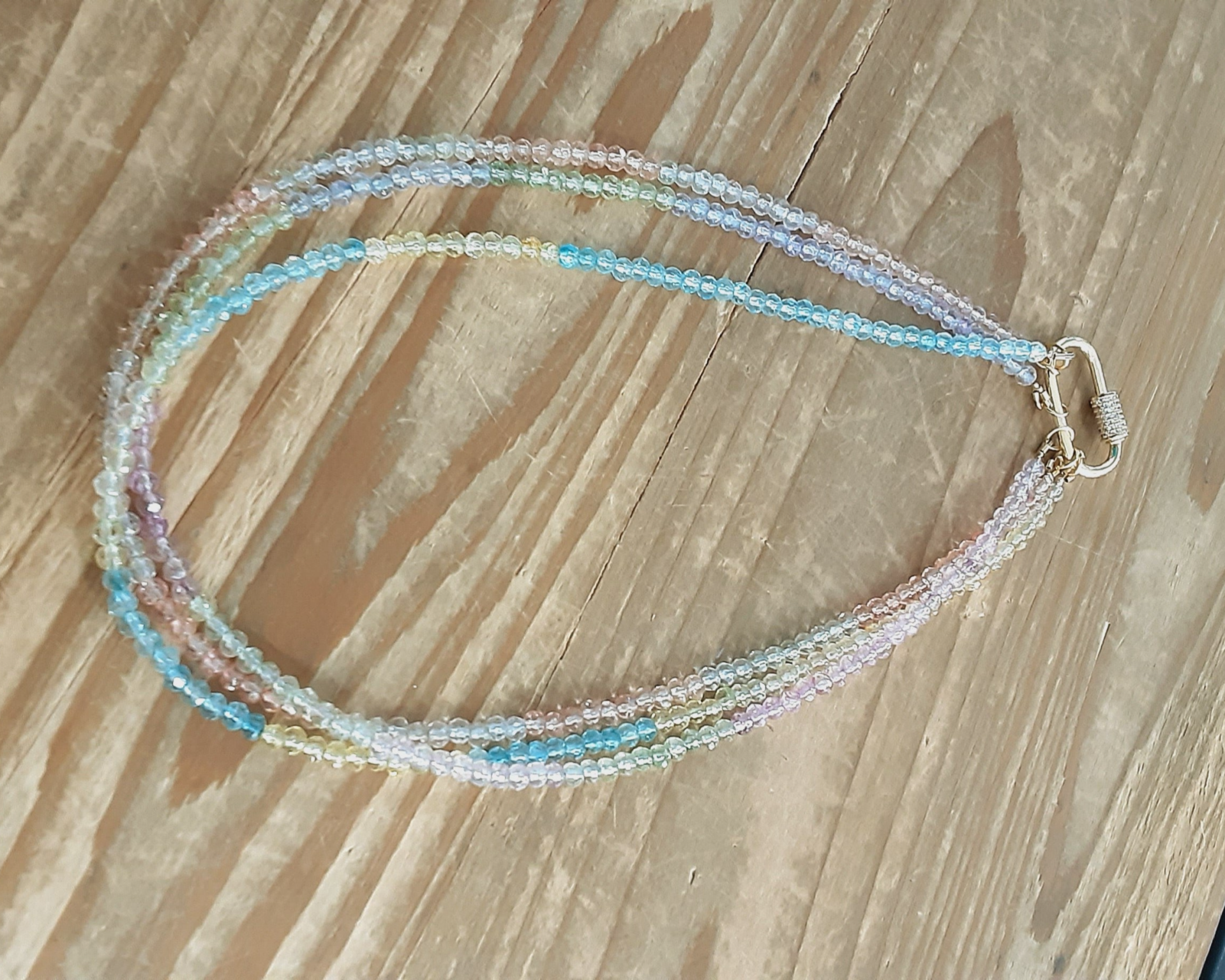 Création artisanale d’un collier ras de cou de 3 rangs en perles de verre multicolores nuances pastel, très féminin et très lumineux.