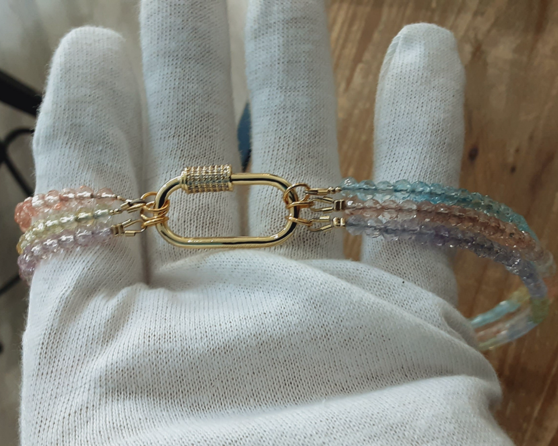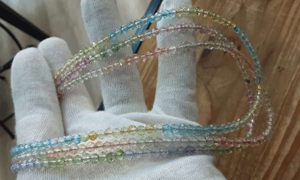 Les perles sont taillées à facettes de diamètre environ 4 mm type rondelles. Finitions et fermoir à vis en Laiton doré.